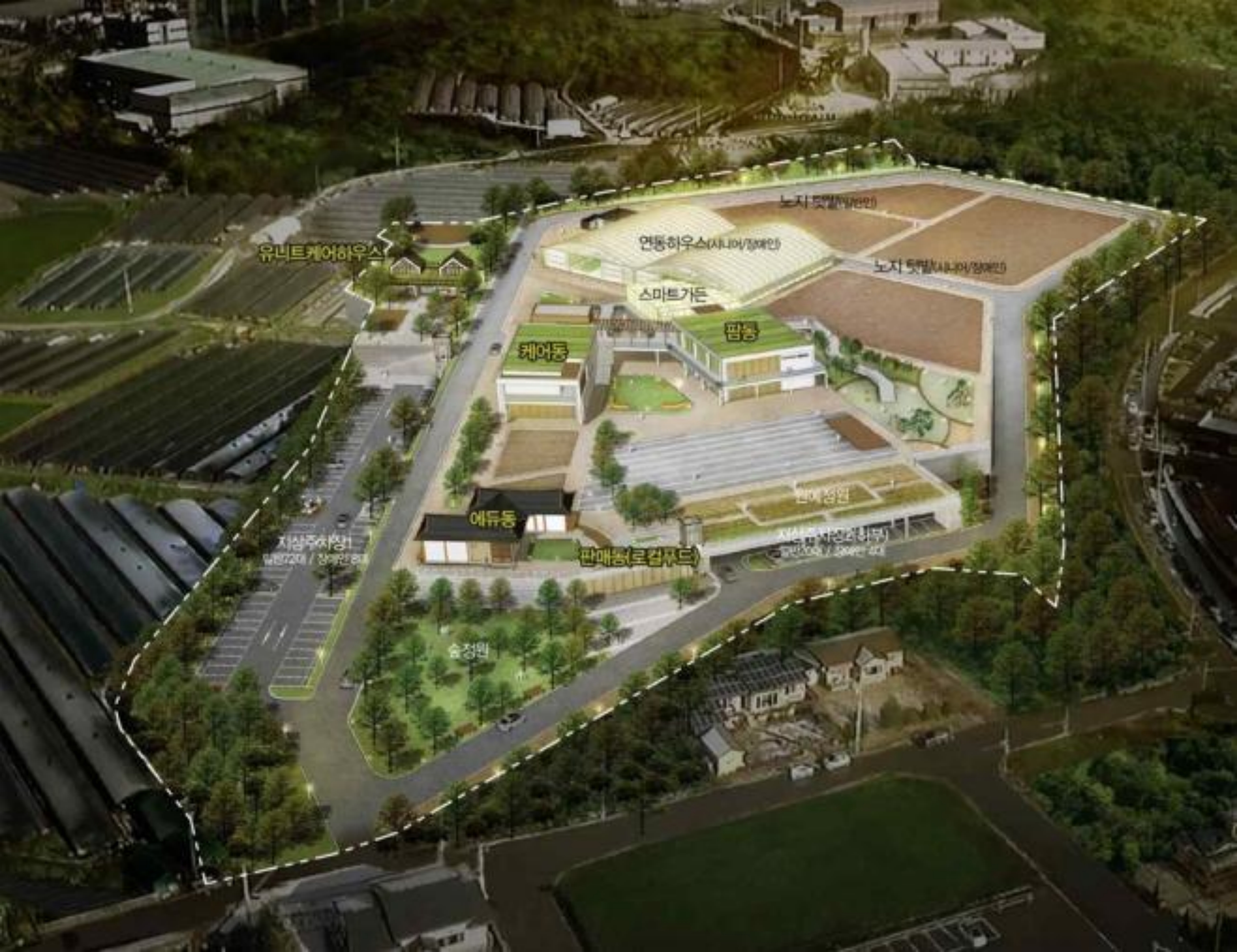 주요 시설로 ‣건강지원실, 교육실, 스마트가든, 커뮤니티센터, 농업교육작업장 등을 갖춘 케어팜복합센터, ‣사회적 약자의 자립을 돕기 위한 한옥형 교육공간인 에듀동, ‣자체 생산된 농산물 판매 공간인 로컬푸드판매점, ‣사회적 약자 단기 거주시설인 유니트케어하우스를 건립하고, 외부공간에는 스마트 연동 하우스, 노지 텃밭, 정원, 플레이그라운드 등을 조성한다.