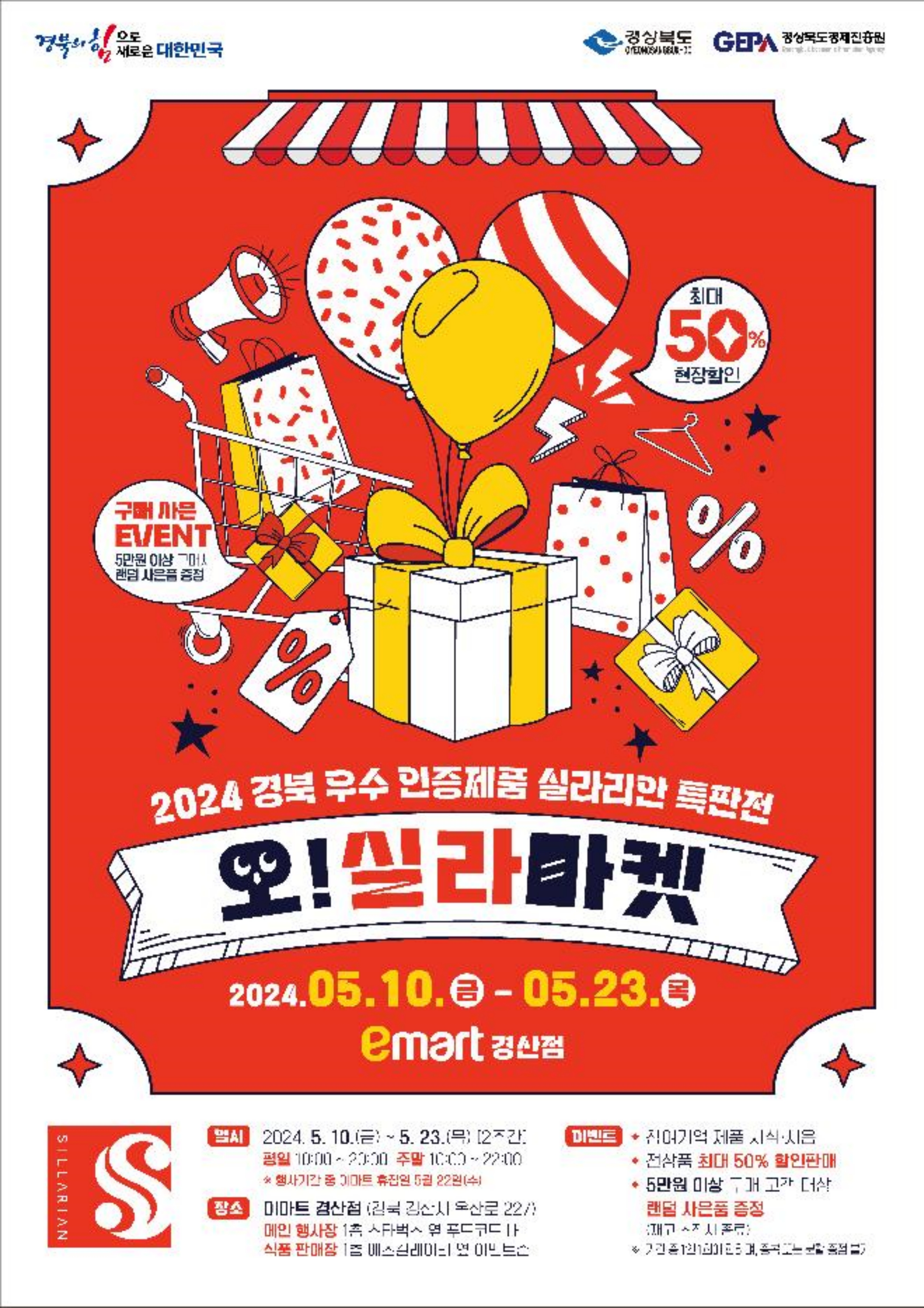 경상북도는 실라리안 제품 홍보와 소비 촉진을 위해 10일부터 23일까지(약 2주간) 이마트 경산점에서 2024 경북 우수 인증 제품 실라리안 특판전을 개최한다.