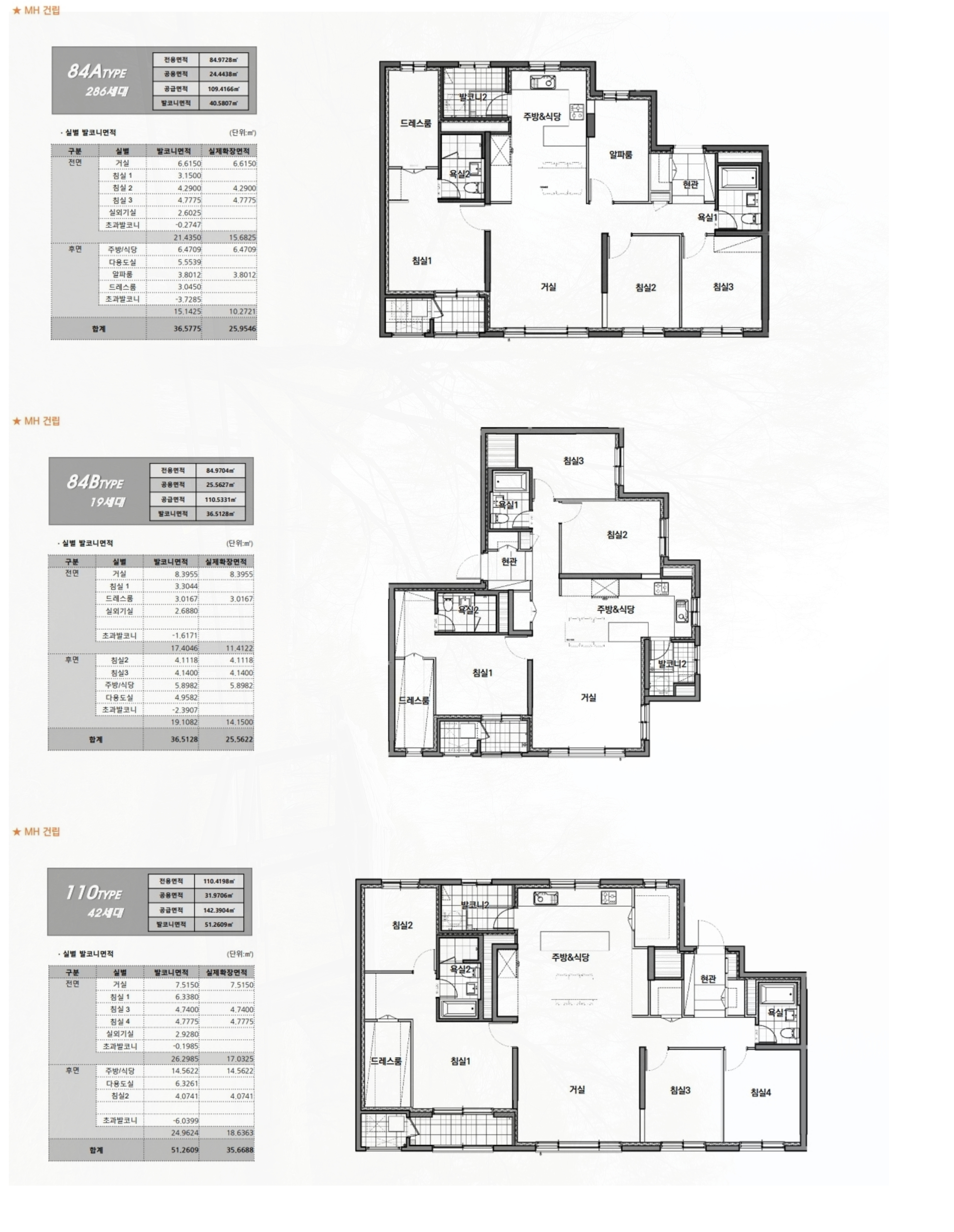 곤지암역 아이파크 아파트는 전용 84A, 84B, 110 이렇게 두가지 면적 세 가지 타입으로 구성되어 있습니다.