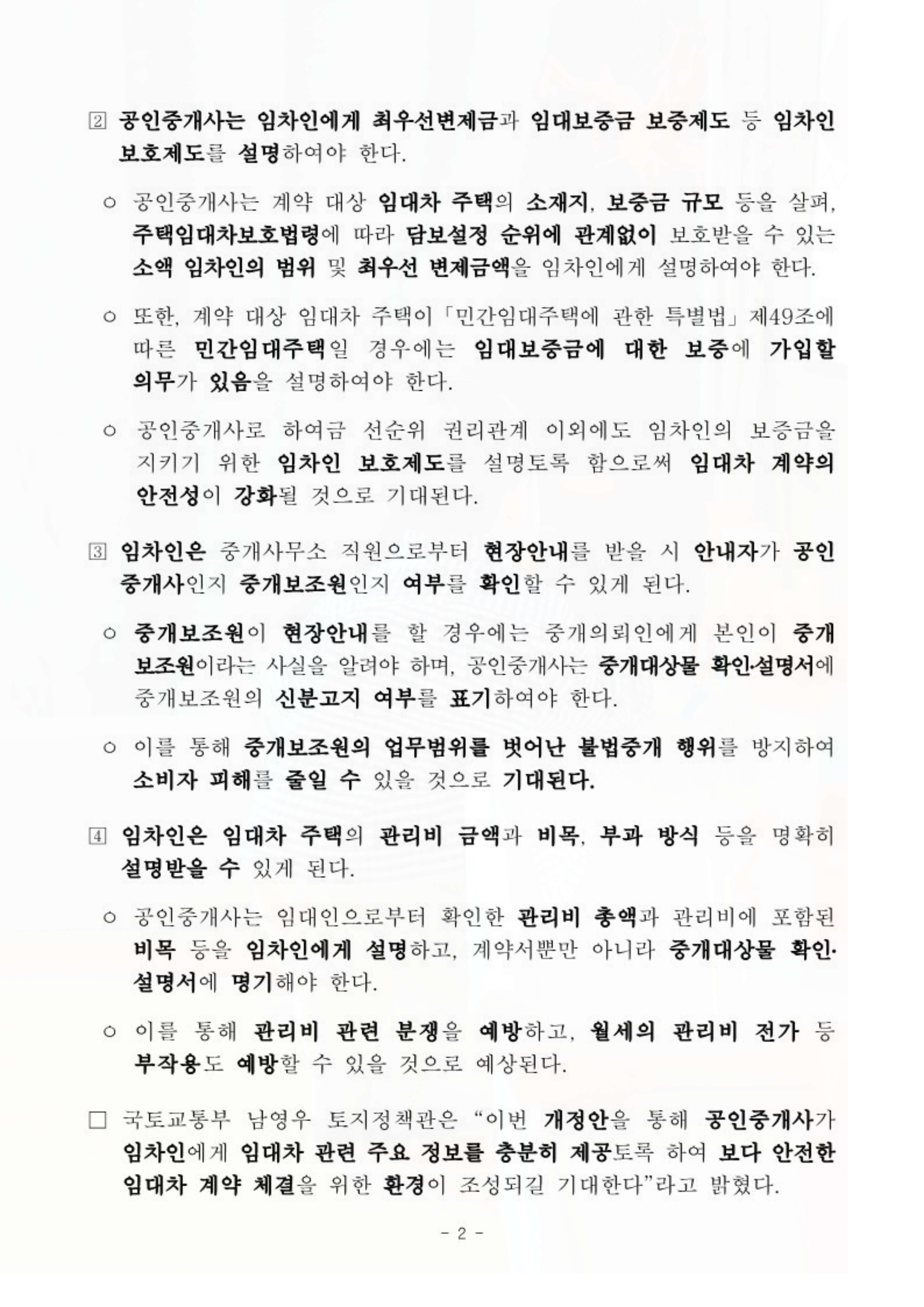 2. 임차인에게 최우선변제금과 임대보증금 보증 제도 등 보호제도에 대한 설명을 하여야 한다.