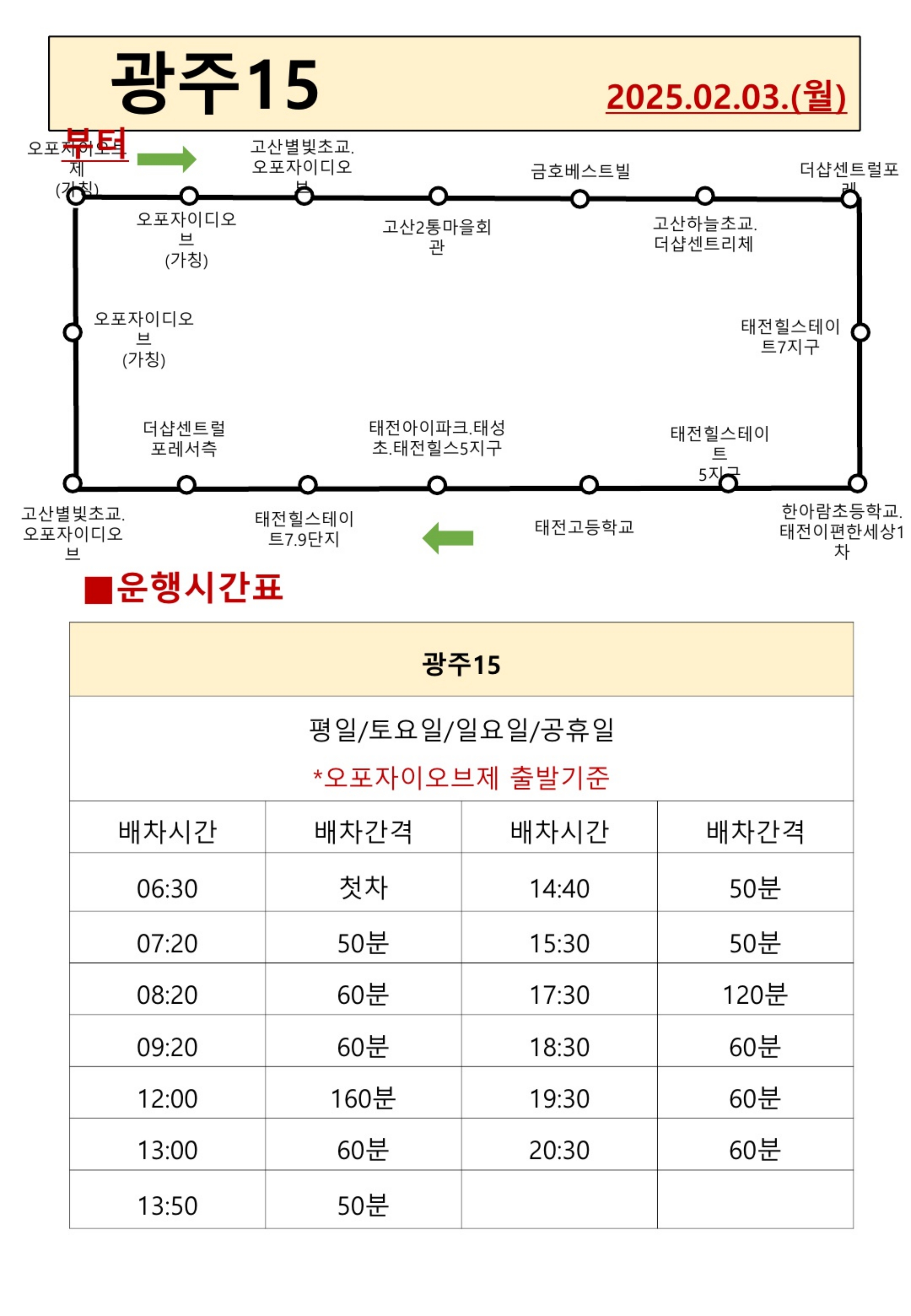광주 15번 노선은 오포자이오브제를 기점으로 태전·고산지역을 순환하는 노선으로 주민 생활권 확대와 환승 편의를 제공하며 학생들의 통학 환경 개선에 기여할 것으로 기대된다.