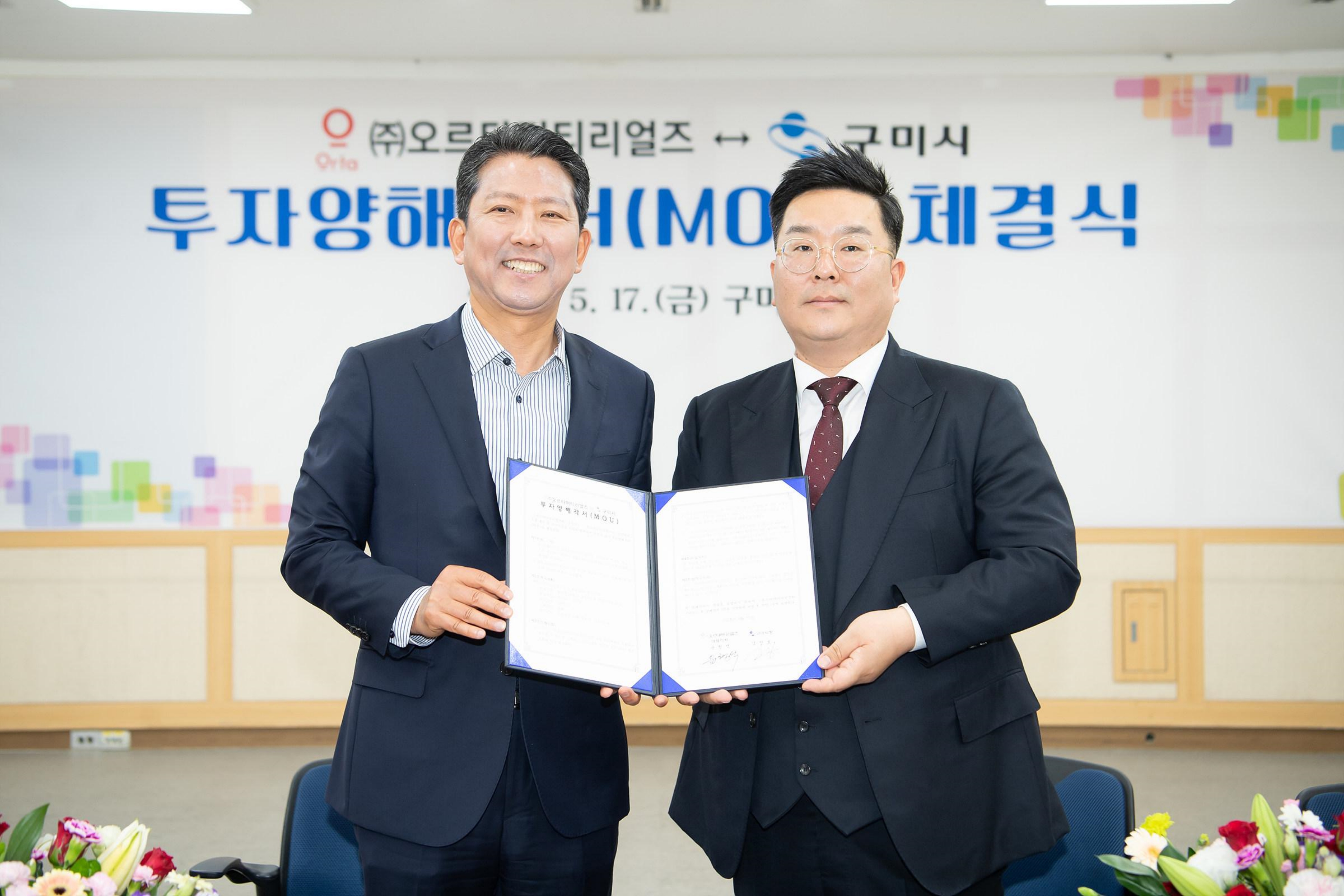 구미시는 17일 시청에서 ㈜오르타머티리얼즈 윤형석 대표, 김장호 구미시장, 안주찬 시의회 의장, 경제 단체장들이 참석한 가운데 ㈜오르타머티리얼즈와 투자양해각서(MOU)를 체결했다.