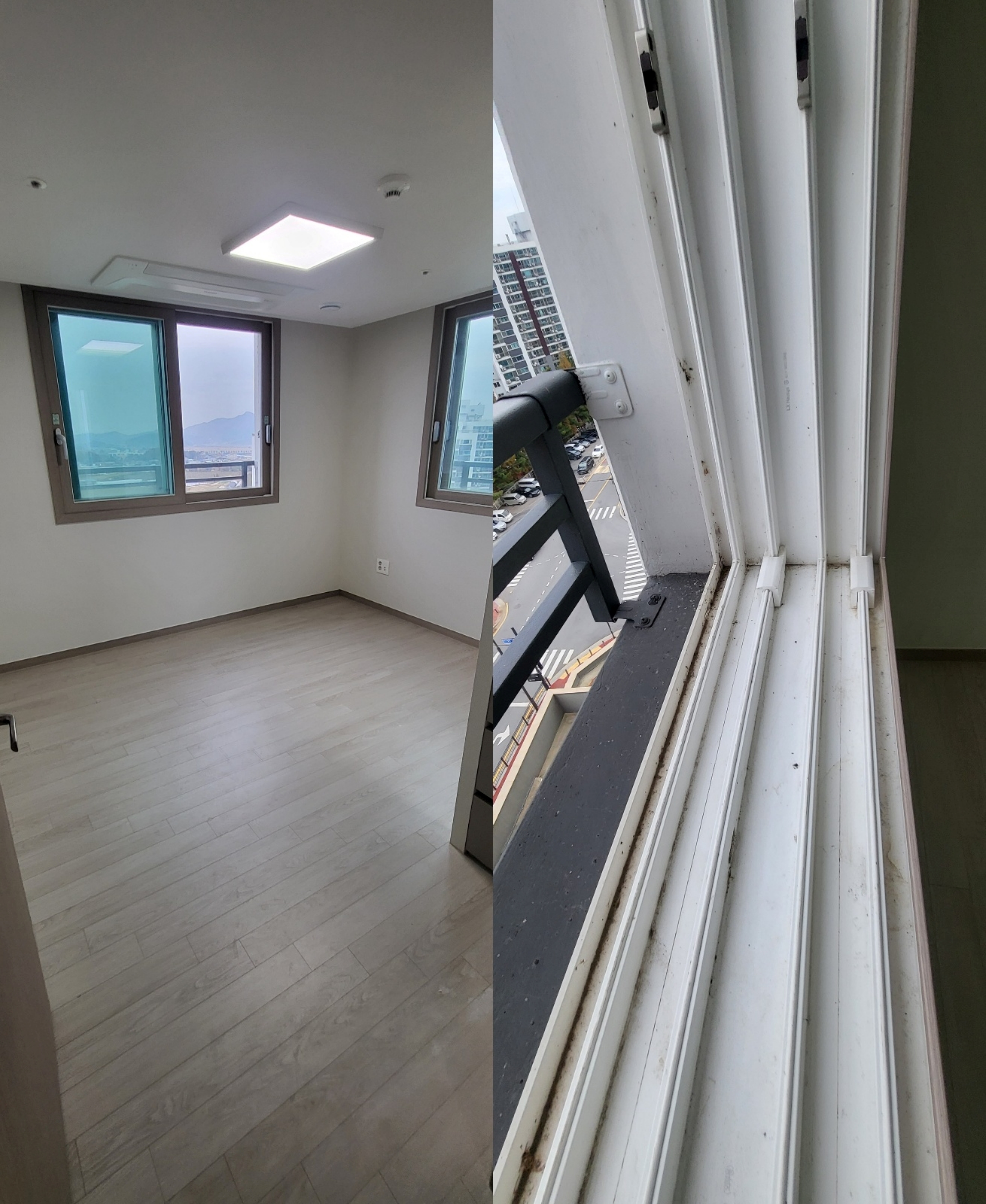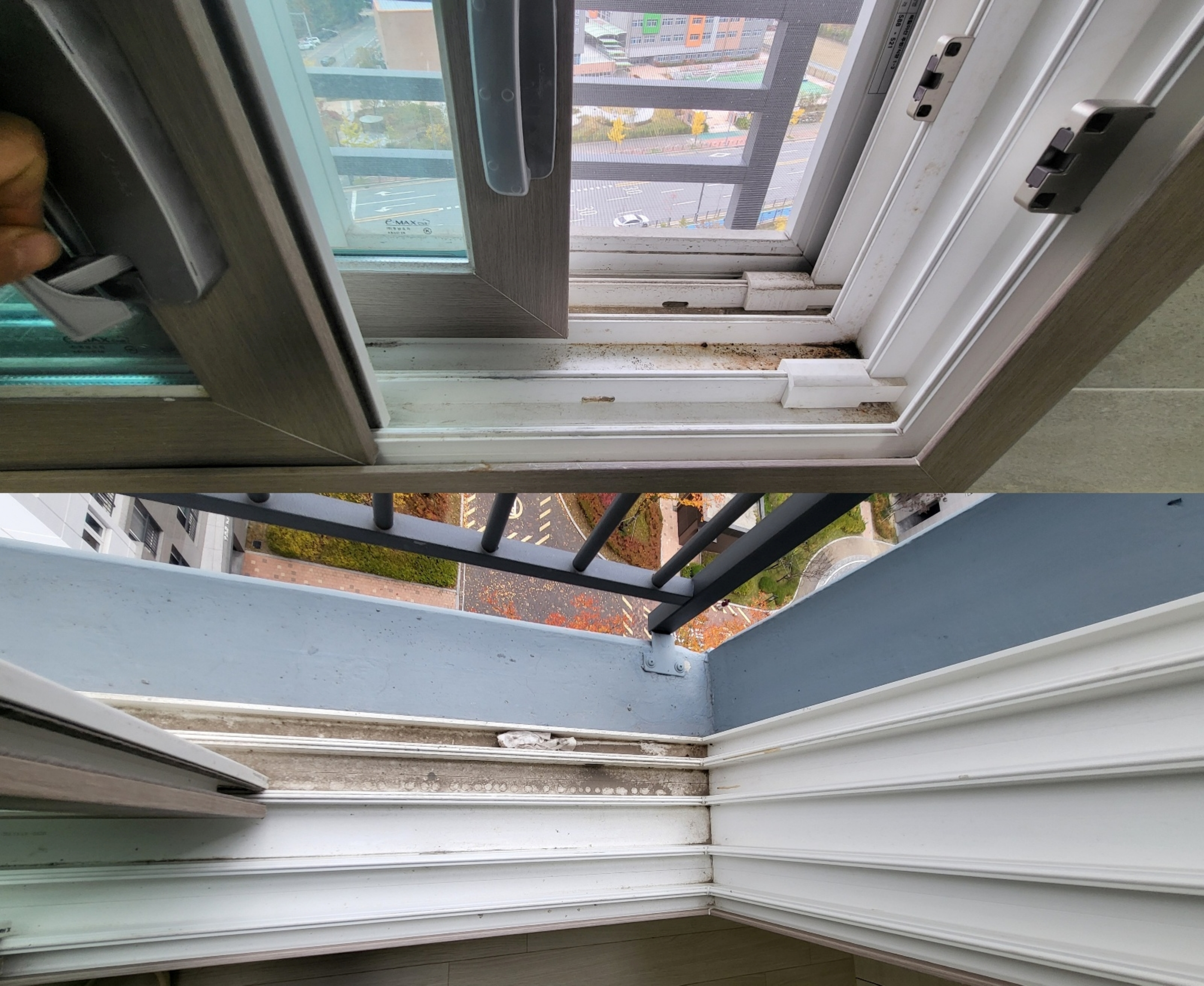 공사 분진이 남긴 미세한 흔적, 눈에 잘 띄지 않는 창틀 안쪽의 오염