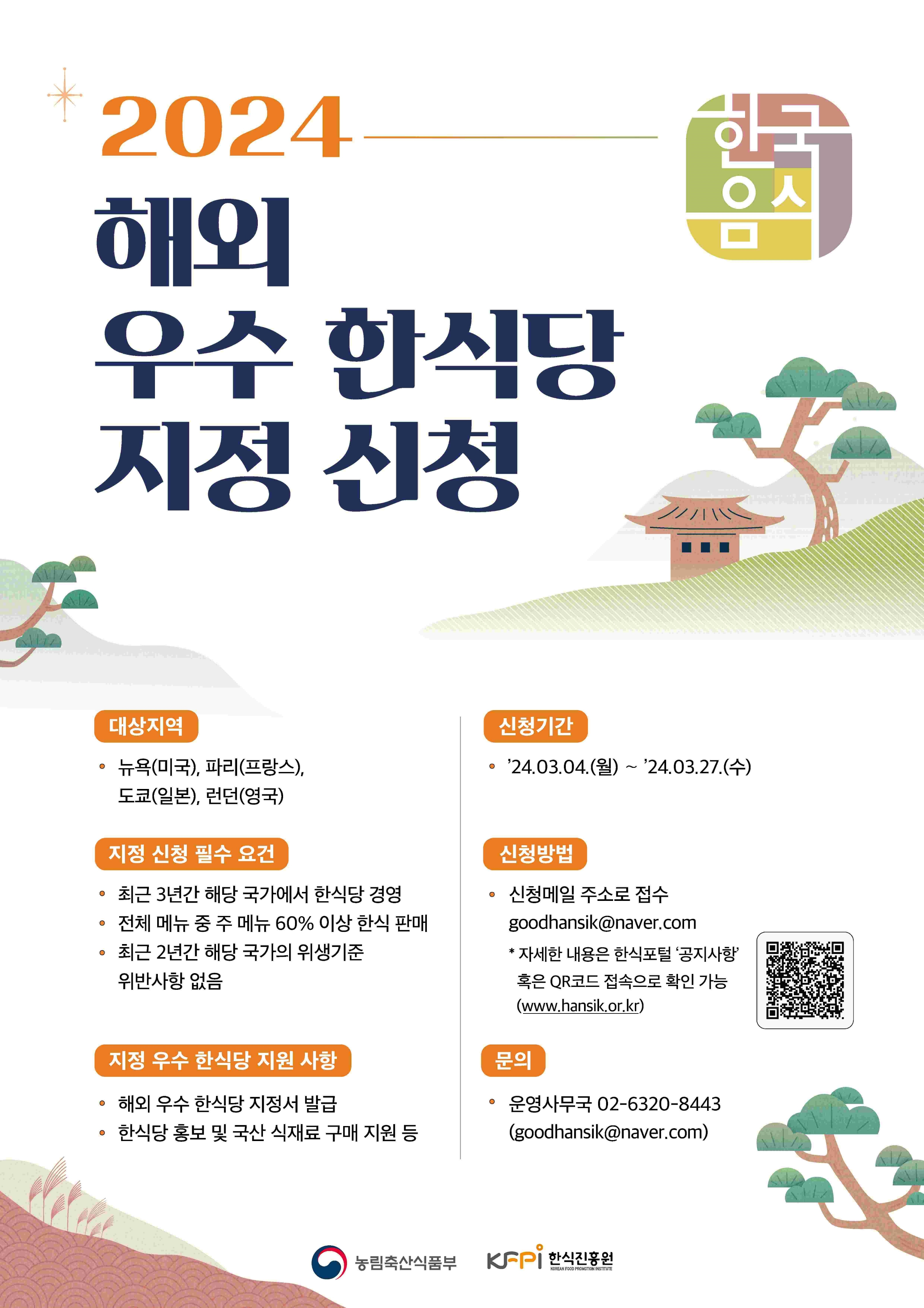 농림축산식품부와 한식진흥원은 3월 4일부터 27일까지 해외에 위치한 한식당을 대상으로 2024년 해외 우수 한식당 지정 신청을 받는다.