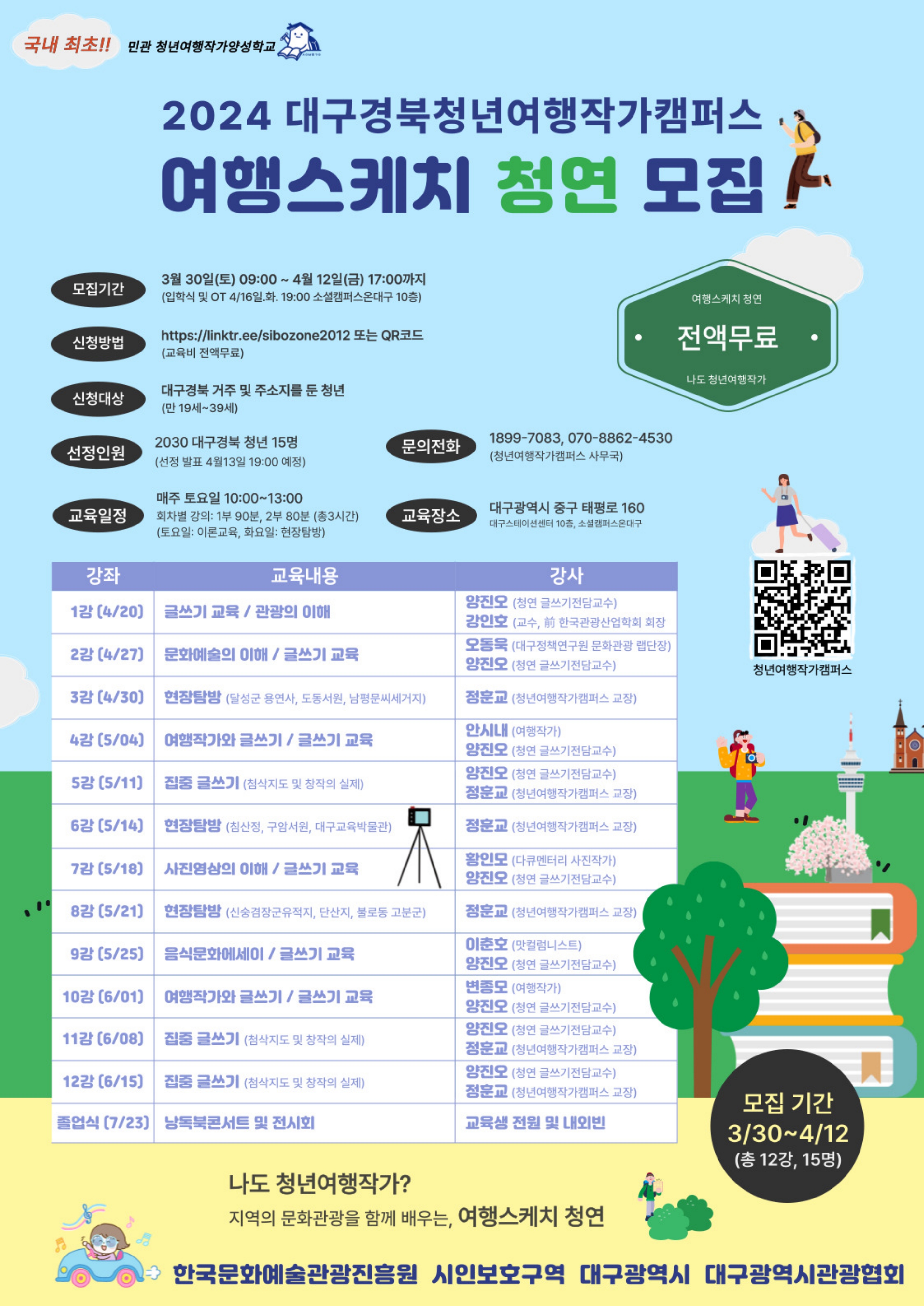 대구광역시는 대구광역시관광협회, 한국문화예술관광진흥원, 시인보호구역과 함께 지역 청년을 대상으로 관광 미래인재 양성을 위한 2024 제4기 대구·경북 청년여행작가캠퍼스, 여행스케치 청연* 교육을 실시한다.