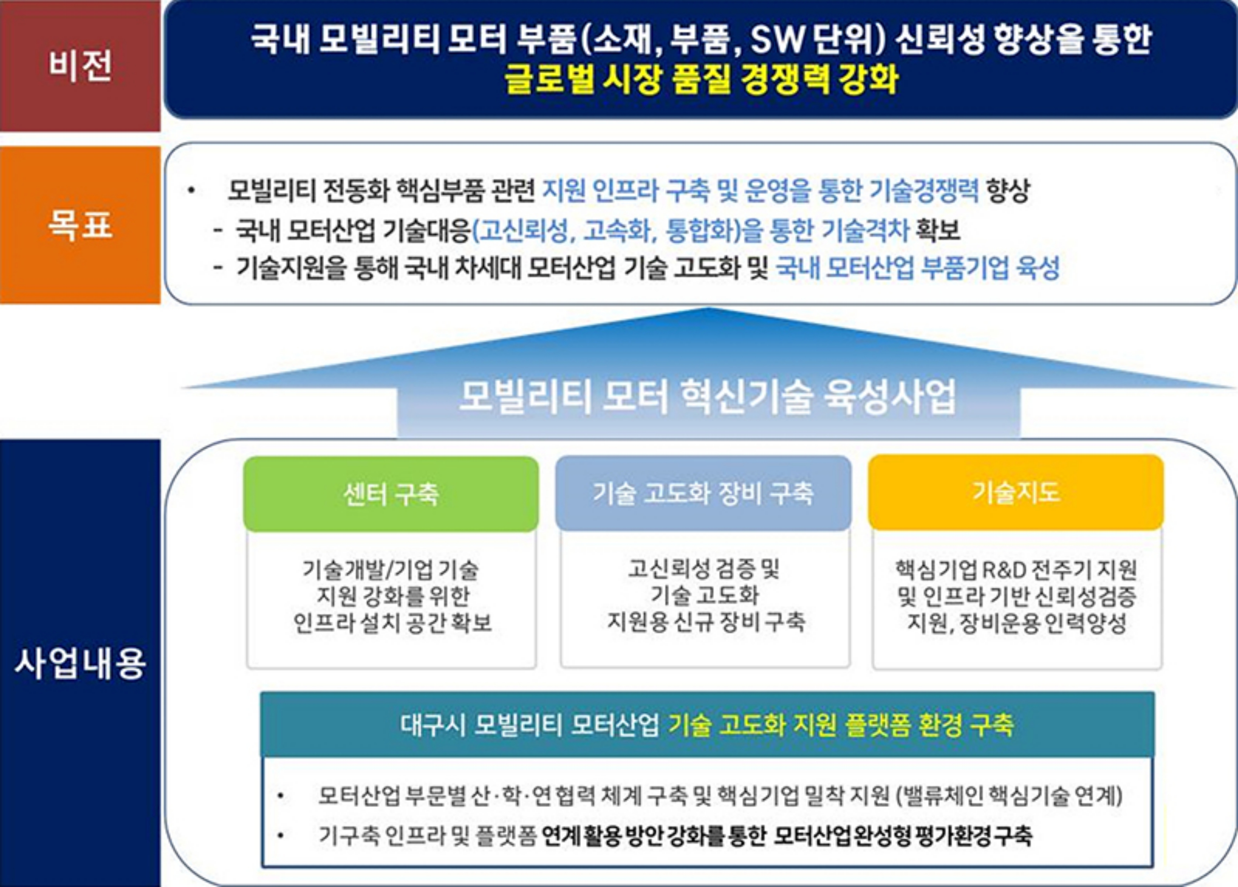 모빌리티 혁신기술 육성사업은 한국자동차연구원에서 주관하여 모빌리티 모터 혁신성장 지원 센터 구축, 장비 구축 등 관련 인프라 기반을 구축하고, 대구경북과학기술원, 계명대학교, 경북대학교가 참여하여 모빌리티 모터산업 기술지원 협력체계를 구축할 계획이다.