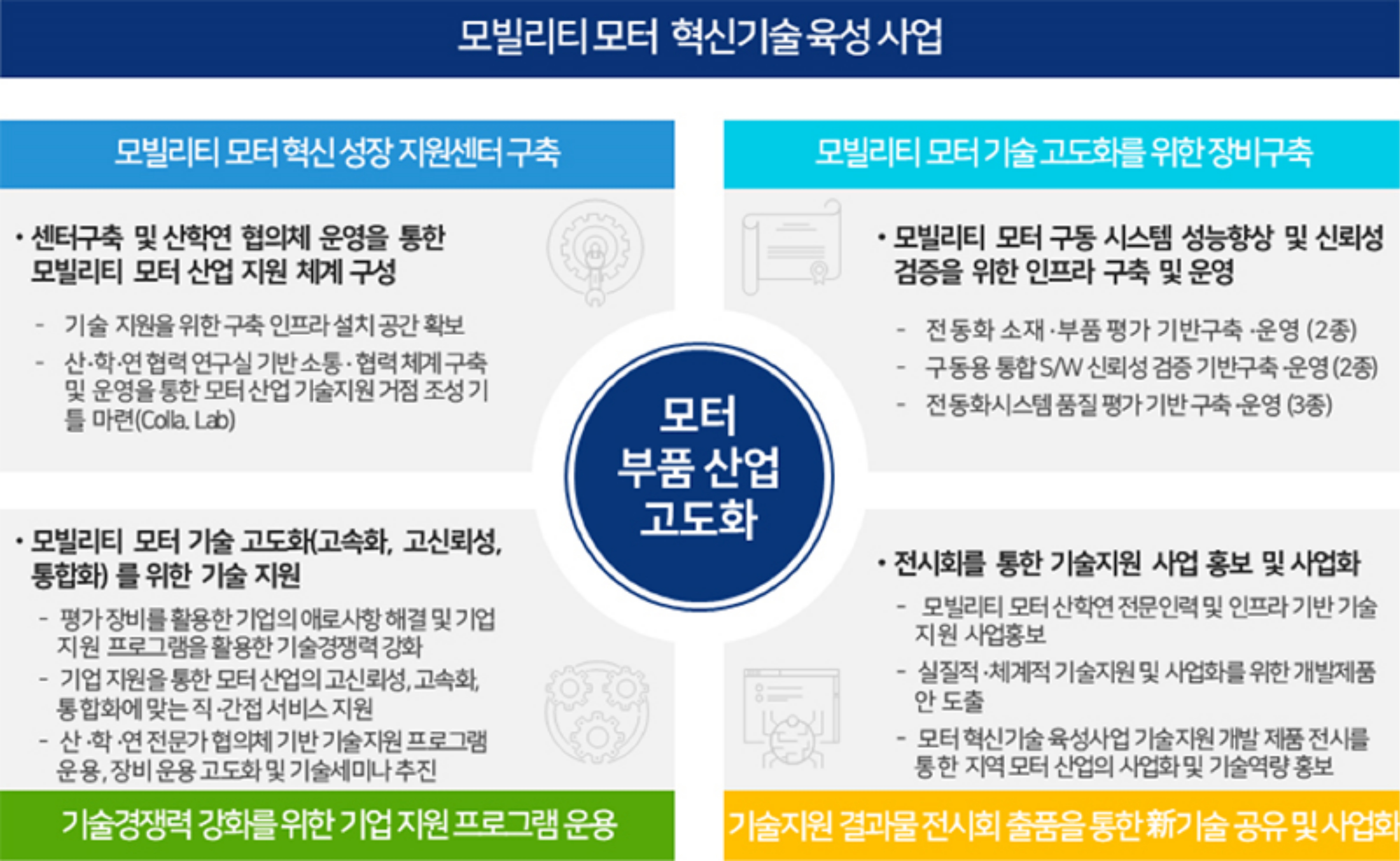 이번에 선정된 모빌리티 모터 혁신기술 육성사업은 내연기관 자동차 부품산업에서 미래차 산업으로의 전환을 희망하는 자동차 부품 기업을 대상으로 모빌리티 모터 소재·부품 및 S/W 관련 차세대 모터산업 기술 고도화 및 차량 전동화 부품 개발에 필요한 인프라를 구축해, 미래 모빌리티 관련 부품산업의 시험·검증 지원과 글로벌 시장 진출을 대비하여 품질경쟁력 강화를 위한 기술지원이 주된 사업이다.