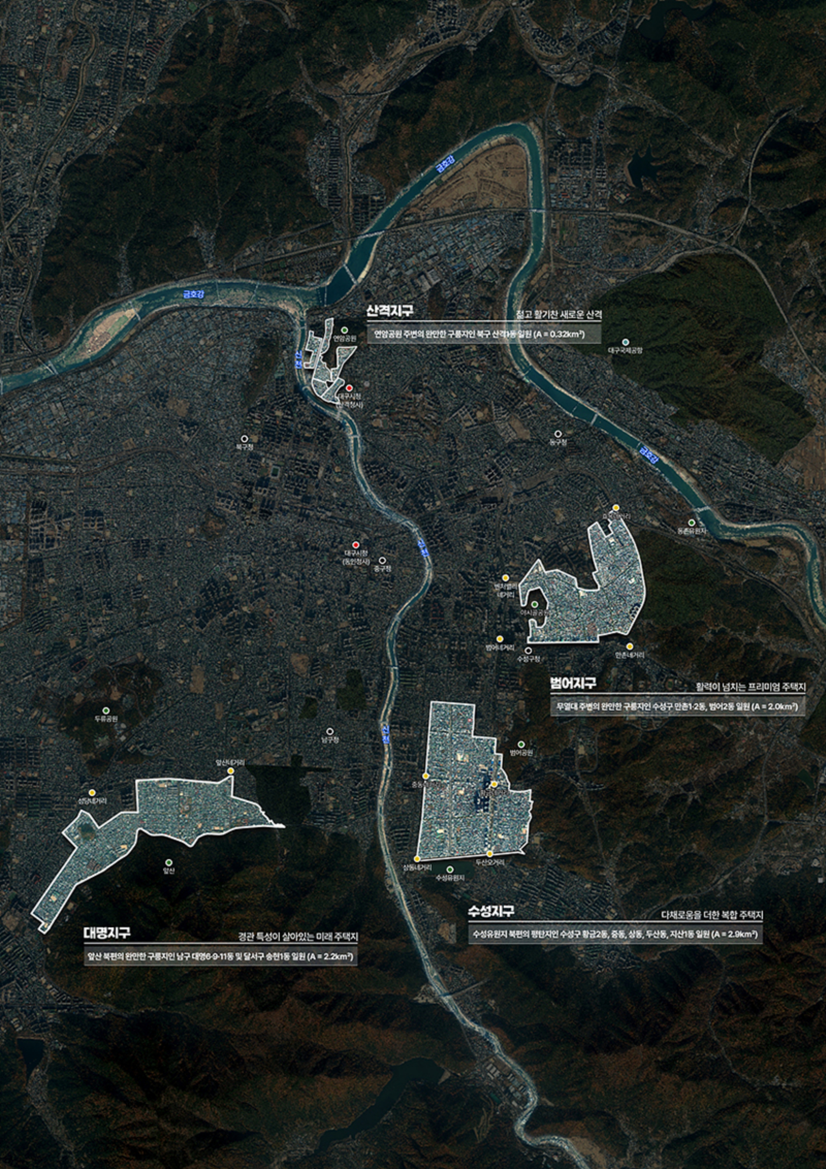 * 대규모 노후 주택지(4개 지구 7.42㎢) : 범어(2.0㎢)/수성(2.9㎢)/대명(2.2㎢)/산격(0.32㎢)
