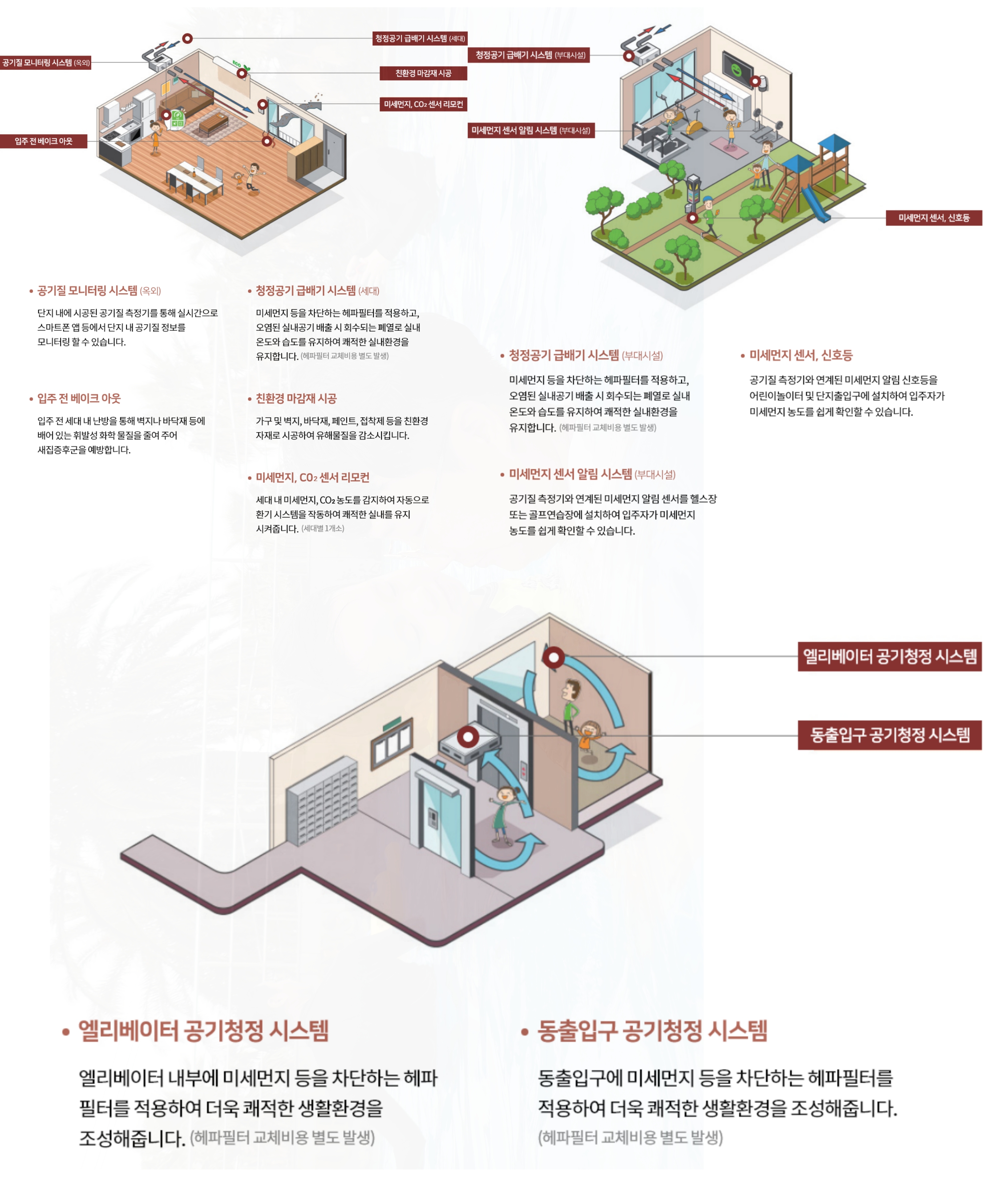 각 세대에는 청정공기 급배기 시스템이 설치되어 미세먼지로부터 안전한 환경을 제공합니다.