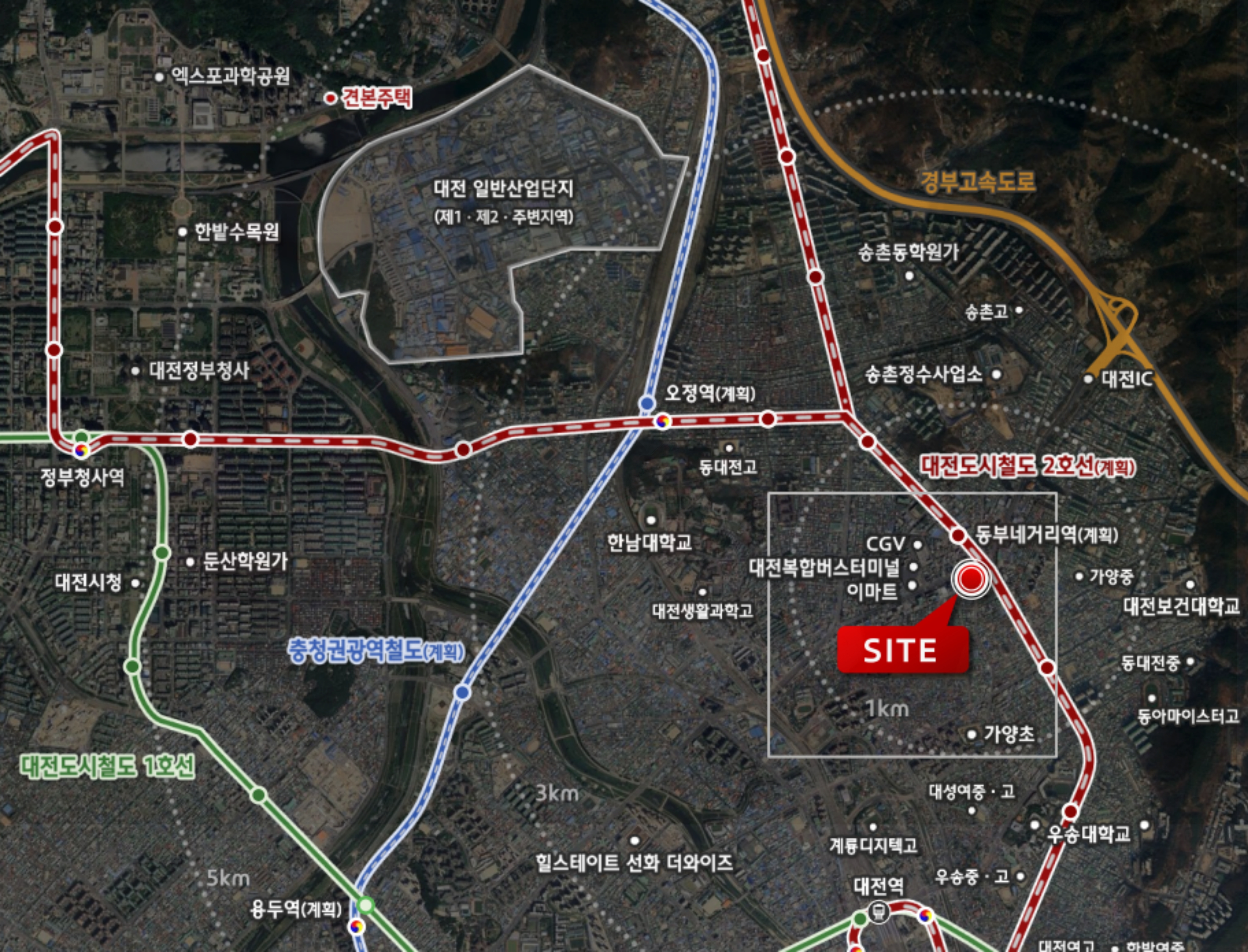 이곳은 대전 복합터미널과 매우 가깝고, 도시철도2호선 신설 역사 건립 예정으로 더욱더 교통 편익이 예상되는 주거지역입니다.