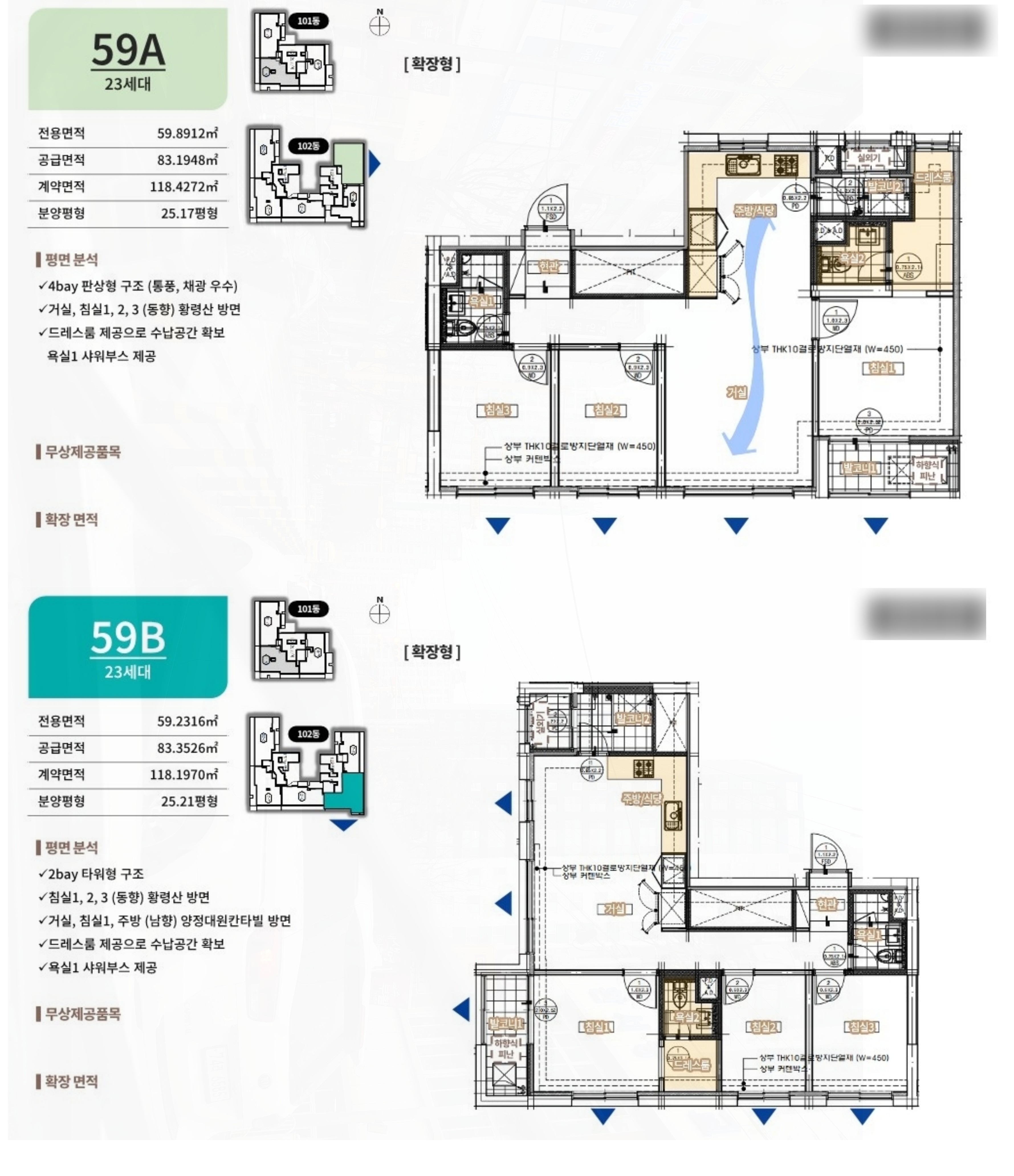평면 구조는 유형별로 4베이 판상형, 2면 개방 탑상형 등 다양한 구조를 선보이고 있기 때문에 취향에 맞게 선택할 수 있습니다.