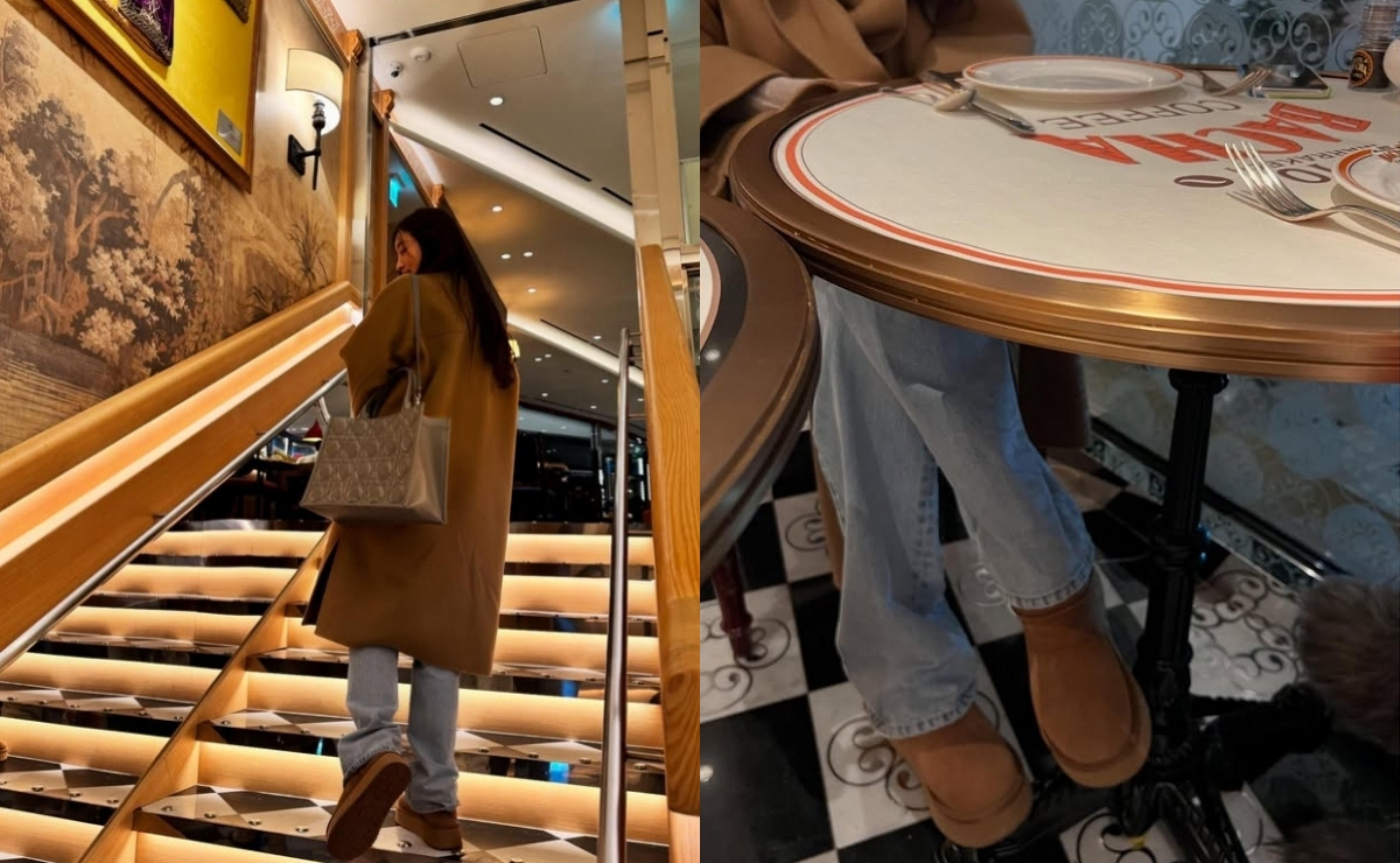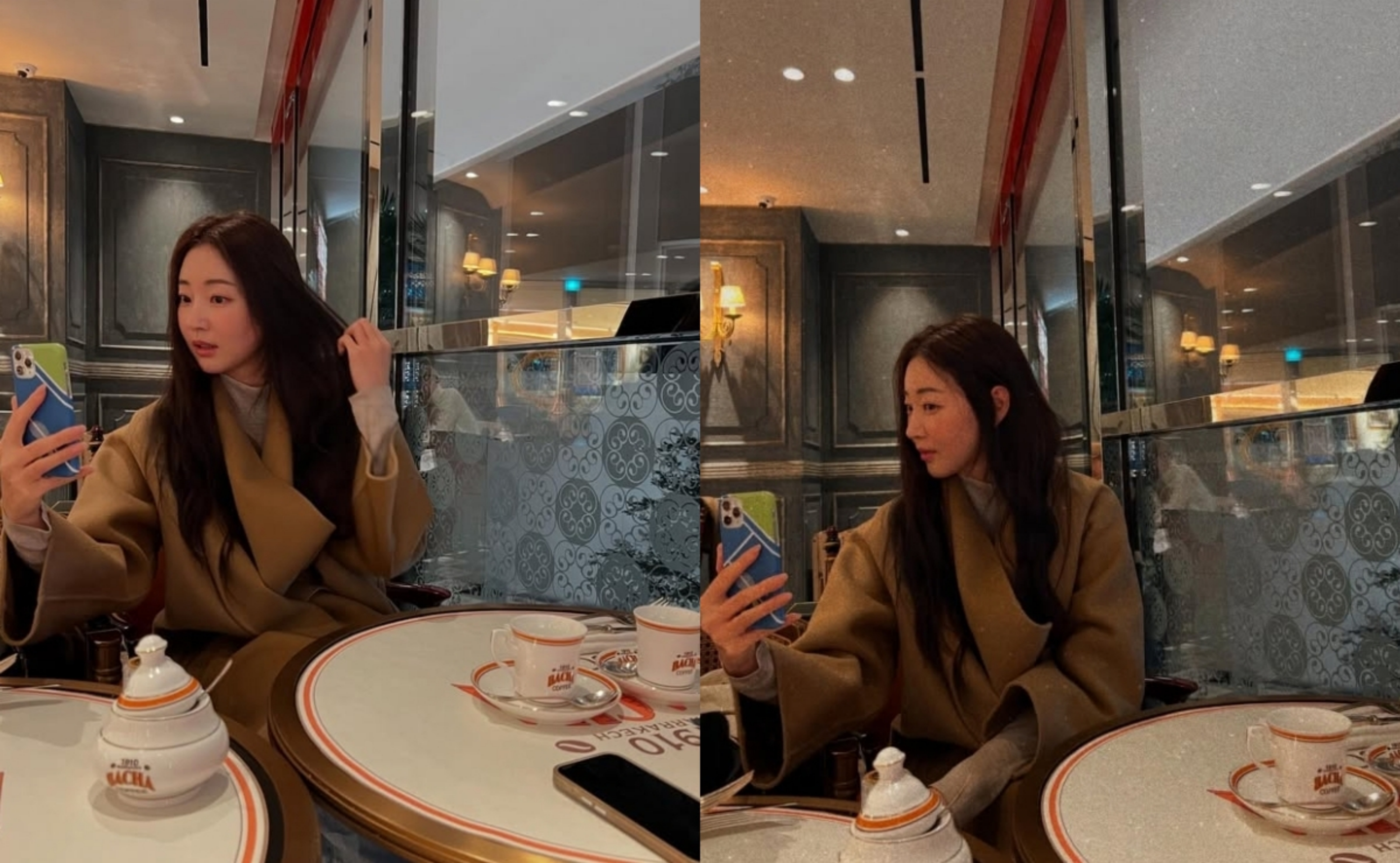 카멜 색상의 허벅지까지 감싸는 롱코트, 어그부츠에 청바지, 그레이 컬러의 목폴라까지 따듯함과 겨울이라는 계절을 잘 표현한 소소한 김사랑의 패션이 너무도 찰떡이네요.
