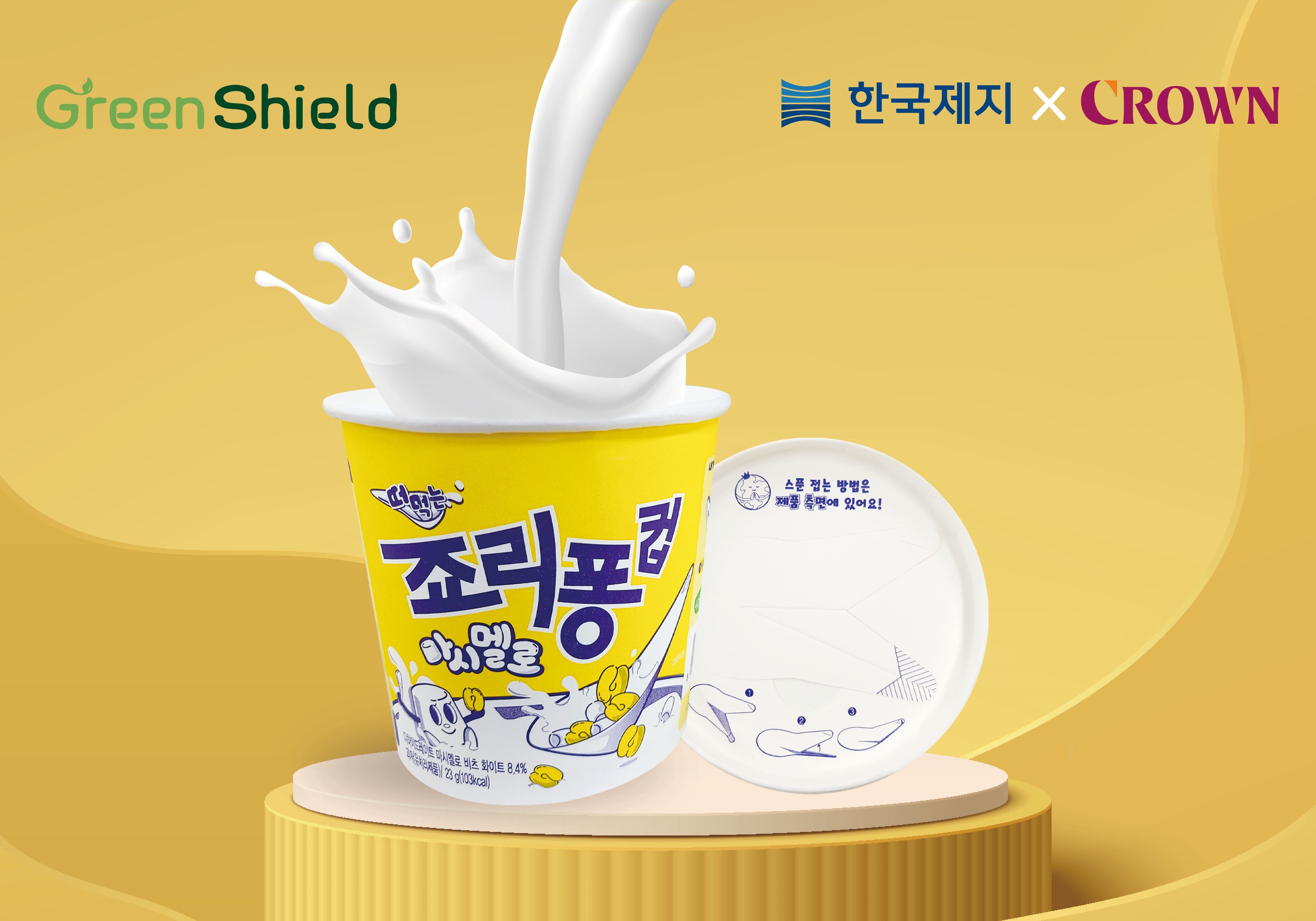 한국제지는 국내 대표 제과 기업 크라운제과와 ESG 협력을 통해 떠먹는 죠리퐁마시멜로 컵 용기와 스푼을 친환경 포장재 그린실드(Green Shield)로 제작했다고 6일 밝혔다.