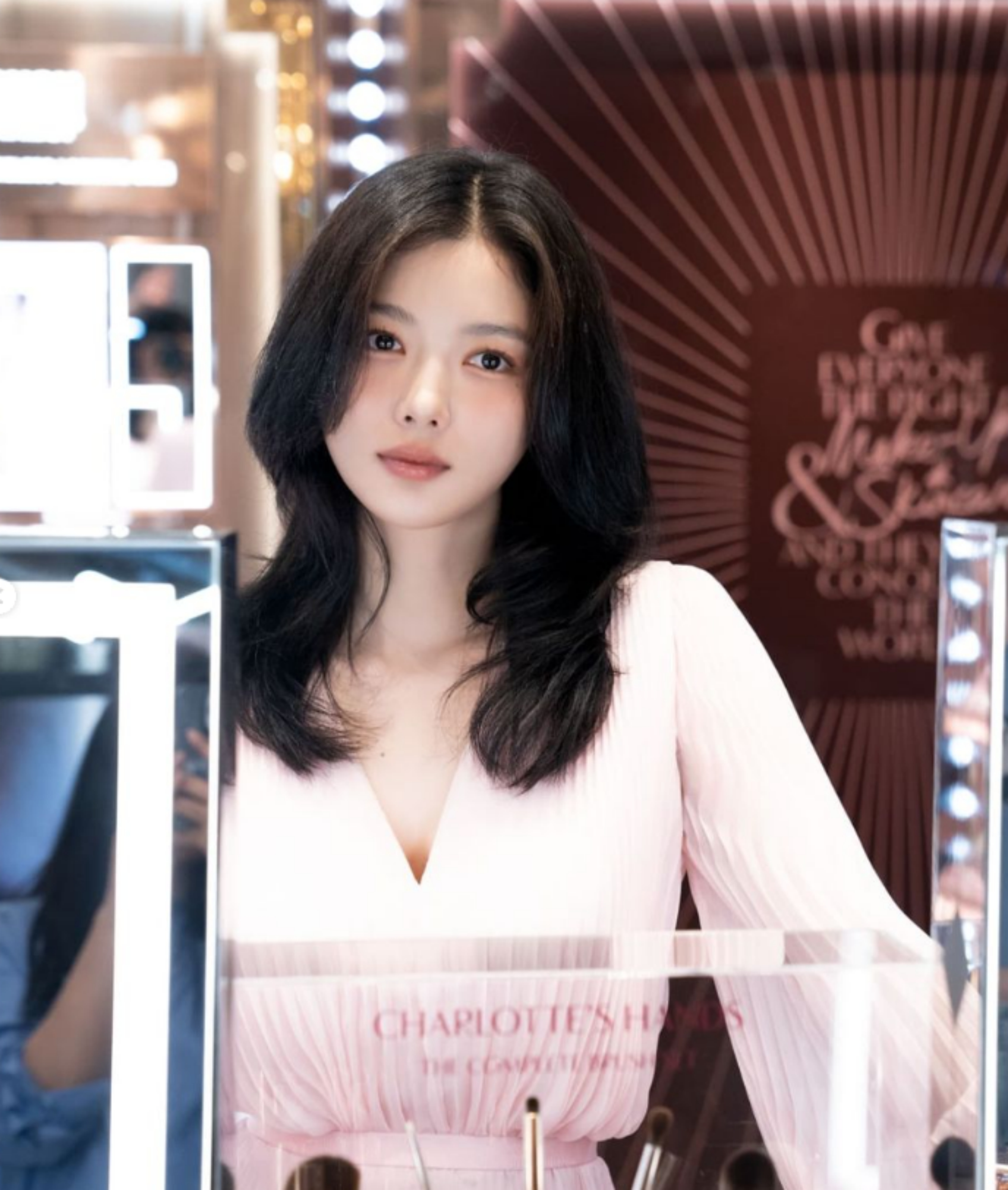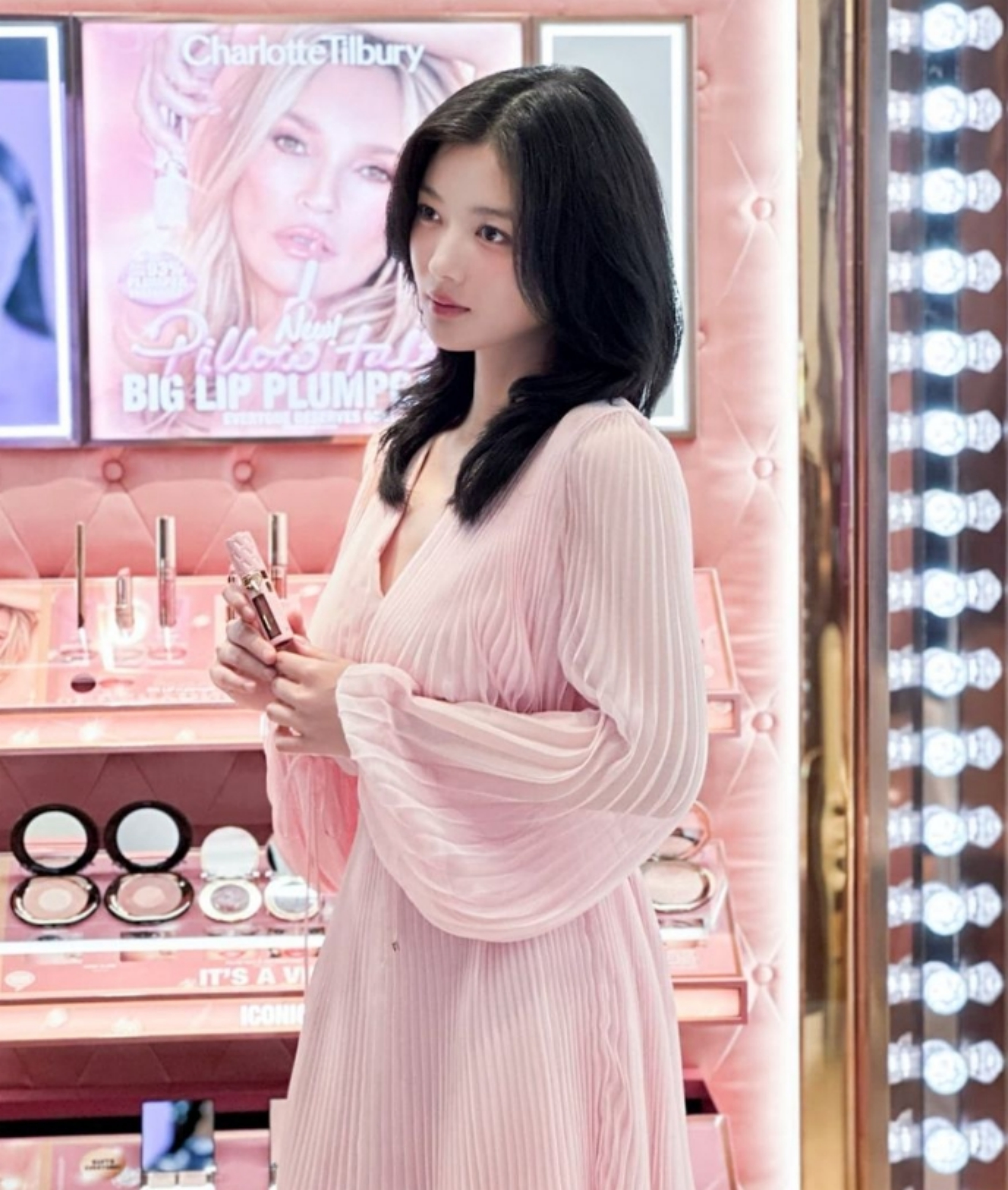 핑크빛 상큼함이 더해진 김유정의 코디는 시원한 재질의 쉬폰 , 플리츠 원피스 패션이랍니다.