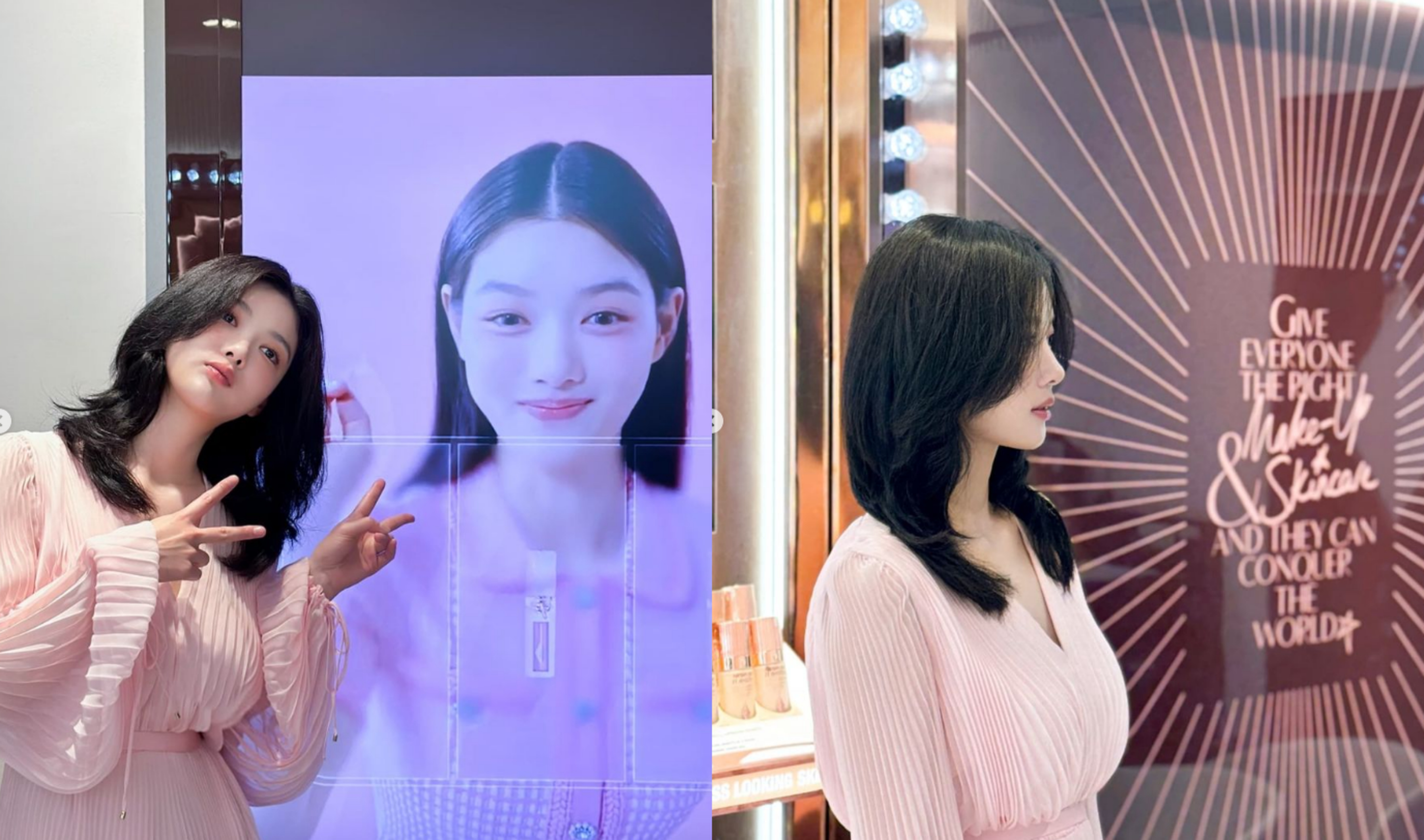 핑크빛 상큼함이 더해진 김유정의 코디는 시원한 재질의 쉬폰 , 플리츠 원피스 패션이랍니다.