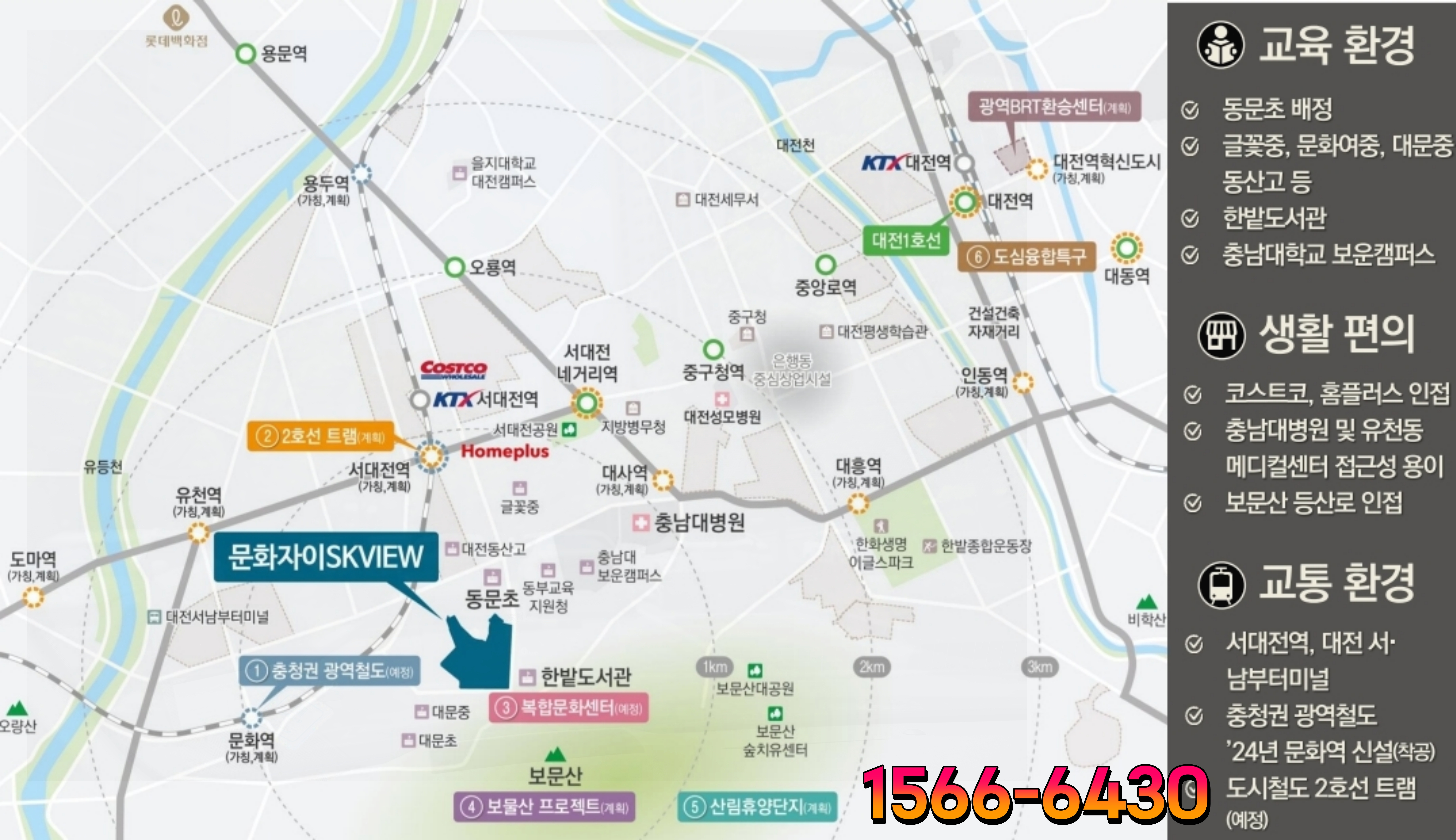 교통 접근성 또한 뛰어납니다. 충청권 광역철도 문화역(계획)과 대전 도시철도 2호선 트램(계획)이 예정되어 있어 대중교통 이용이 더욱 편리해질 전망입니다.