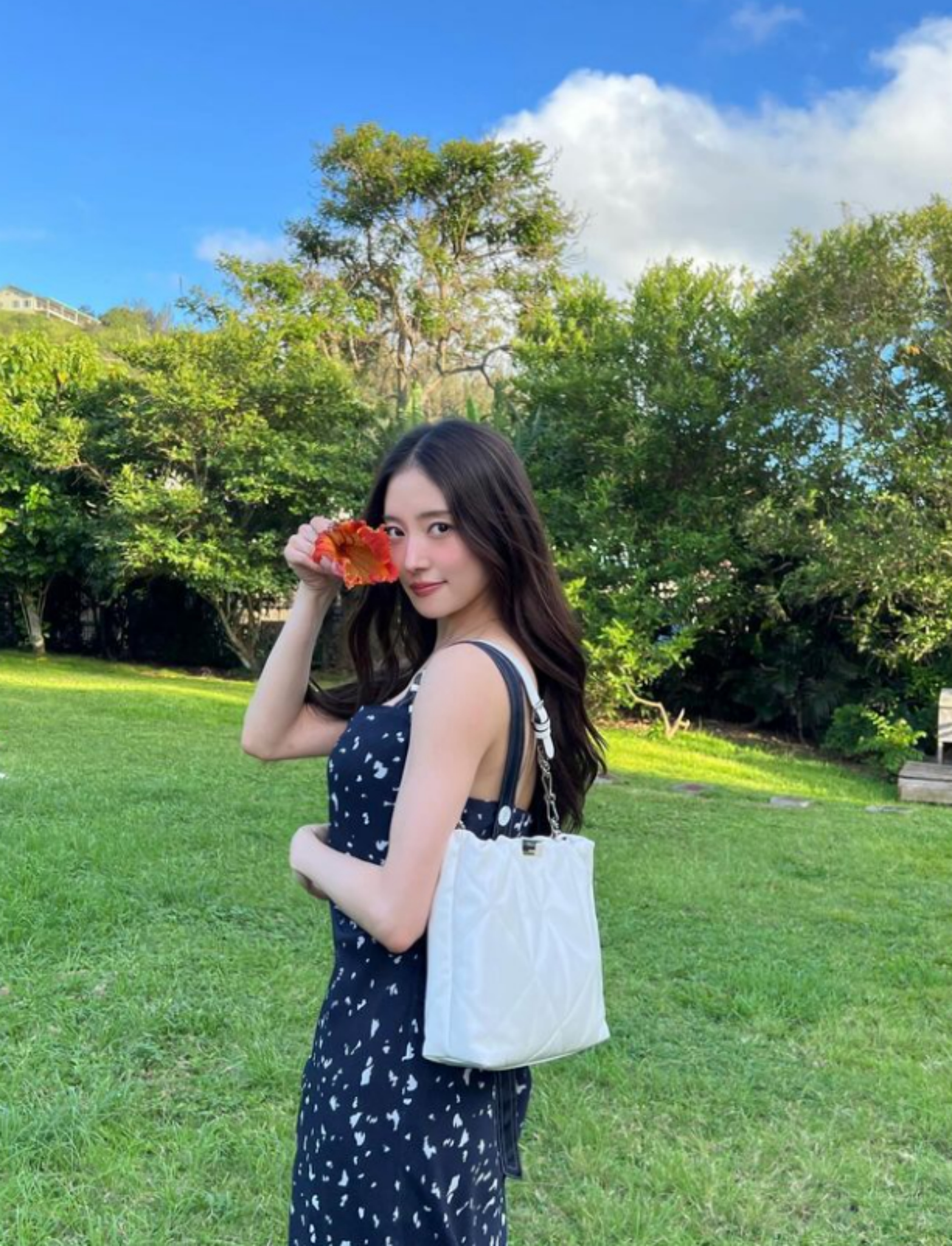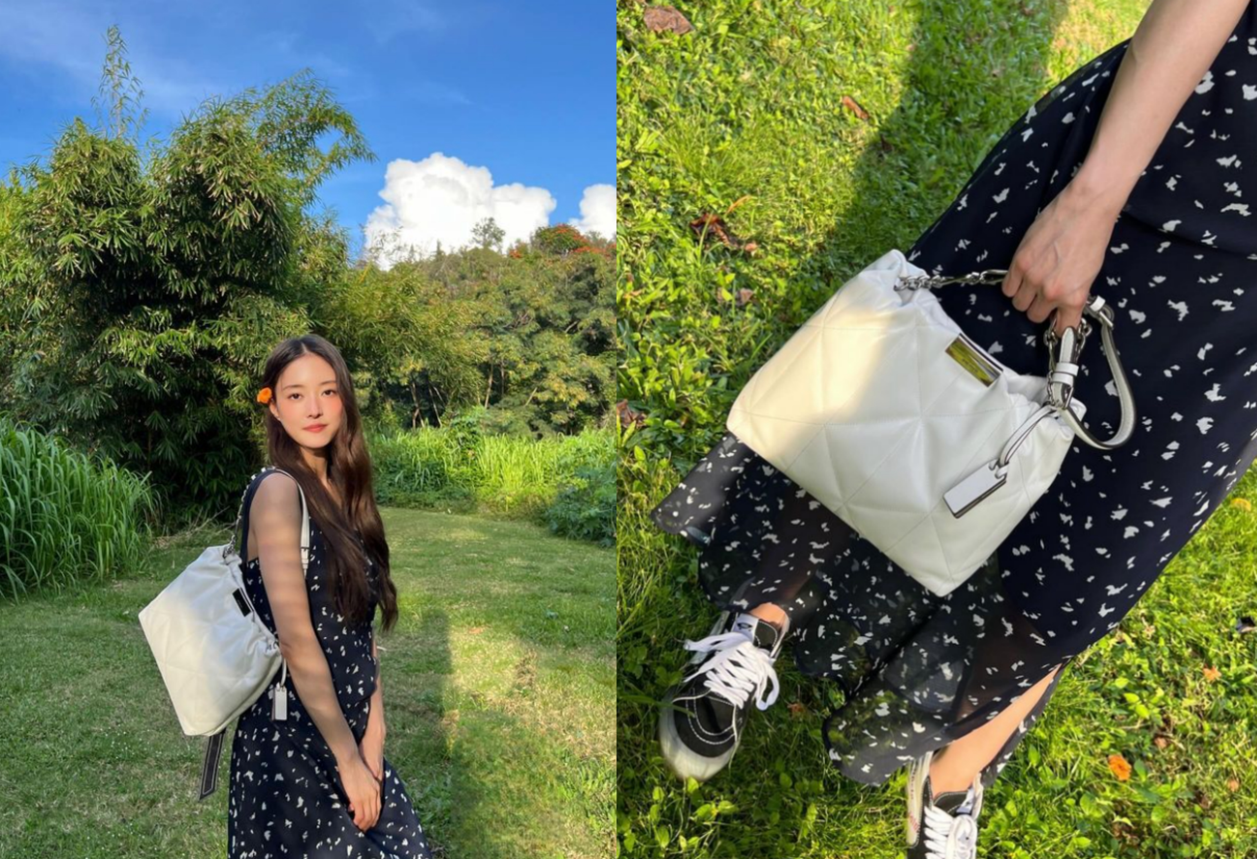 청순 이미지가 풍기는 민소매 원피스 코디 그리고 가방 모두 조이그라이슨 제품입니다.