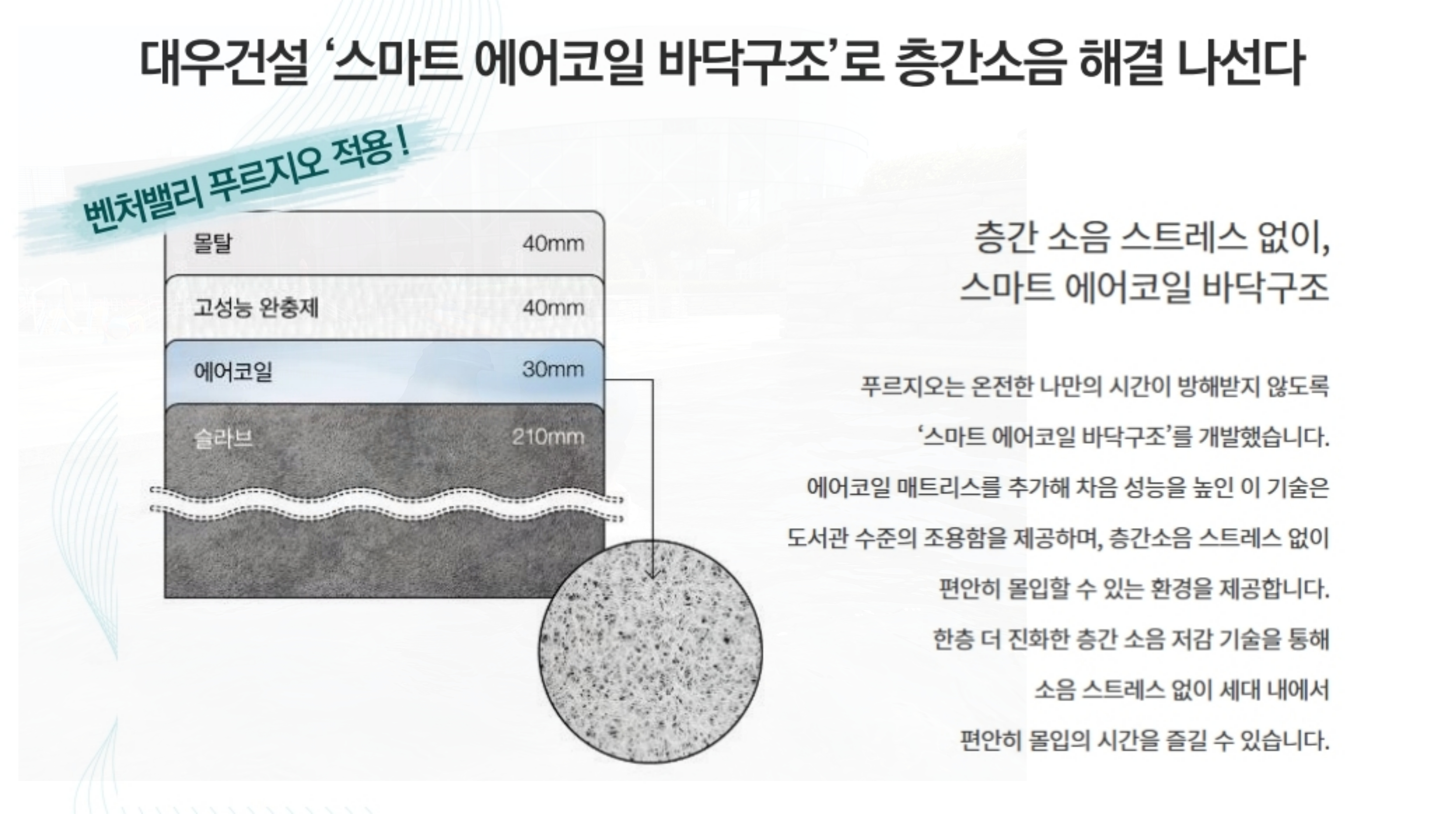 또한, 스마트 3중 바닥구조에 에어코일 매트리스를 추가하여 층간 소음 스트레스를 줄이고 세대 내에서 편안하게 휴식할 수 있도록 배려했습니다.