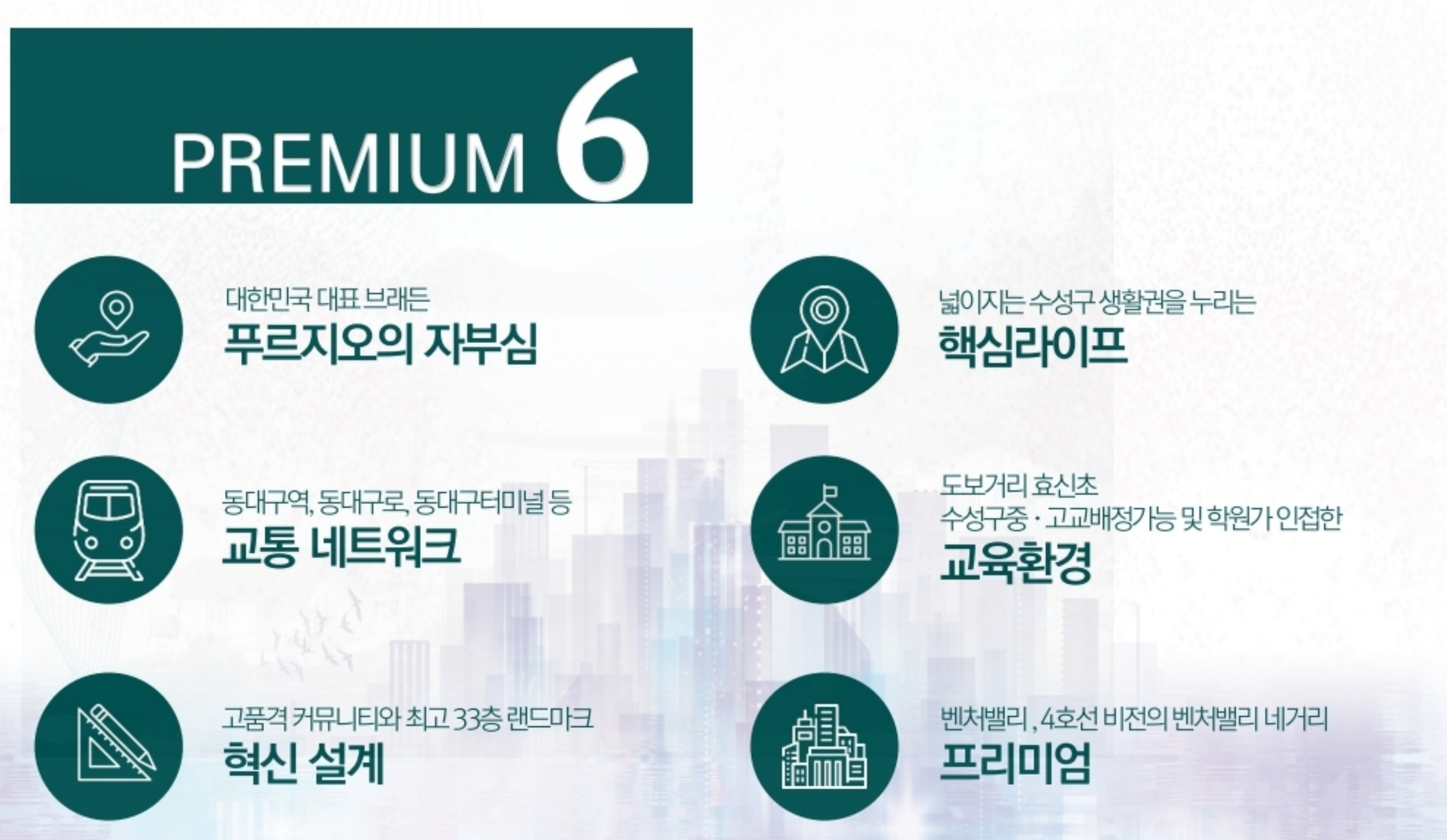 무엇보다 동대구역이 지척에 위치하여 SRT, KTX, 지하철 1호선 등 광역 철도망과 시내 대중교통 노선을 편리하게 활용할 수 있어 직주근접성이 매우 뛰어납니다.