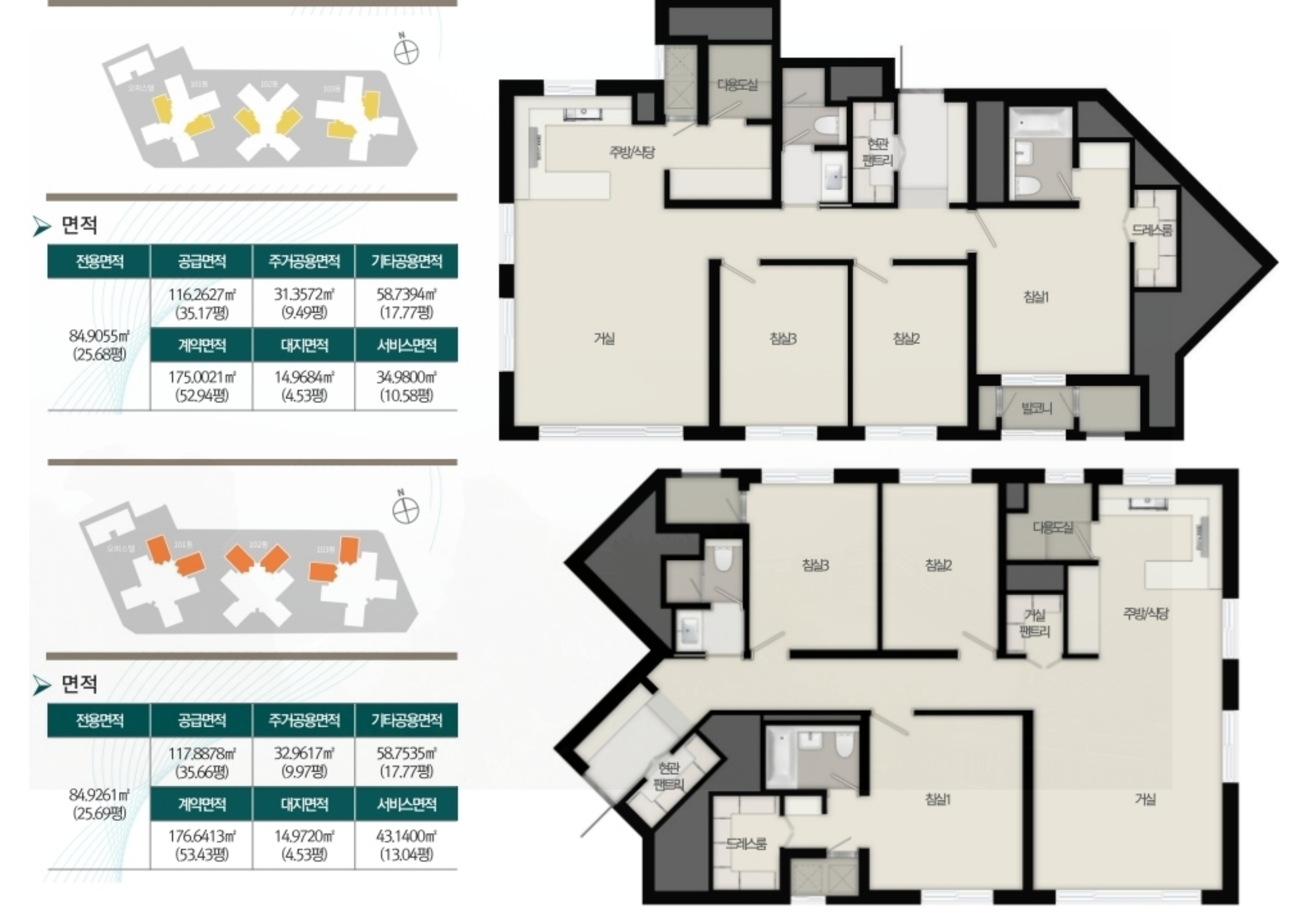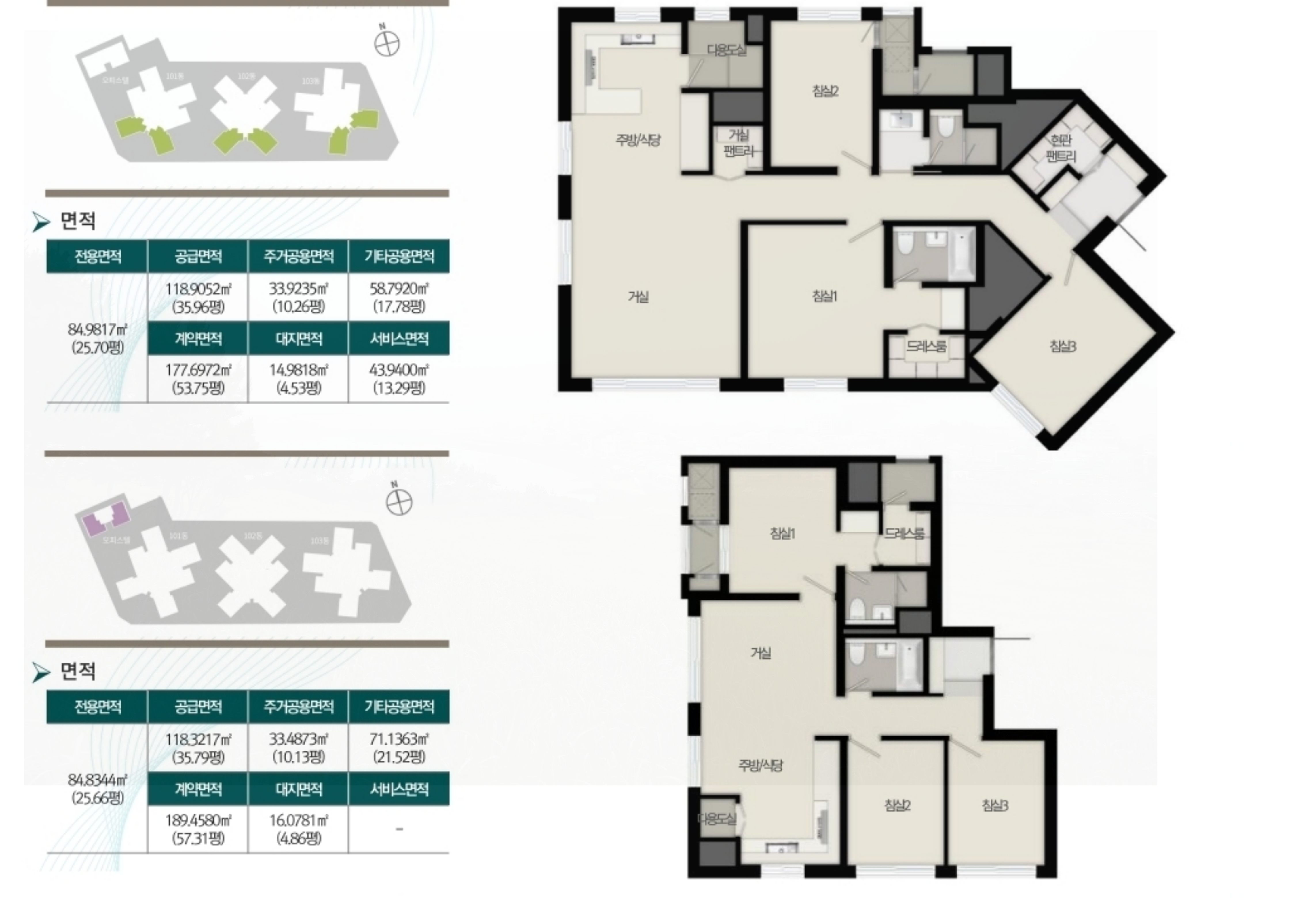84B 타입은 4베이 구조를 도입하여 모든 침실의 통풍 성능이 뛰어나며, 공통적으로 현관 팬트리와 드레스룸을 부속하여 넉넉한 수납 공간을 제공합니다.