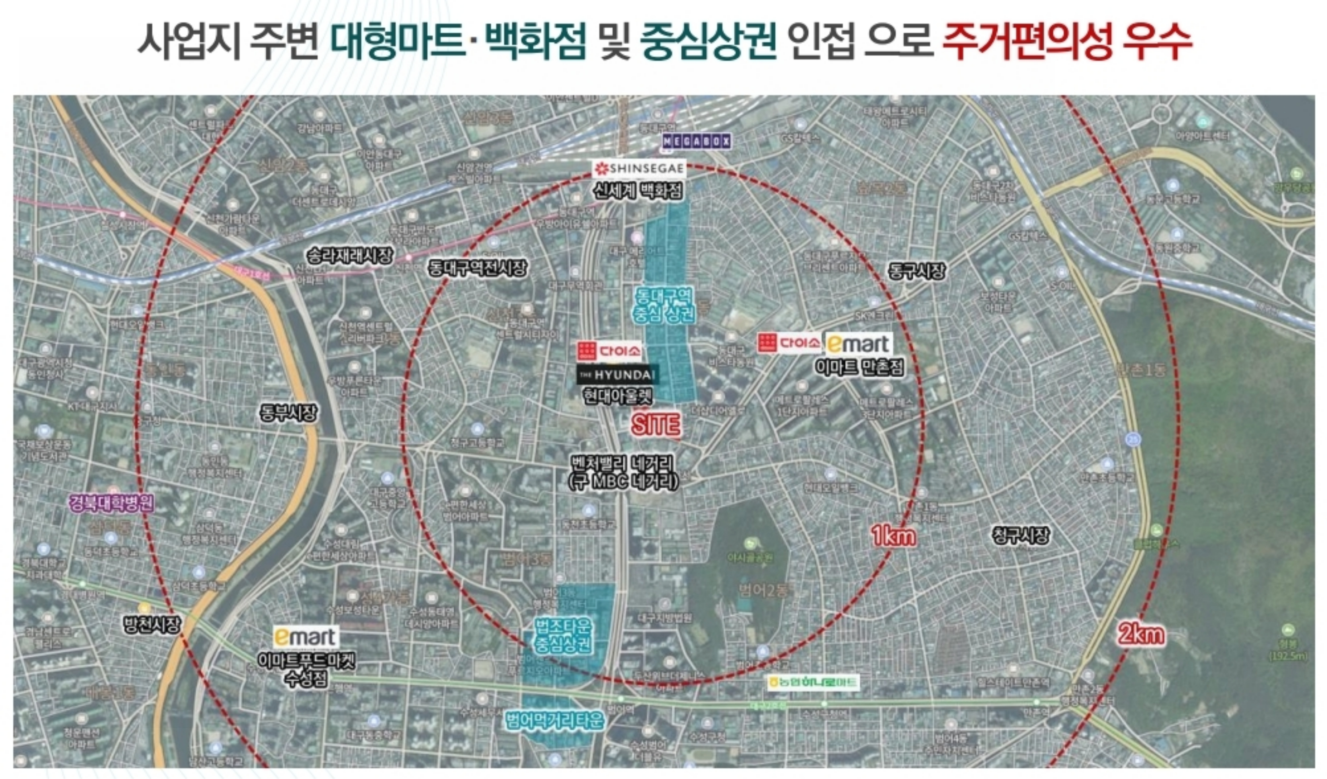 반경 1km 내외에 파티마병원, 이마트, 신세계백화점, 현대시티아울렛 등 대형 편의시설이 촘촘하게 분포하여 생활 편익이 탁월합니다.
