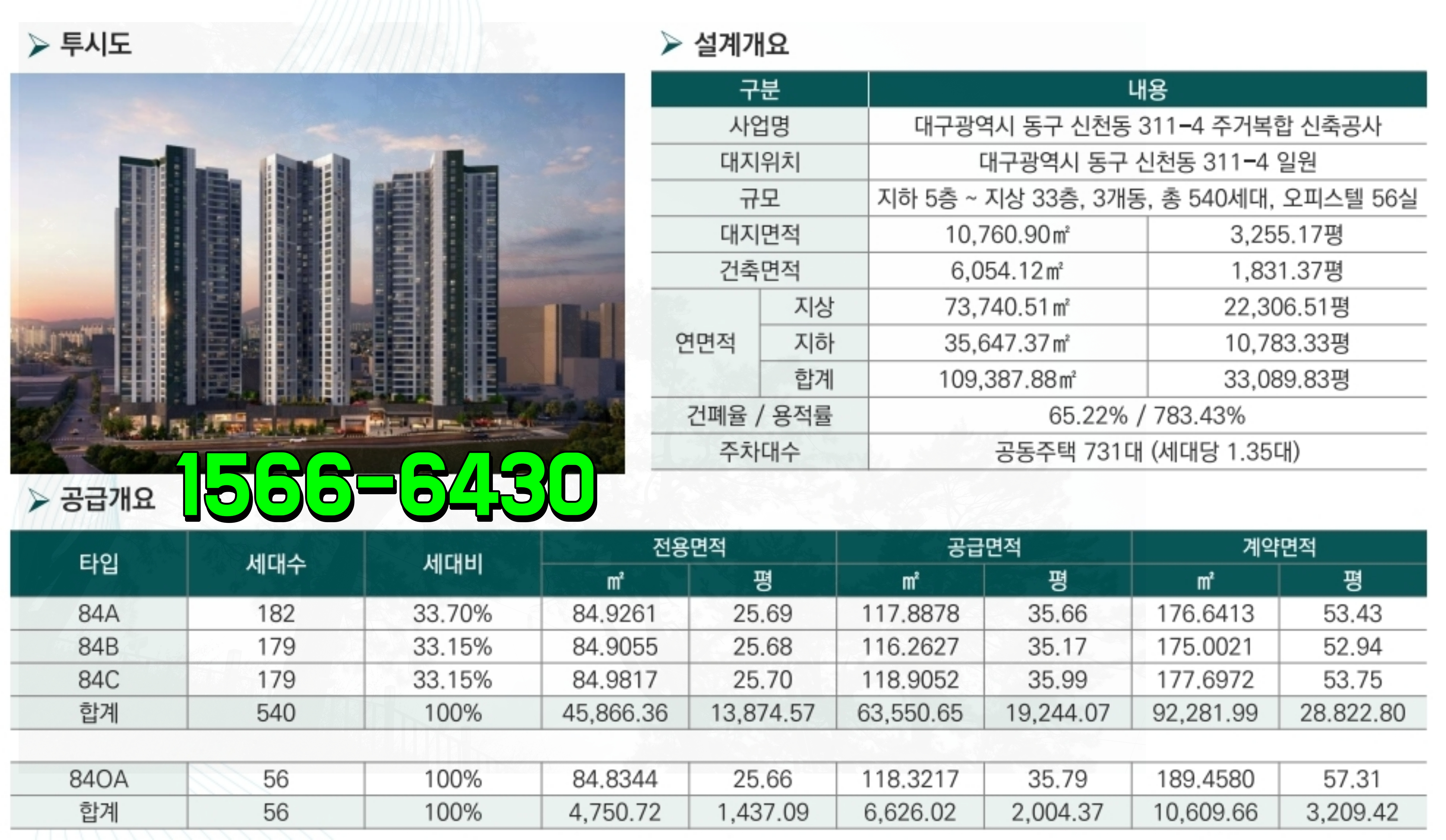 지하 5층에서 지상 33층 높이의 주동 3개가 건설되어 초고층 상징성을 가지며, 이 안에는 총 540세대(아파트 + 오피스텔 56실)가 공급되어 대규모 주거 단지를 형성합니다.