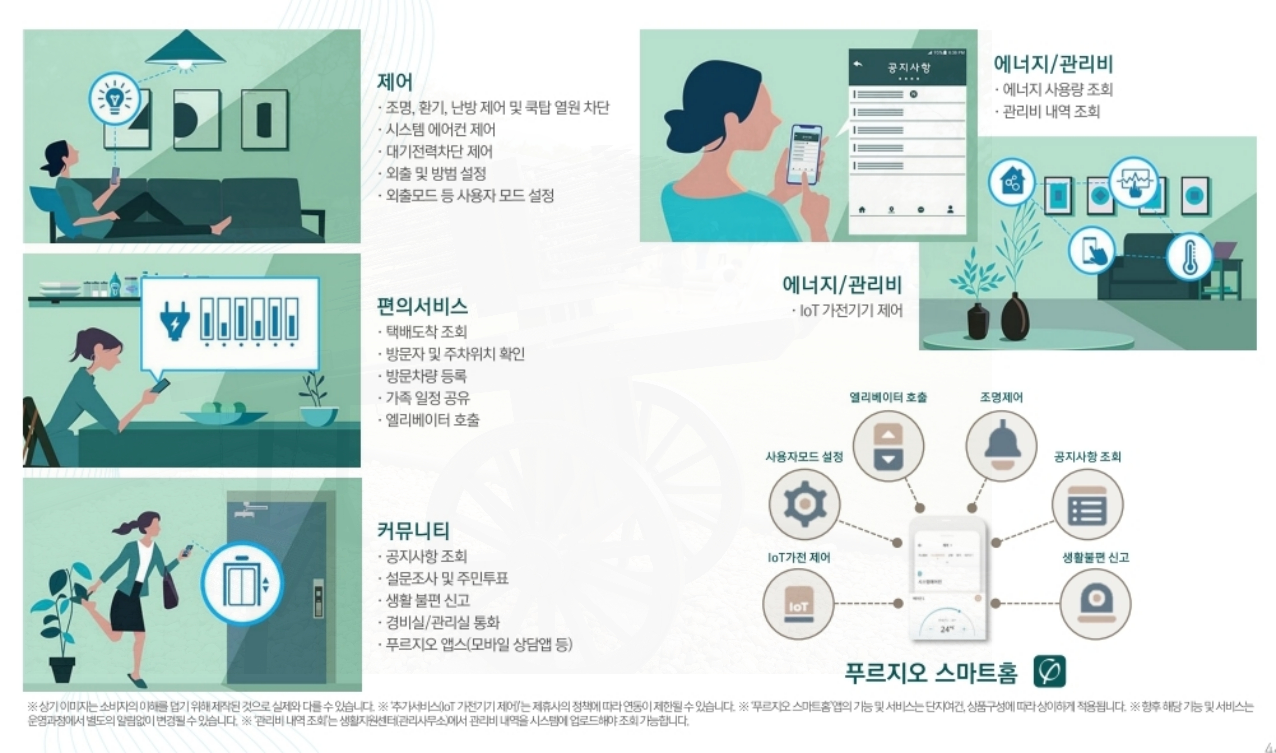 각종 스마트 홈 시스템도 주목할 만합니다. 다양한 제어 기능은 물론, 택배 도착 알림 등의 편의 서비스가 제공되며, 각종 공지사항을 확인할 수 있는 커뮤니티 기능, 그리고 에너지 사용량과 관리비 내역을 한눈에 조회할 수 있도록 구성되어 있습니다.