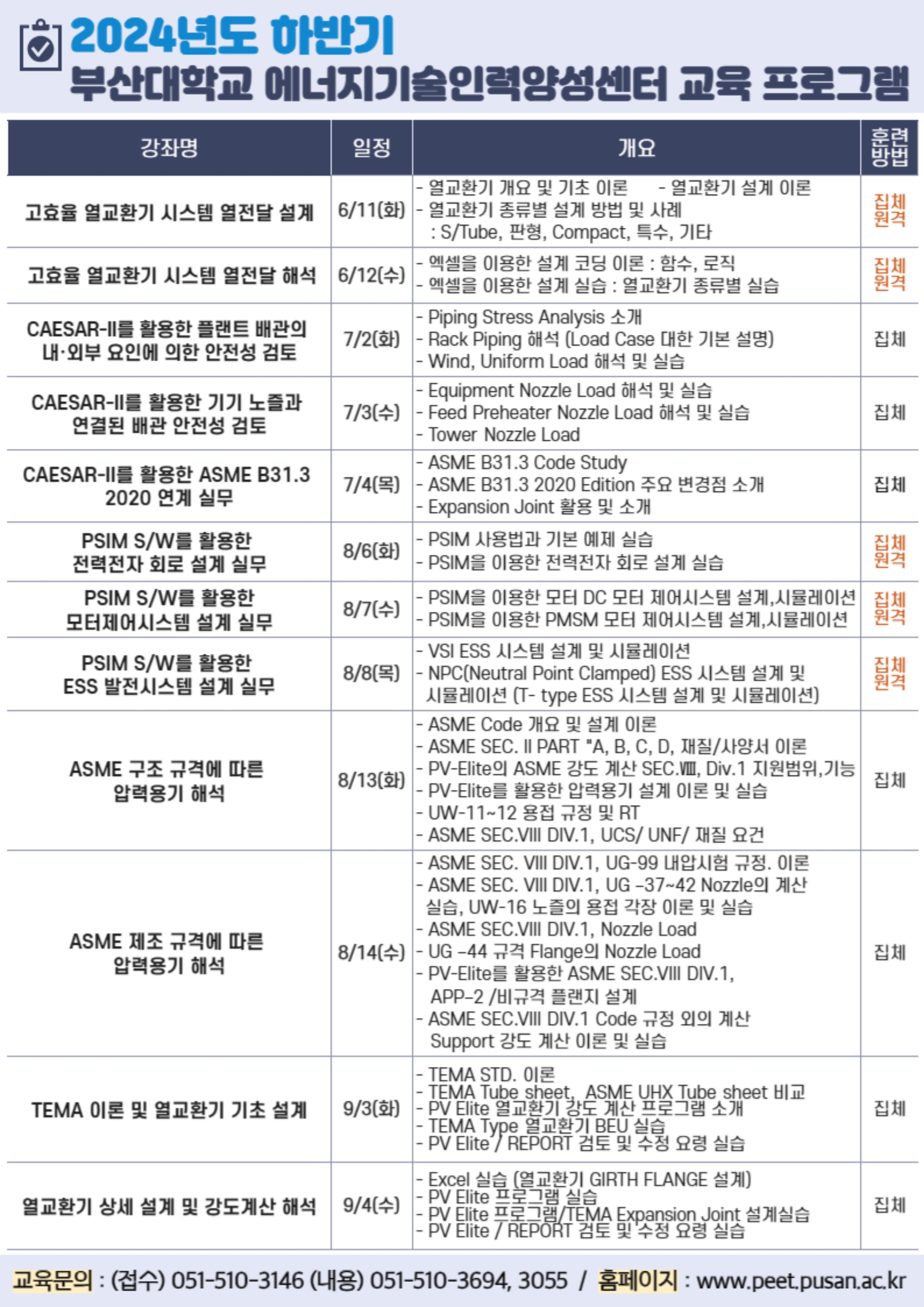 강좌 신청은 개강 한 달 전부터 가능하며, 부산대학교 에너지기술인력양성센터 홈페이지에서 세부 교육내용과 일정을 확인할 수 있다.