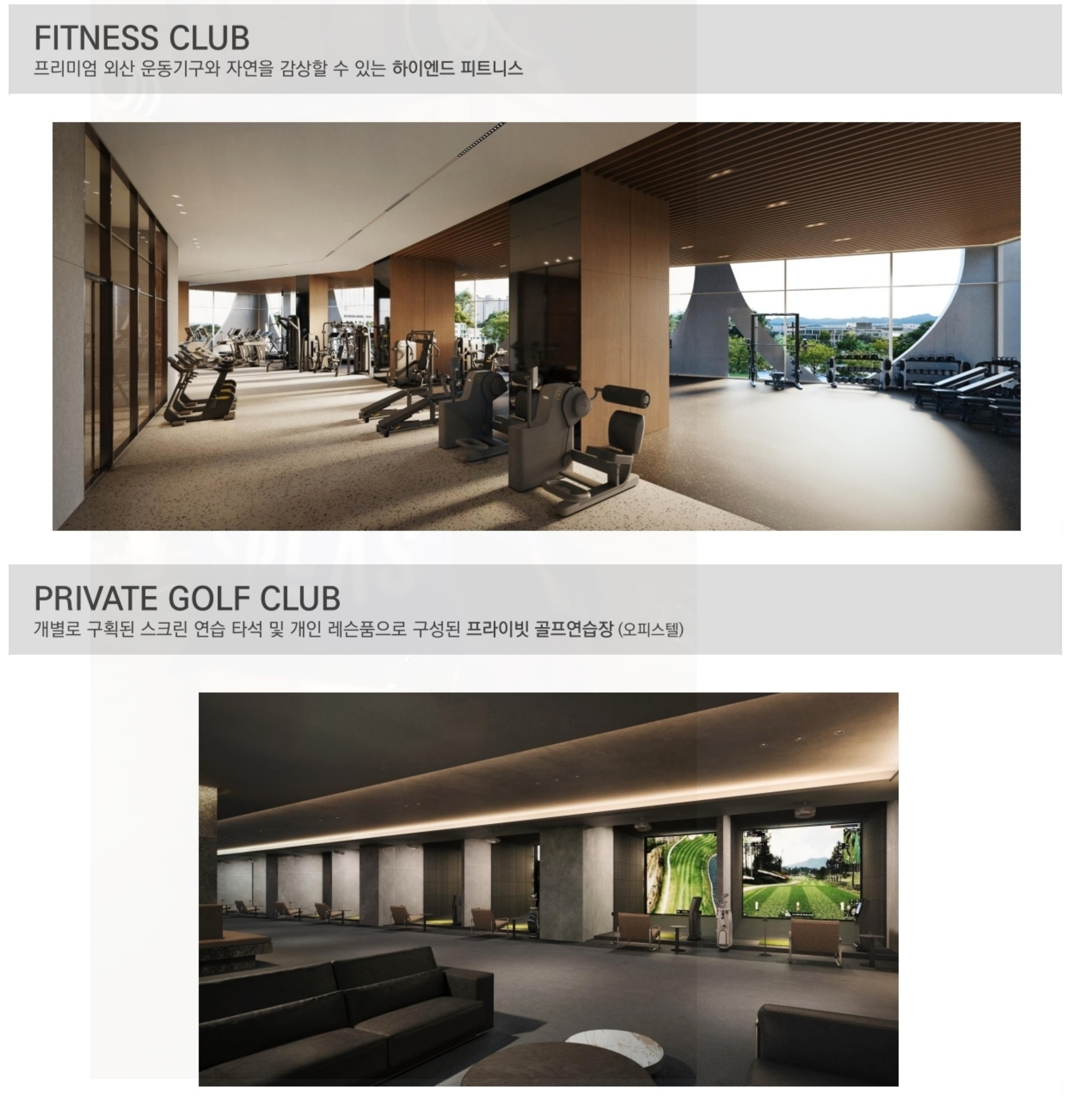 커뮤니티 시설로는 프라이빗 골프클럽, 피트니스, 필라테스, GX룸 등 다양한 운동 시설이 마련되어 있는데요.