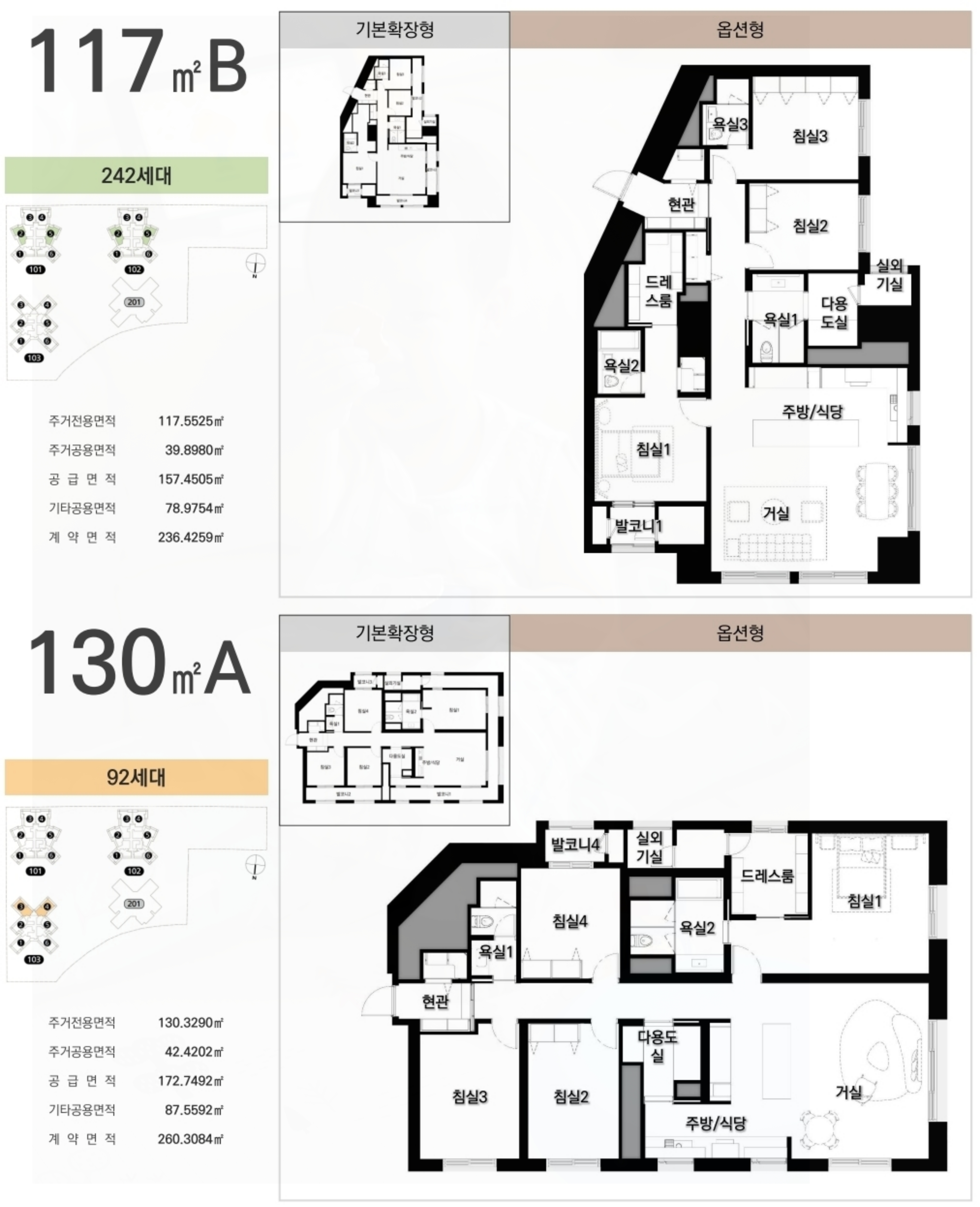 아파트는 전용면적 94㎡, 116㎡, 117㎡A, B, 130㎡, 138㎡, 그리고 펜트하우스인 247㎡까지 다양한 대형 평형이 준비되어 있습니다.