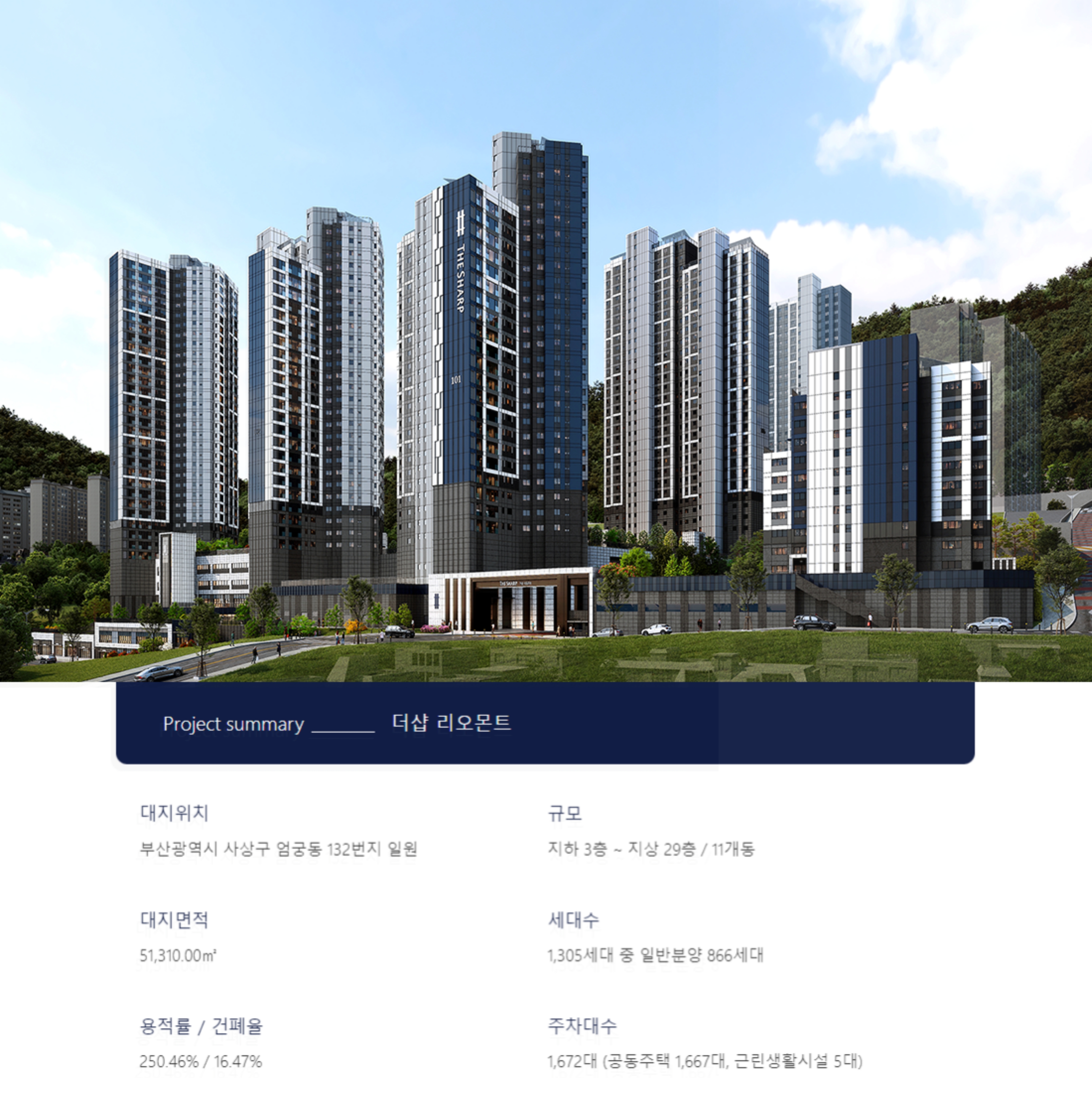 11개 동으로 지하 3층 ~ 지상 29층 규모입니다. 주차대수는 1672대이고, 16%대의 건폐율과 250%대의 용적률이 말해주듯 쾌적하고, 단지에 매우 여유가 있어 보입니다.