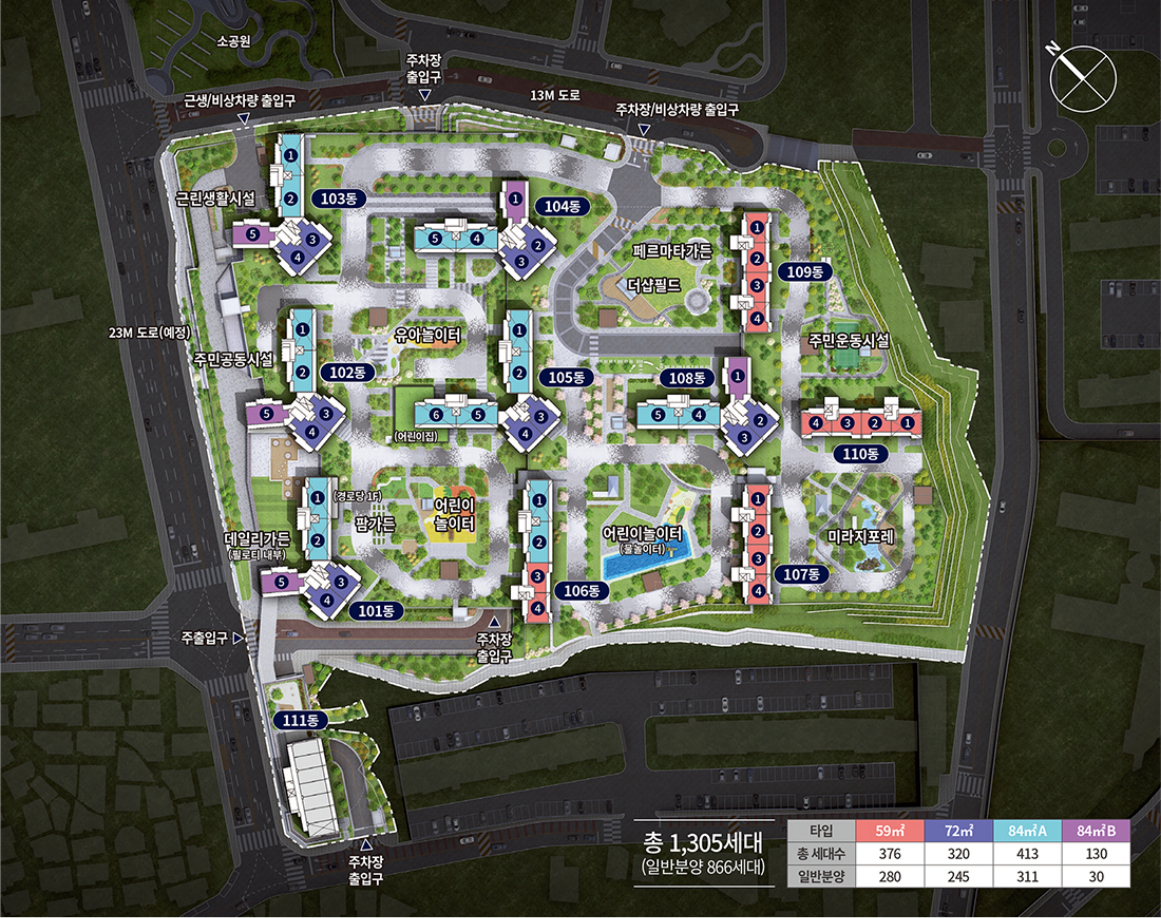 단지 배치도입니다. 남향 위주의 기본 설계는 이제 기본이죠! 동과 동 사이의 거리도 매우 넓어 시야 확보, 조망권, 일조량 매우 충분해 보입니다. 그리고 무엇보다 동과 동 사이에 여러 부대시설들이 설치되어 입주민들의 힐링과 활동, 휴식을 보장해 줄 수 있을 것 같아요 보입니다.