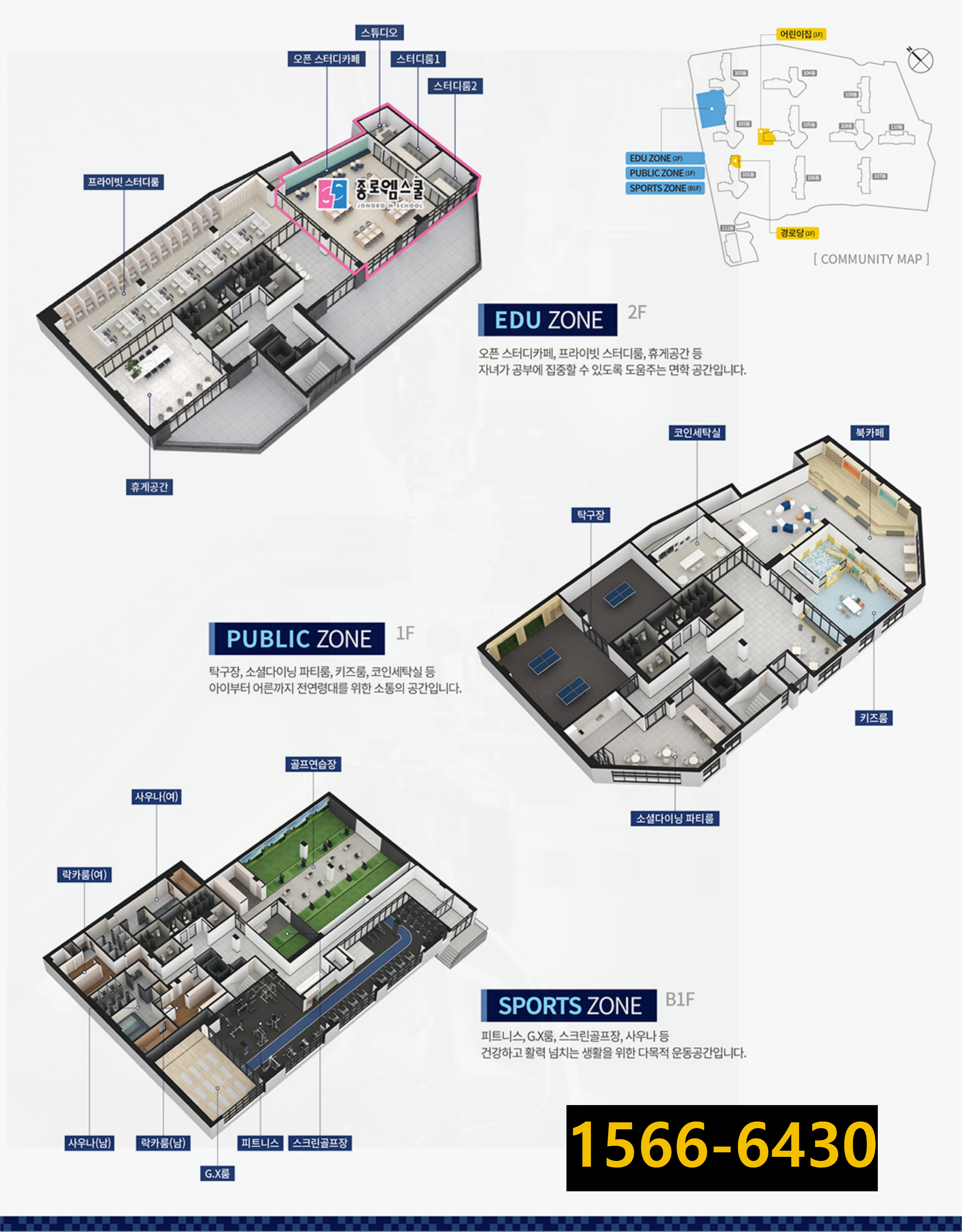 마지막으로 커뮤니티 센터입니다. 에듀존에는 종로엠 스쿨이 입점을 하게 되고요. 프라이빗 스터디룸도 제공됩니다.