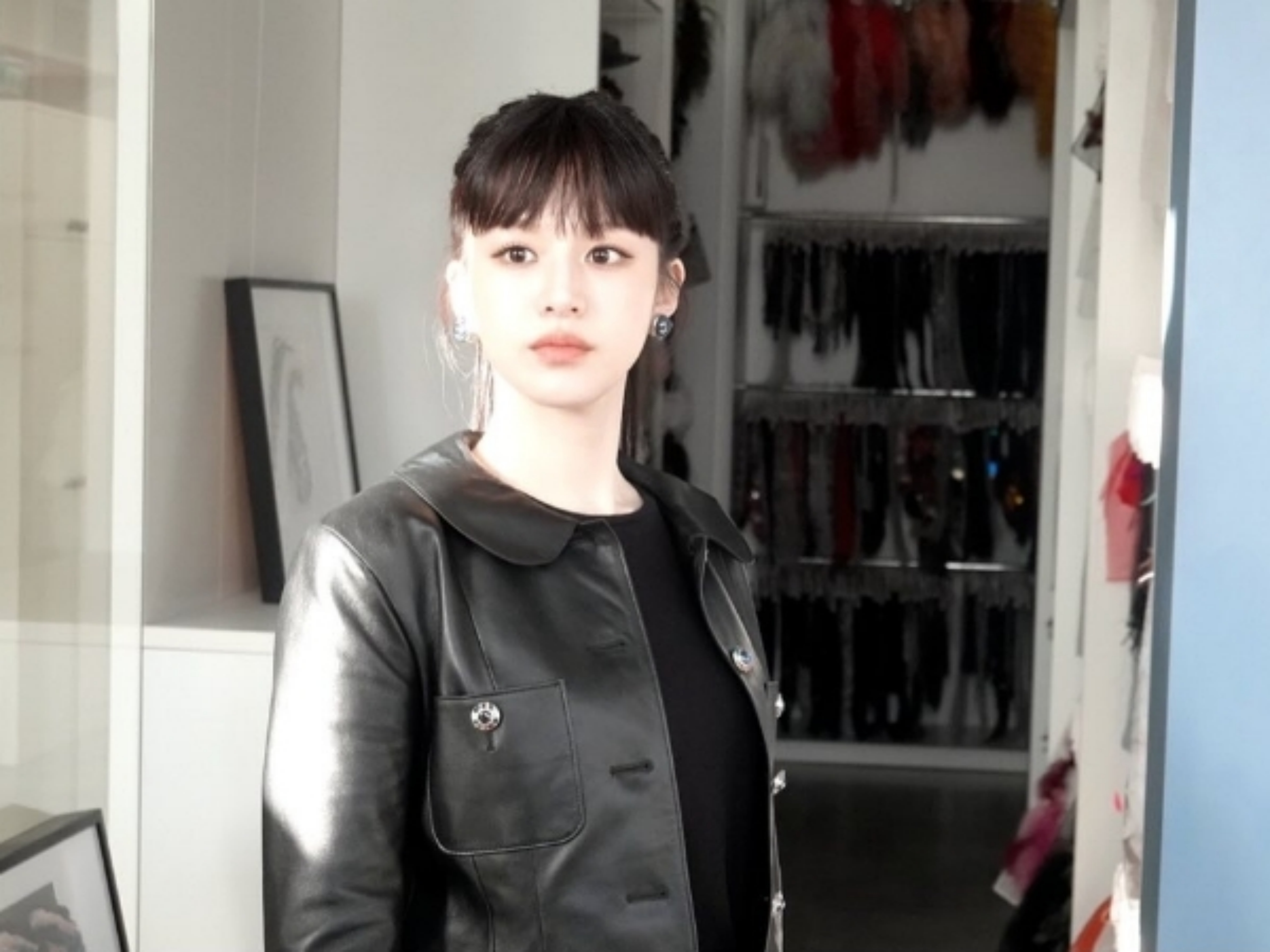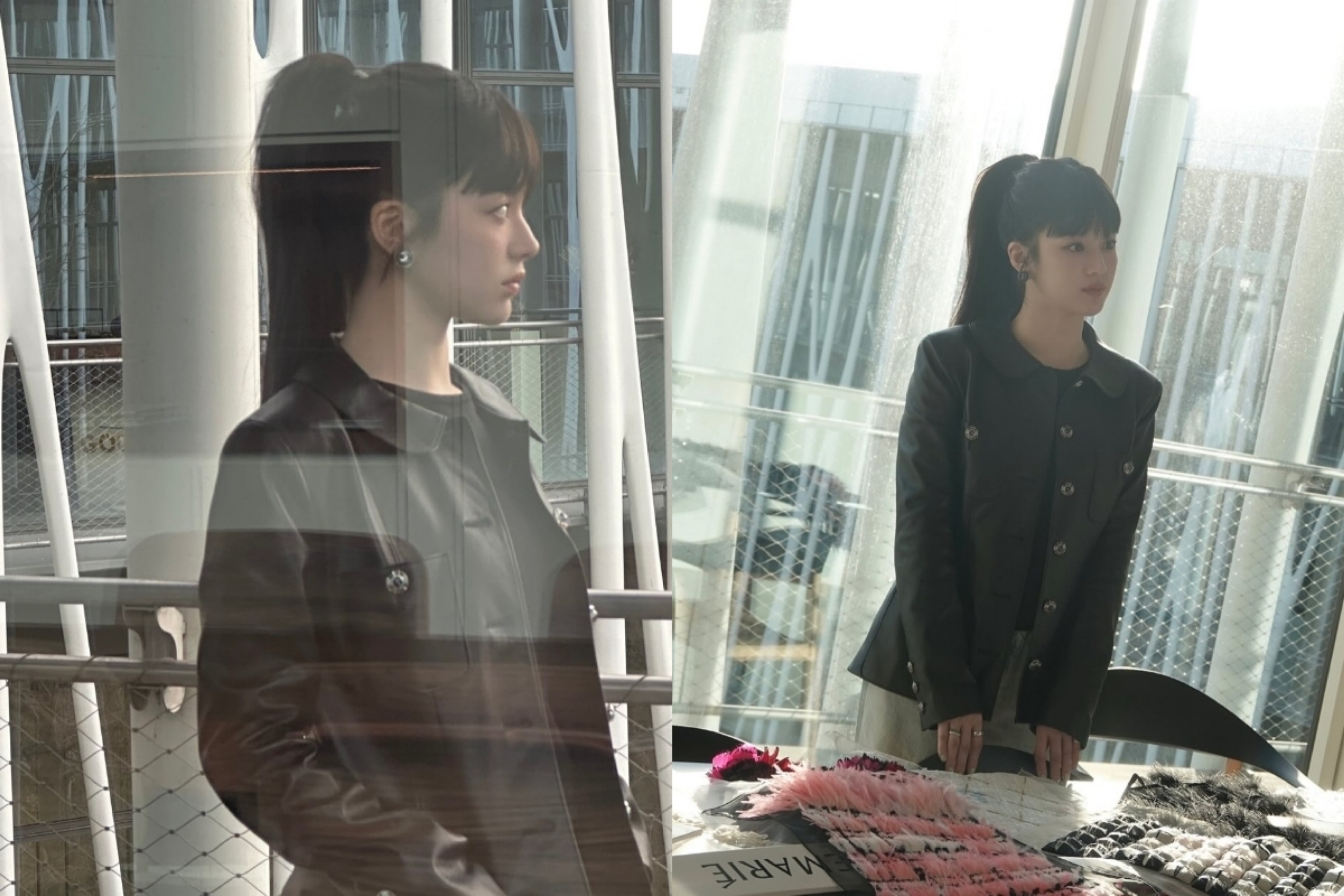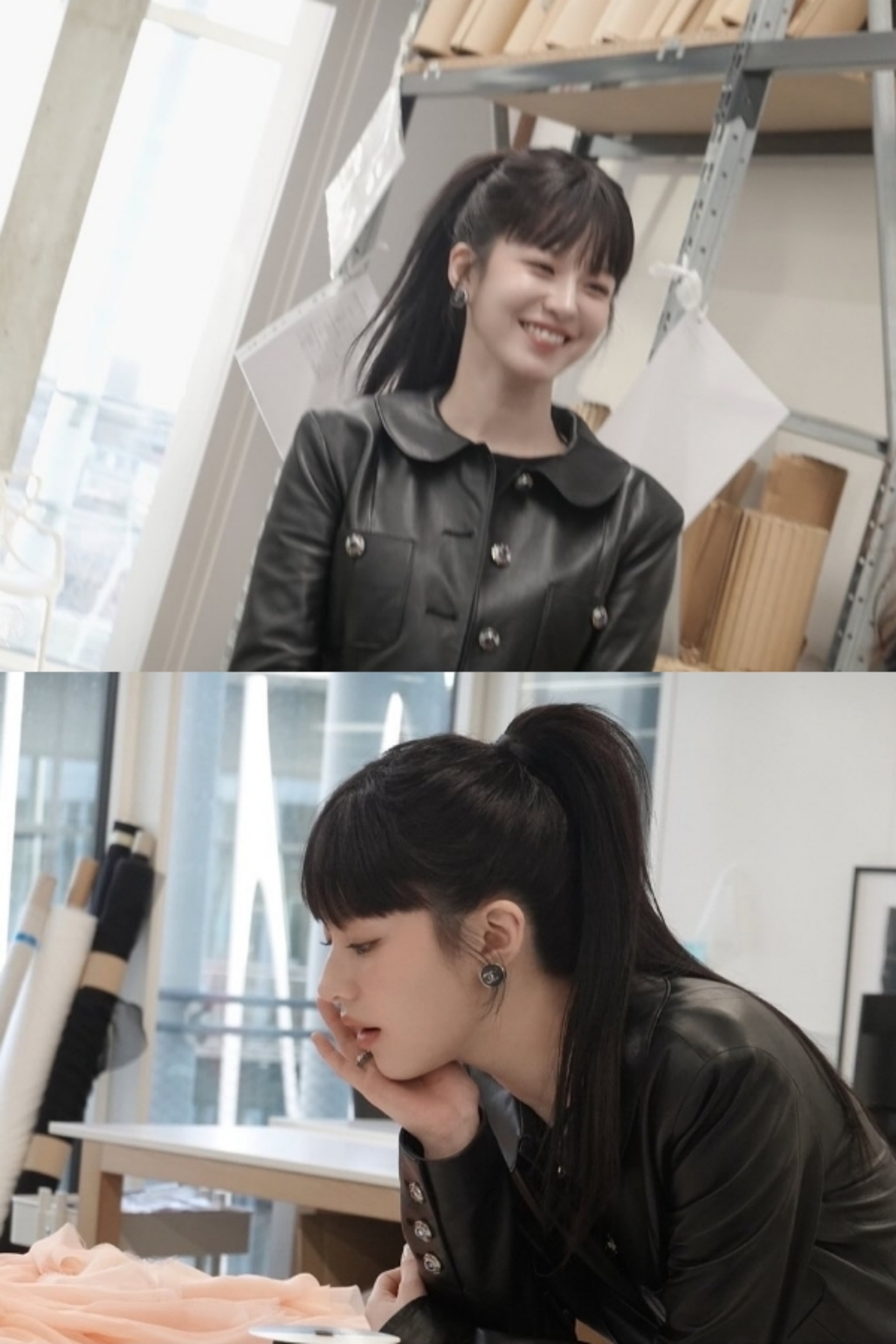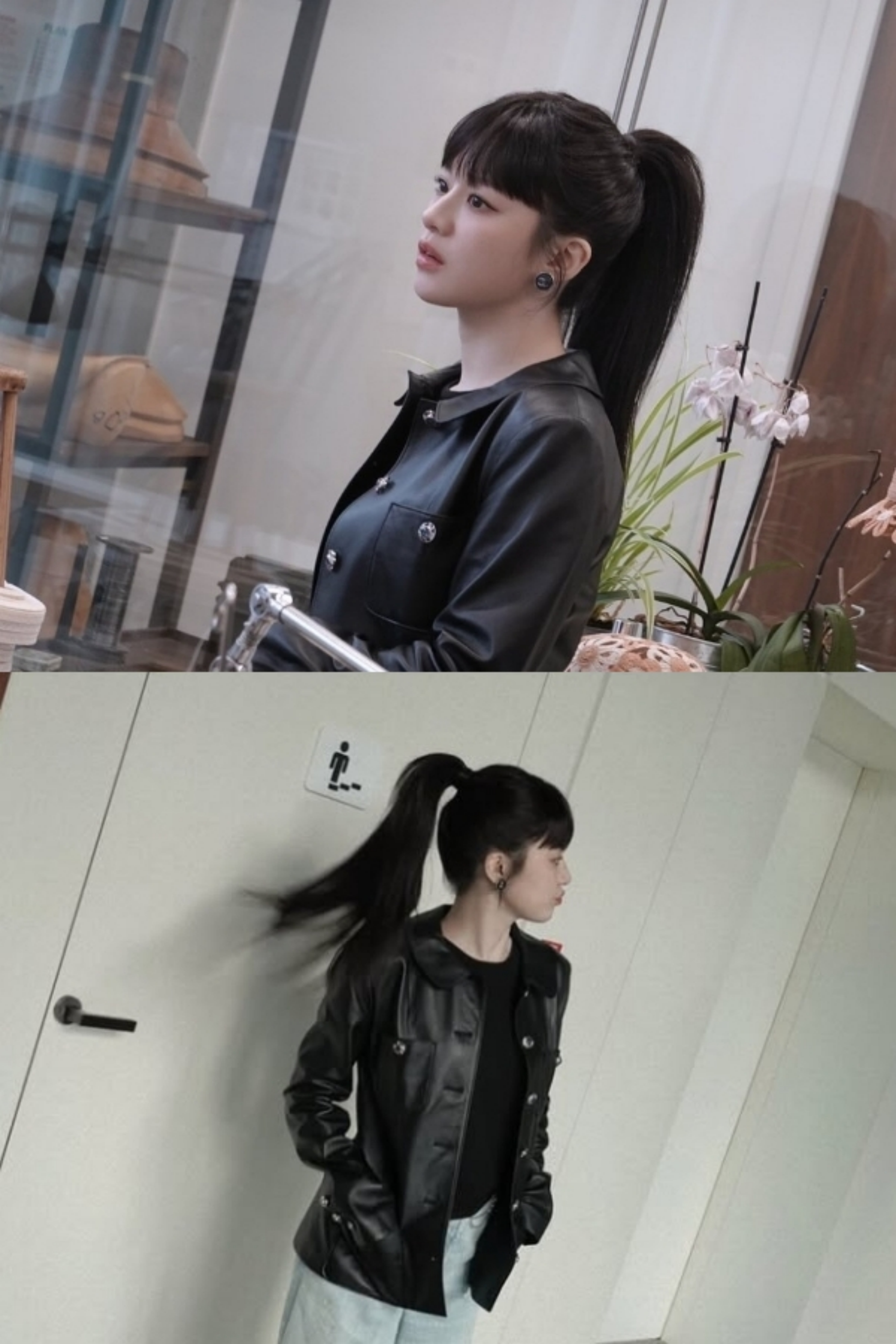 포니테일로 묶은 헤어스타일에 가죽자켓, 옅은 청바지, 검은색 라운드 셔츠까지 마치 한 세트같이 너무도 잘 어울리는 코디로 스타일링했다.