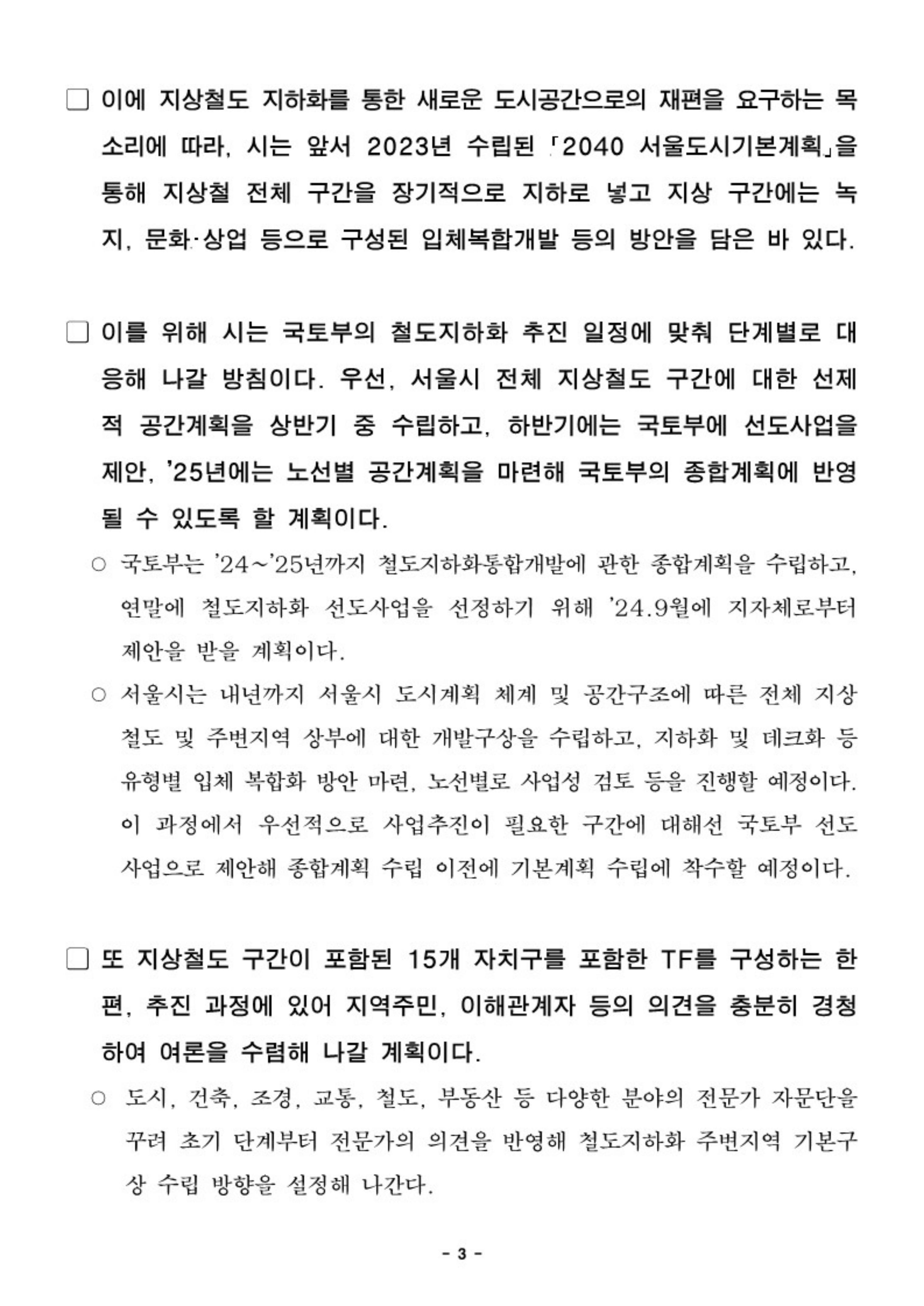 서울시는 앞서섯 2023년에 수립된 2040 서울도시기본계획을 통해서 지상철의 전체 구간을 장기적으로 지하로 넣고, 지상의 구간을 문화와 상업, 그리고 녹지공간으로 만드는 입체복합 개발 등의 방은을 담은 바 있었다.