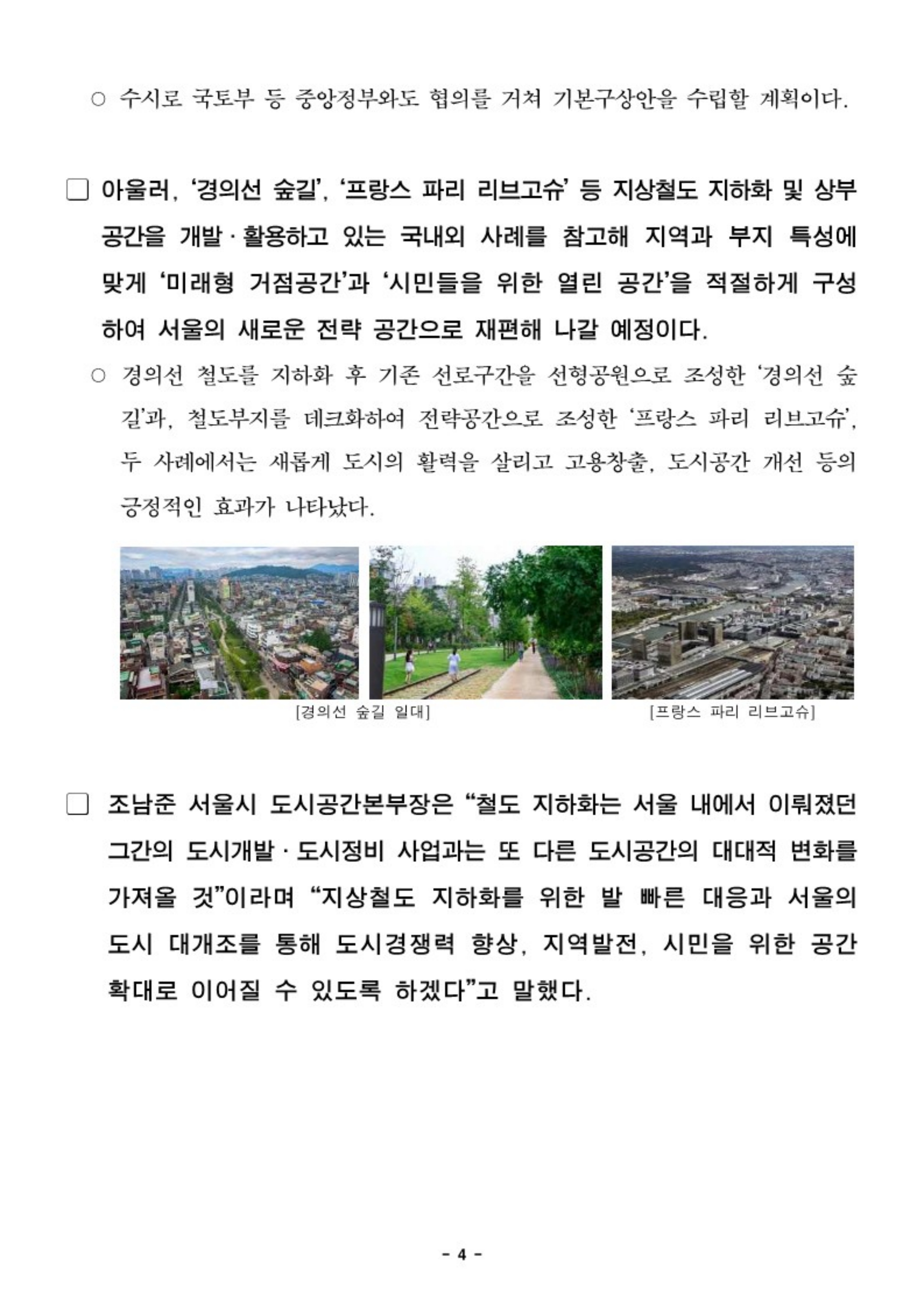 경의선 숲길과 프랑스 파리의 리브고슈 등의 자상철도 지하화 계획, 상부 공간을 개발하고 활용한 다양한 국내 그리고 해외의 사례를 참고해 미래형 거점공간으로 또 시민들을 위한 열린 공간으로 효율적이고, 적절하게 만든다는 계획이다.