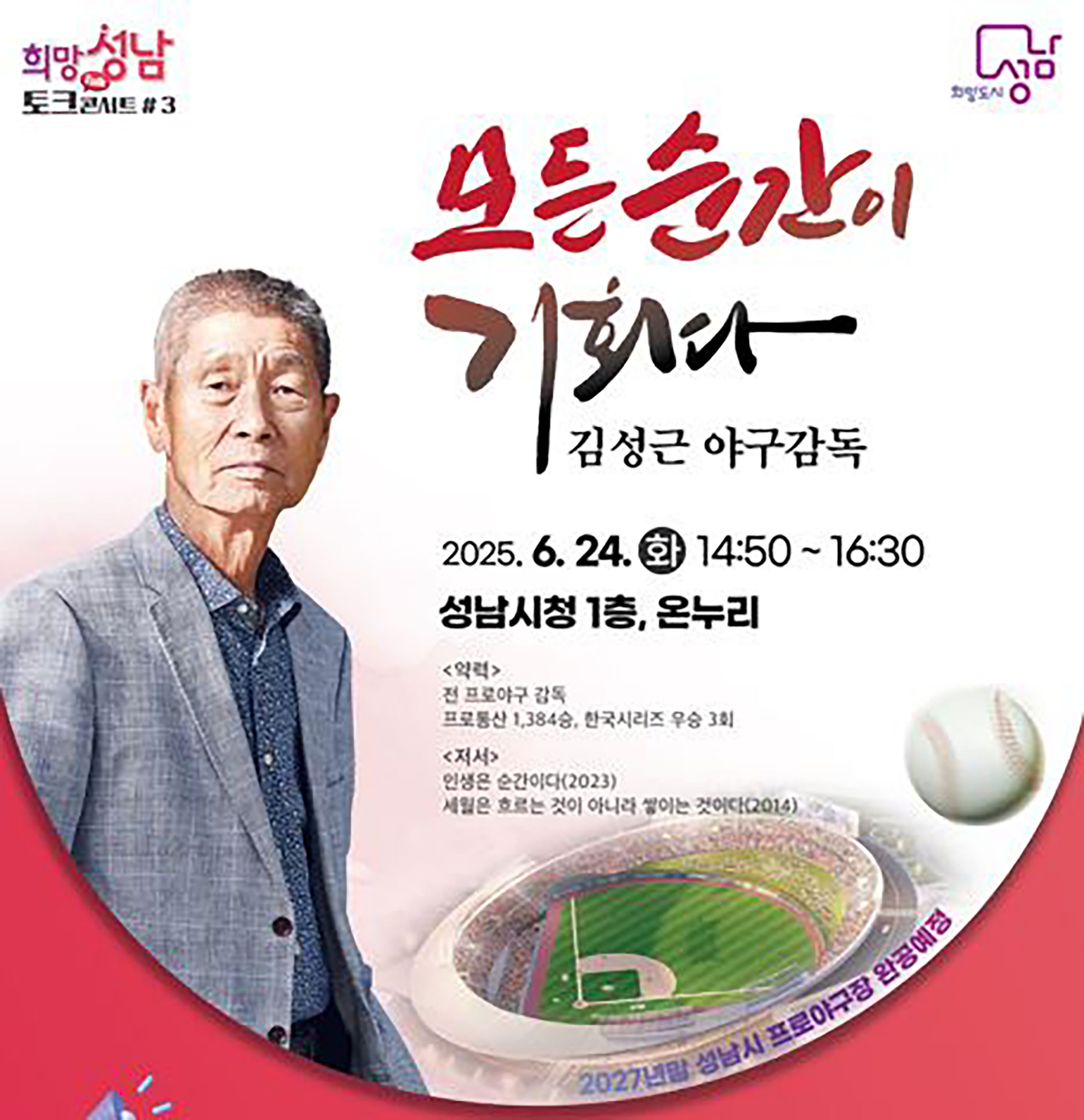 성남시는 ‘야구의 신’이라 불리는 김성근(82) 야구 감독을 초빙해 오는 6월 24일 오후 2시 50분 시청 1층 온누리에서 ‘희망성남 토크콘서트 3강’을 연다.