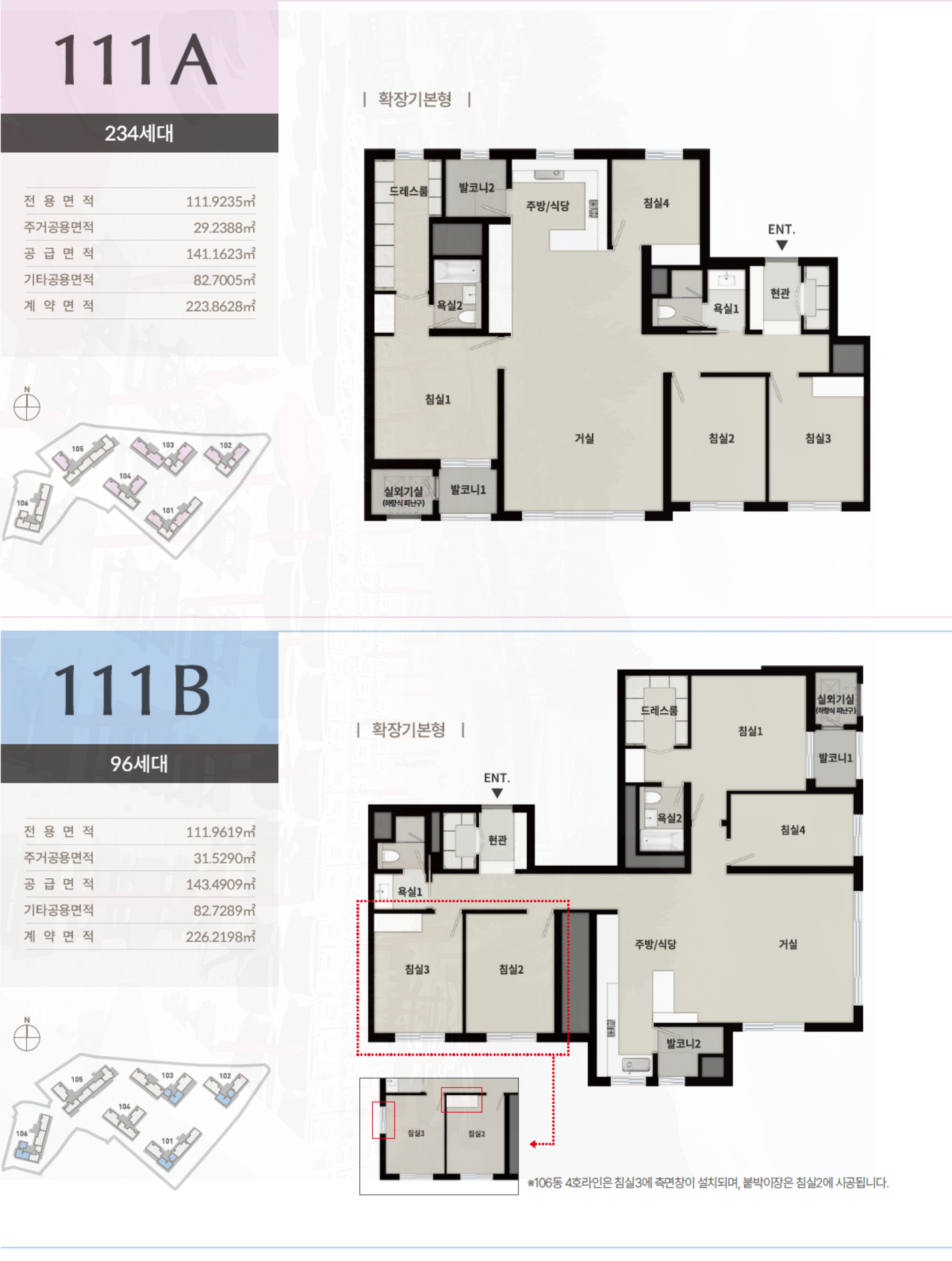 84㎡는 ABCD 4개 타입으로 210세대가 구성되며, 111㎡는 ABC 3개 평면도로 나뉘어 총 350세대가 설계되었습니다.