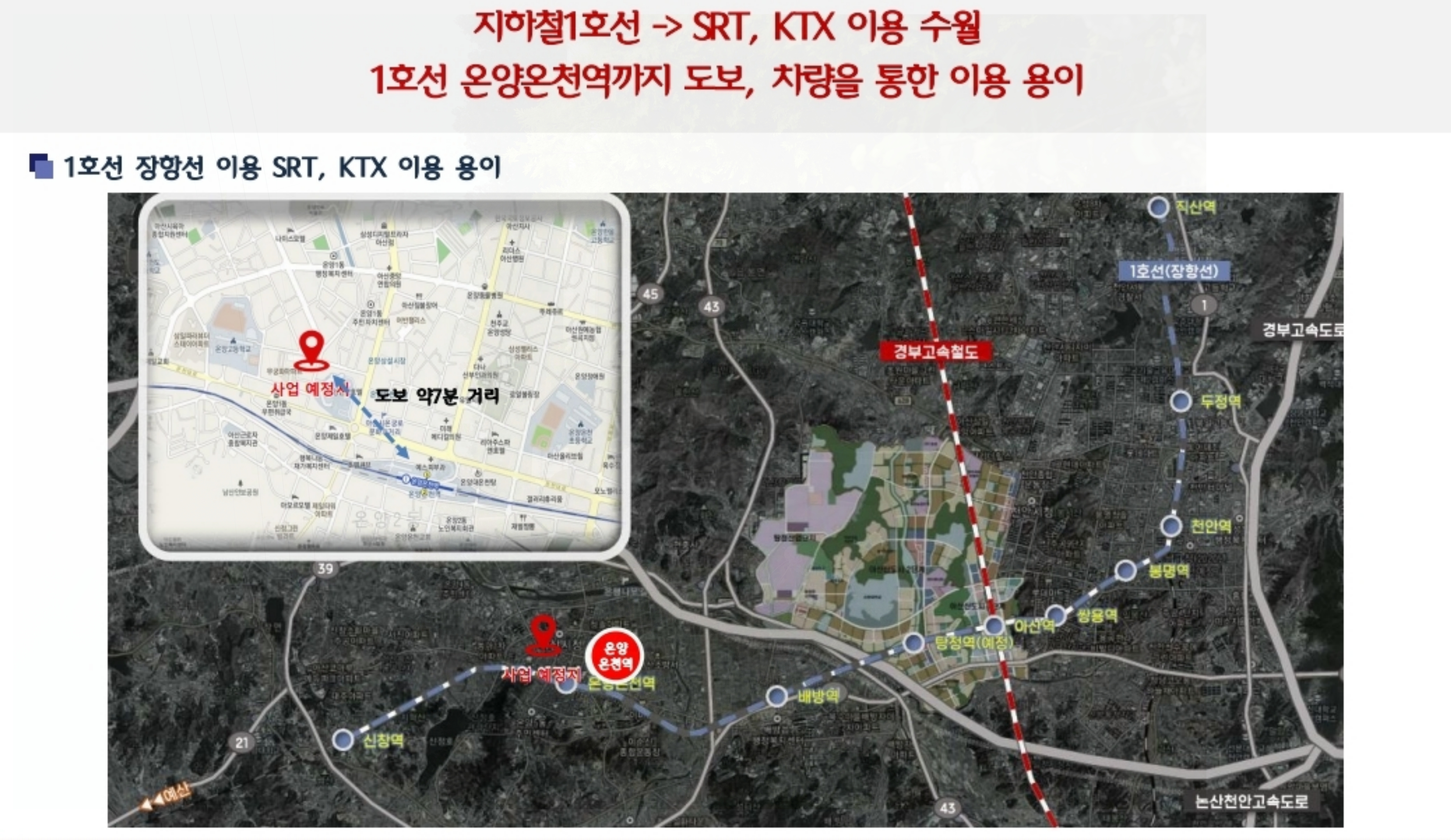 또한 최근 개통된 천안·아산 고속도로를 통해 경부고속도로 접근도 매우 편리합니다.