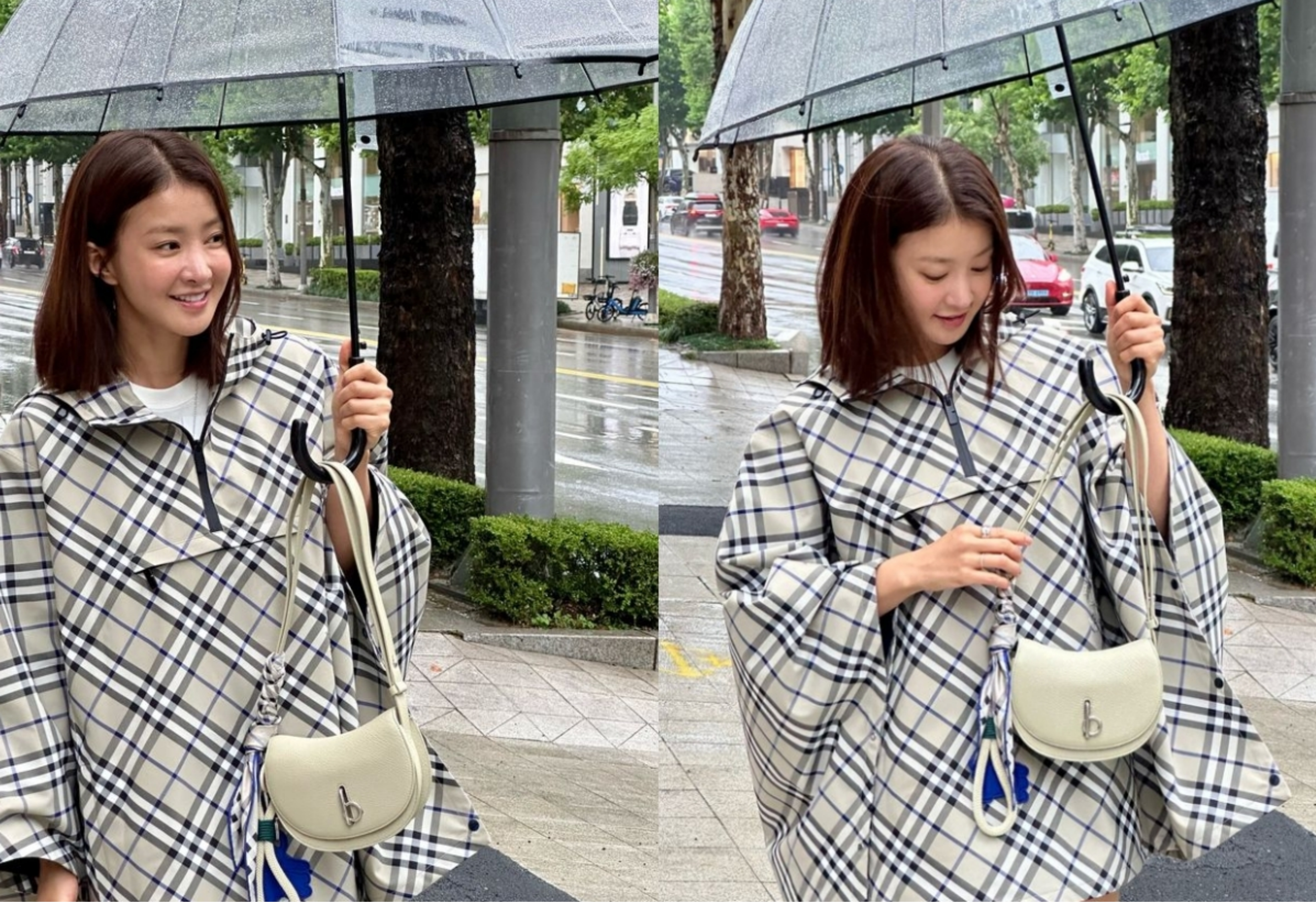 한 눈에 알아볼 정도로 이시영이 입고 있는 레인케이프는 버버리 체크가 상당히 인상적입니다.