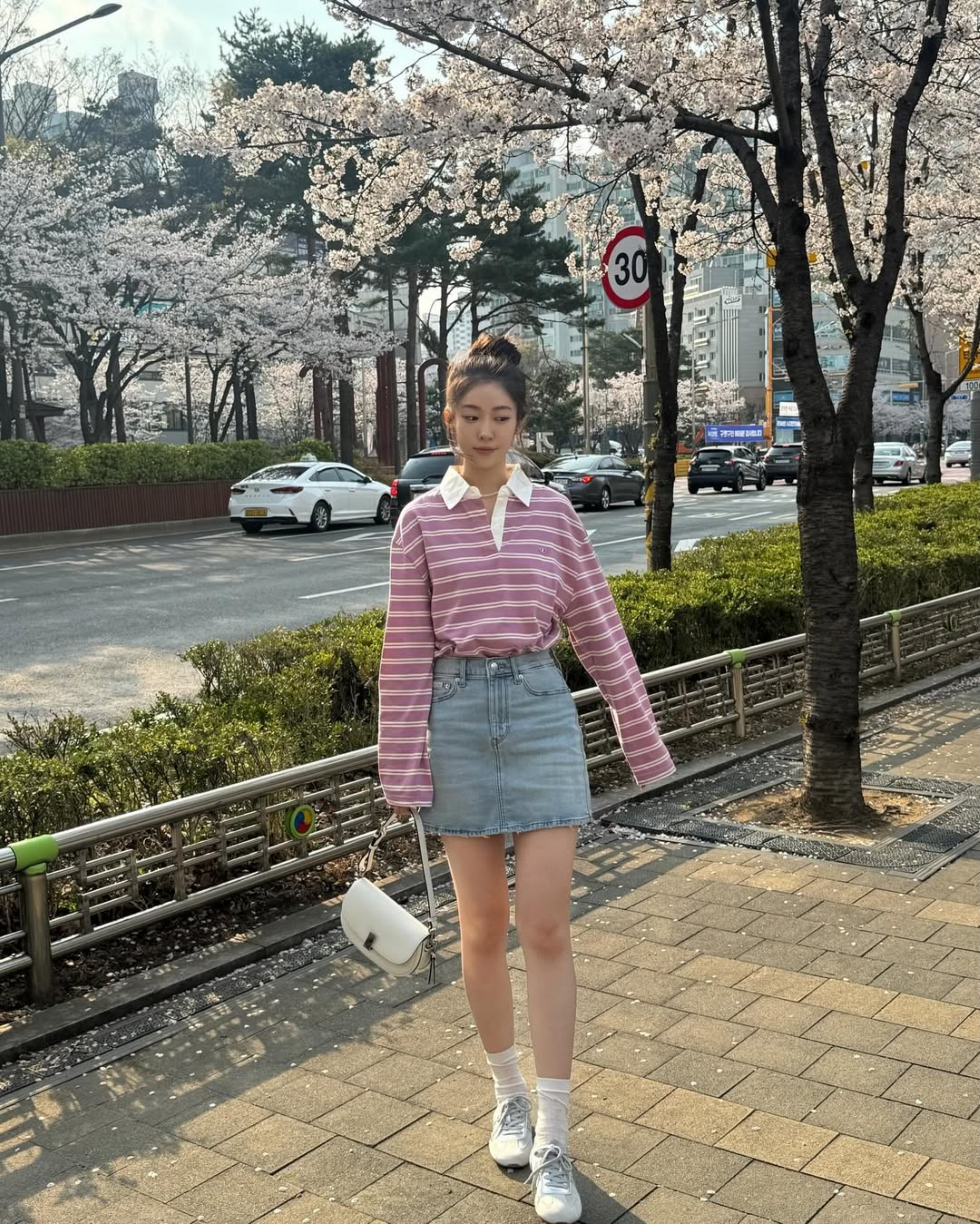 다시 ...^^ 스트라이프 럭비티셔츠와 함께 데님 미니스커트와 흰색 스니커즈로 데일리룩을 완성시켰는데요.