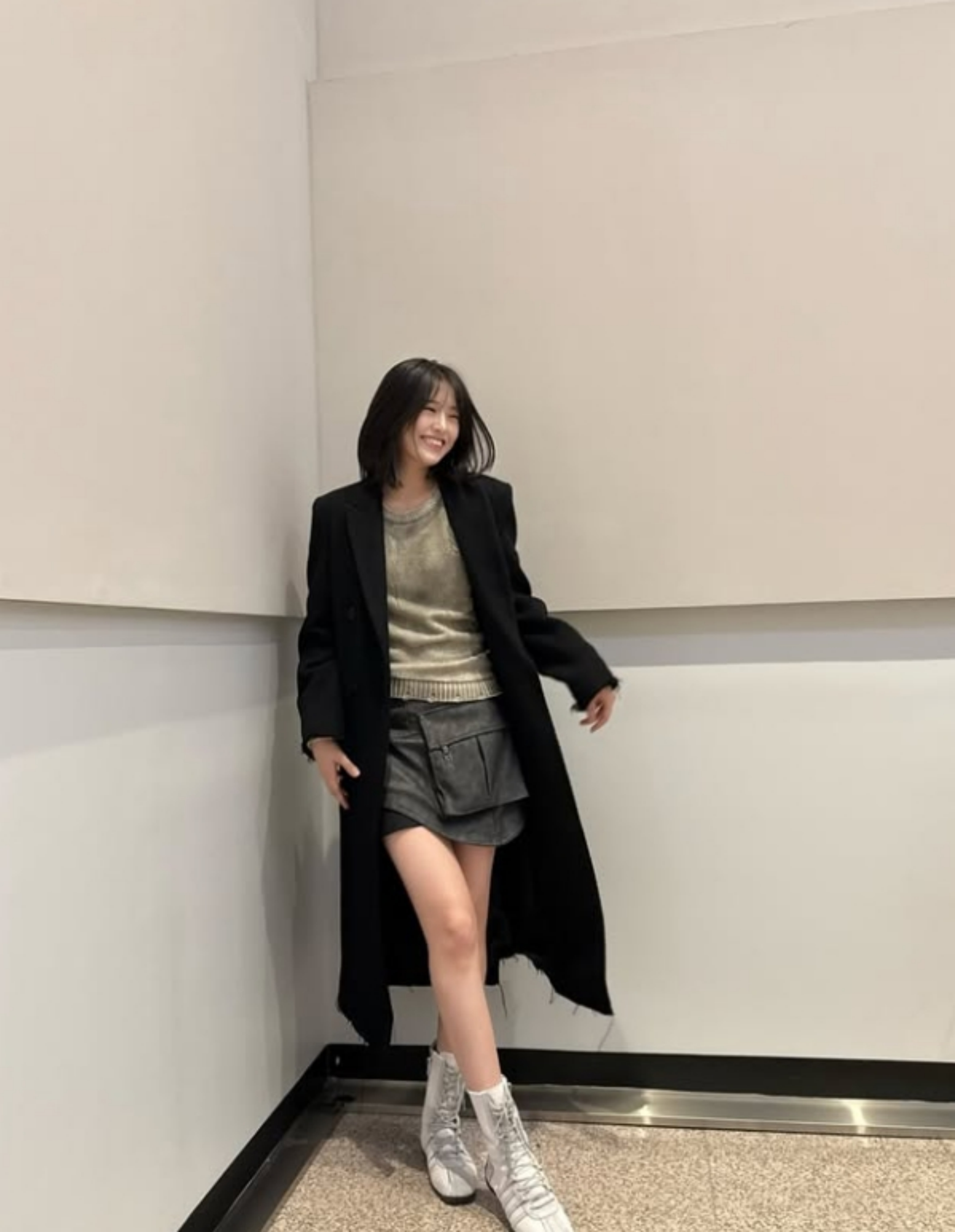 자신의 SNS에 공유한 이 사진은 크로스북의 느낌이 드는 백이 레이어드 된 다크 그레이 컬러의 미니스커트와 그레이 옐로우 색상의 니트, 그리고 검정색 롱코트를 착용해 원마일웨어를 완성했는데요.