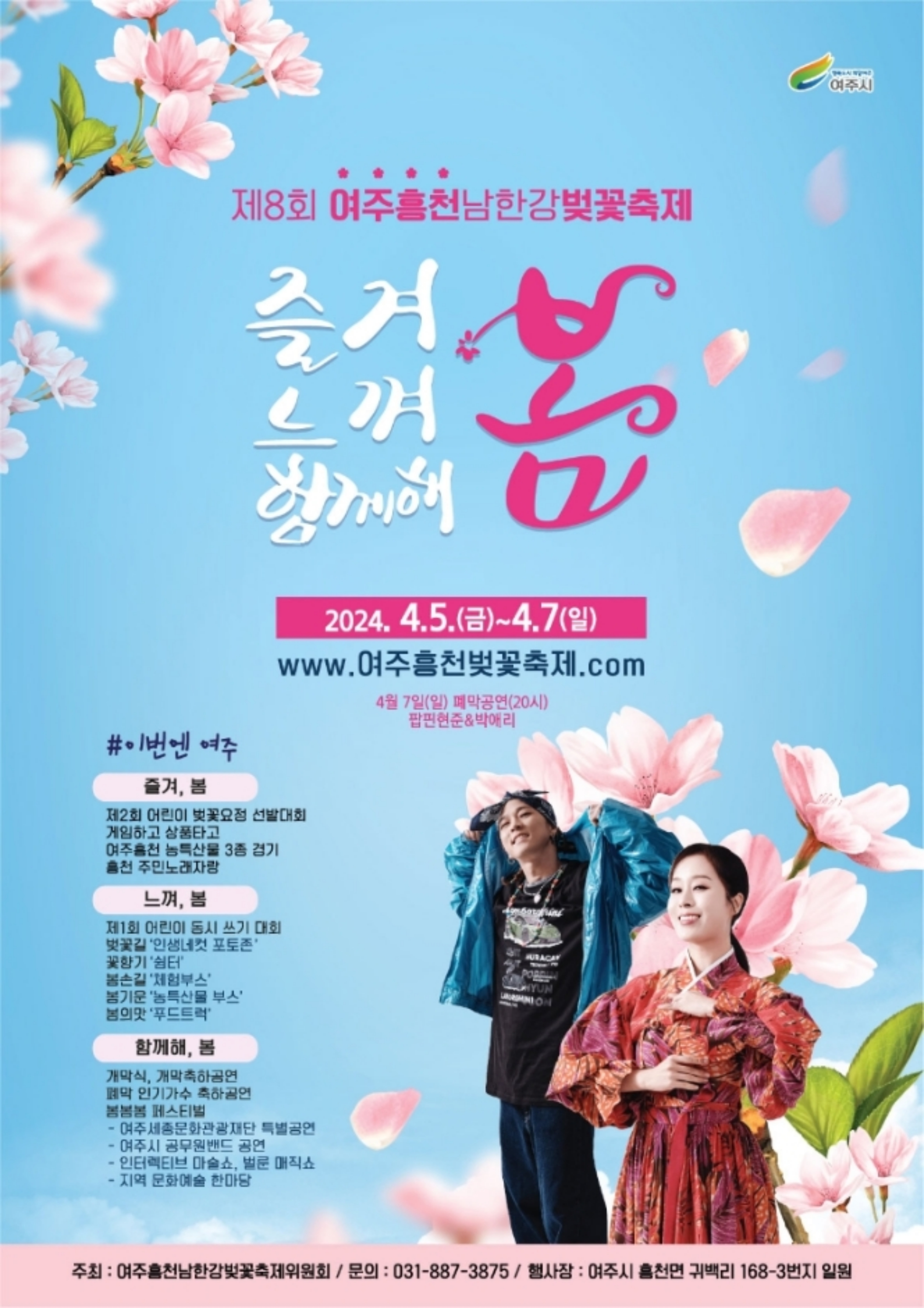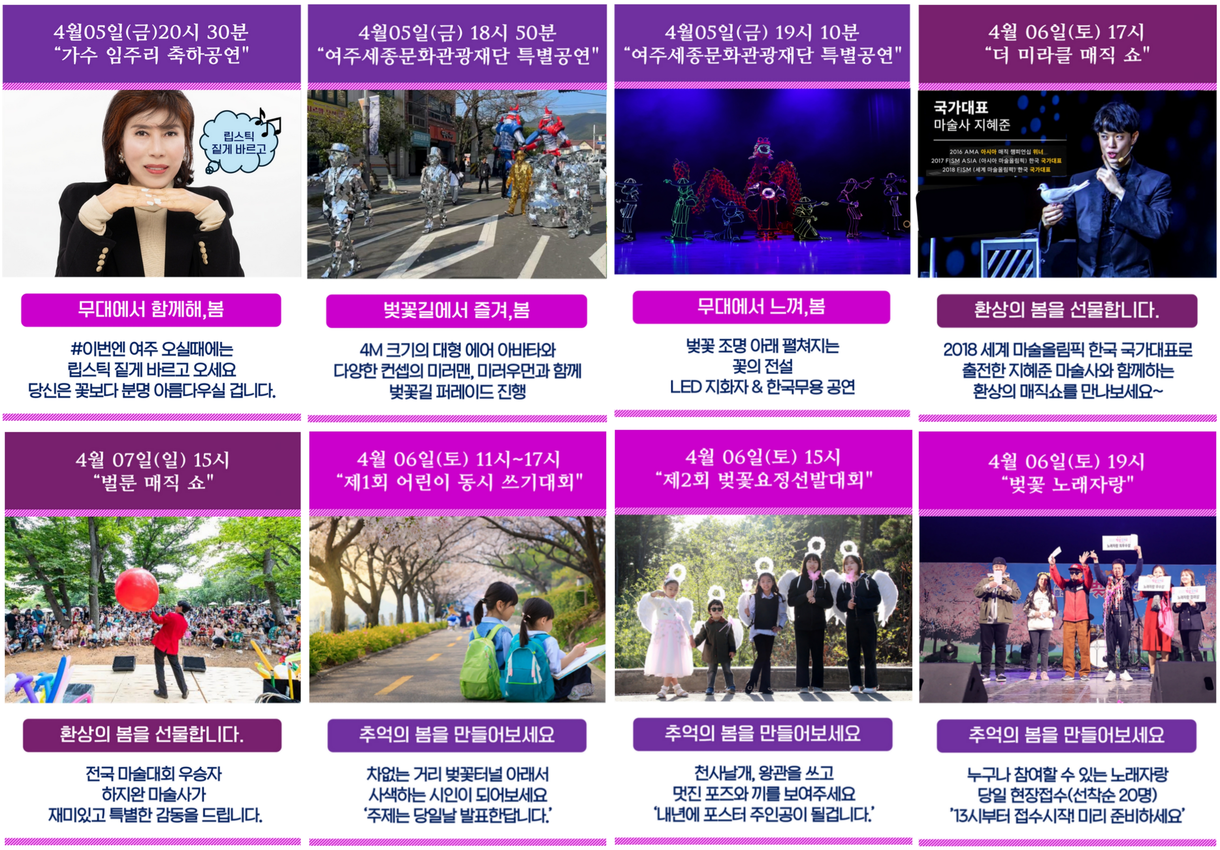 제1회 어린이 동시 쓰기 대회, 제2회 어린이 벚꽃요정 선발대회, 여주 흥천 농특산물 3종 경기 및 홍보 부스 운영, 인생네컷 포토존, 푸드트럭, 인터렉티브 마술쇼와 벌룬 매직쇼, 지역 문화예술 한마당, 여주세종 문화 관광 재단의 특별공연 등 다양한 프로그램이 준비되어 있는데요.