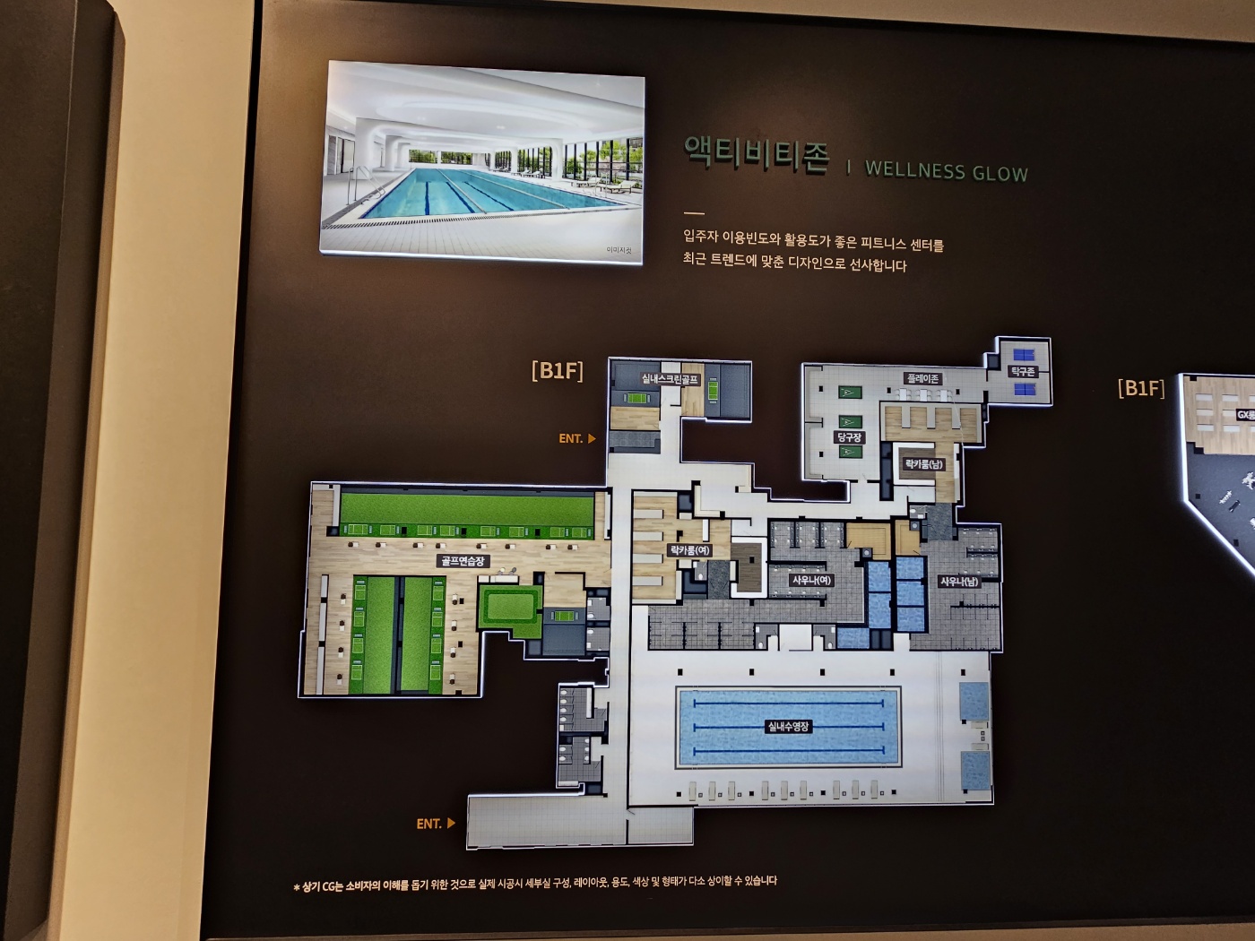 골프연습장 다른 곳과 질적, 규모적 수준차이가 느껴지실 거예요. 실내 수영장도 있고요. 당구장에 사우나 시설, 스크린 골프장 탁구존, 컨시어지와 경로당 시네마 룸과 , 도서관 등 품격과 프라이드를 높여줄 다양한 시설이 또 나의 주거 만족과 남들의 부러움까지 모두 선사할 것 같네요.