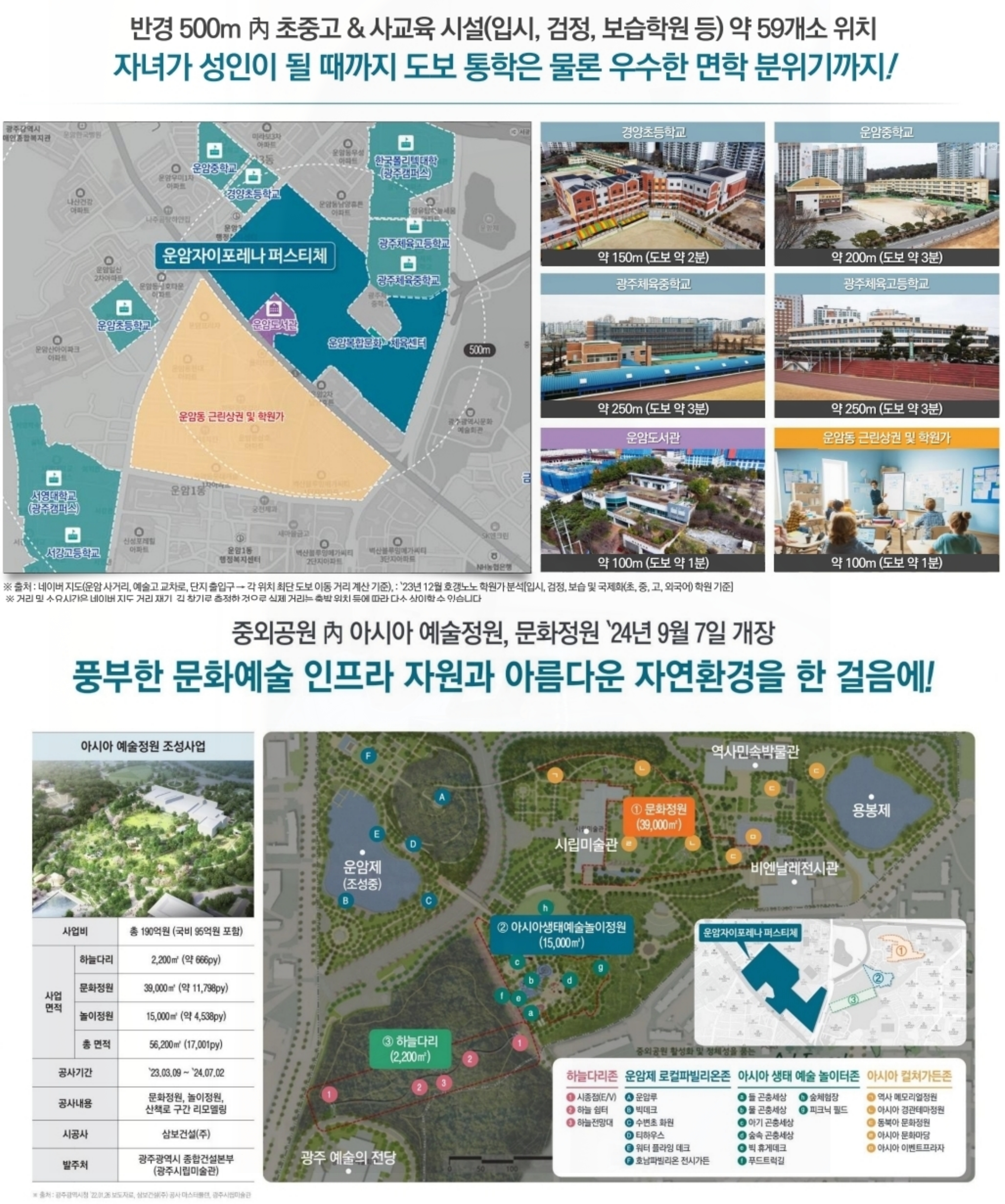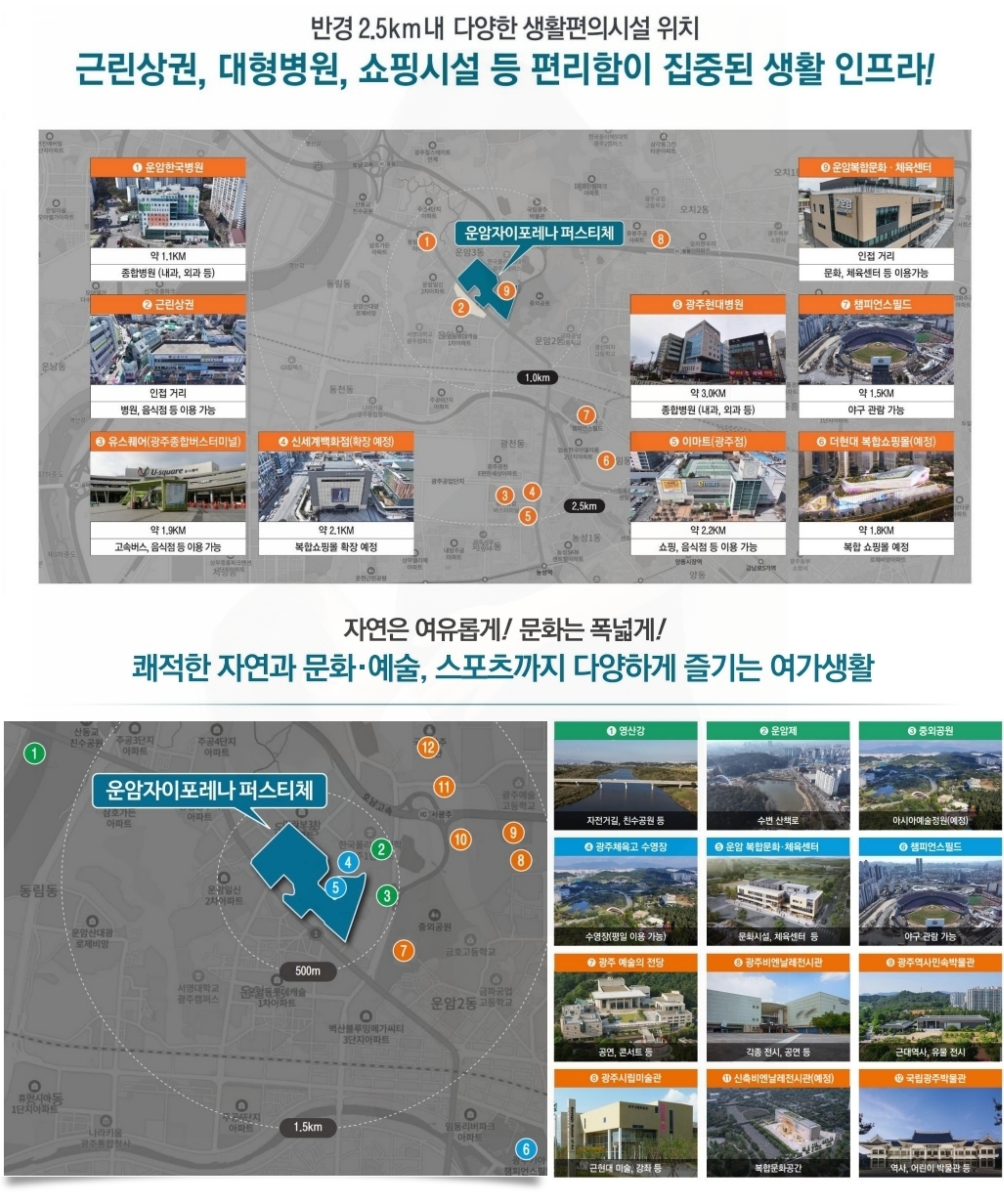 이밖에 광주 예술의 전당과 중와공원, 시립 미술관과 민속 박물관, 한국폴리텍대학교도 인근에 자리하고 있으며, 북광주 세무서 예정소식과 서영대 광주 캠퍼스 운암시장 등 크고 작은 여러 상권과 다양한 인프라가 이곳에 더욱 살고 싶은 여러 가지 아드레날린을 분출하는 것 같습니다.