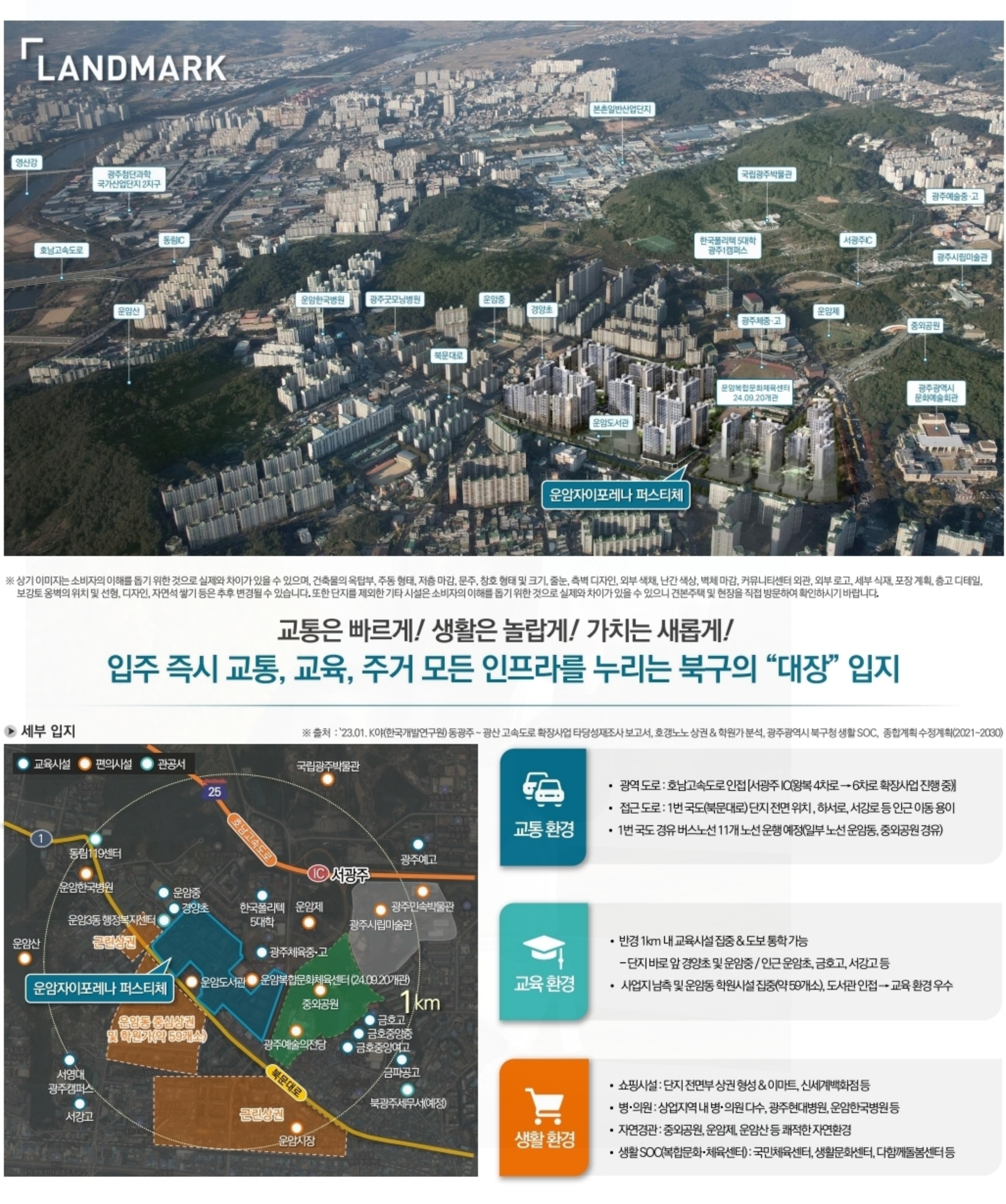 이밖에 광주 예술의 전당과 중와공원, 시립 미술관과 민속 박물관, 한국폴리텍대학교도 인근에 자리하고 있으며, 북광주 세무서 예정소식과 서영대 광주 캠퍼스 운암시장 등 크고 작은 여러 상권과 다양한 인프라가 이곳에 더욱 살고 싶은 여러 가지 아드레날린을 분출하는 것 같습니다.