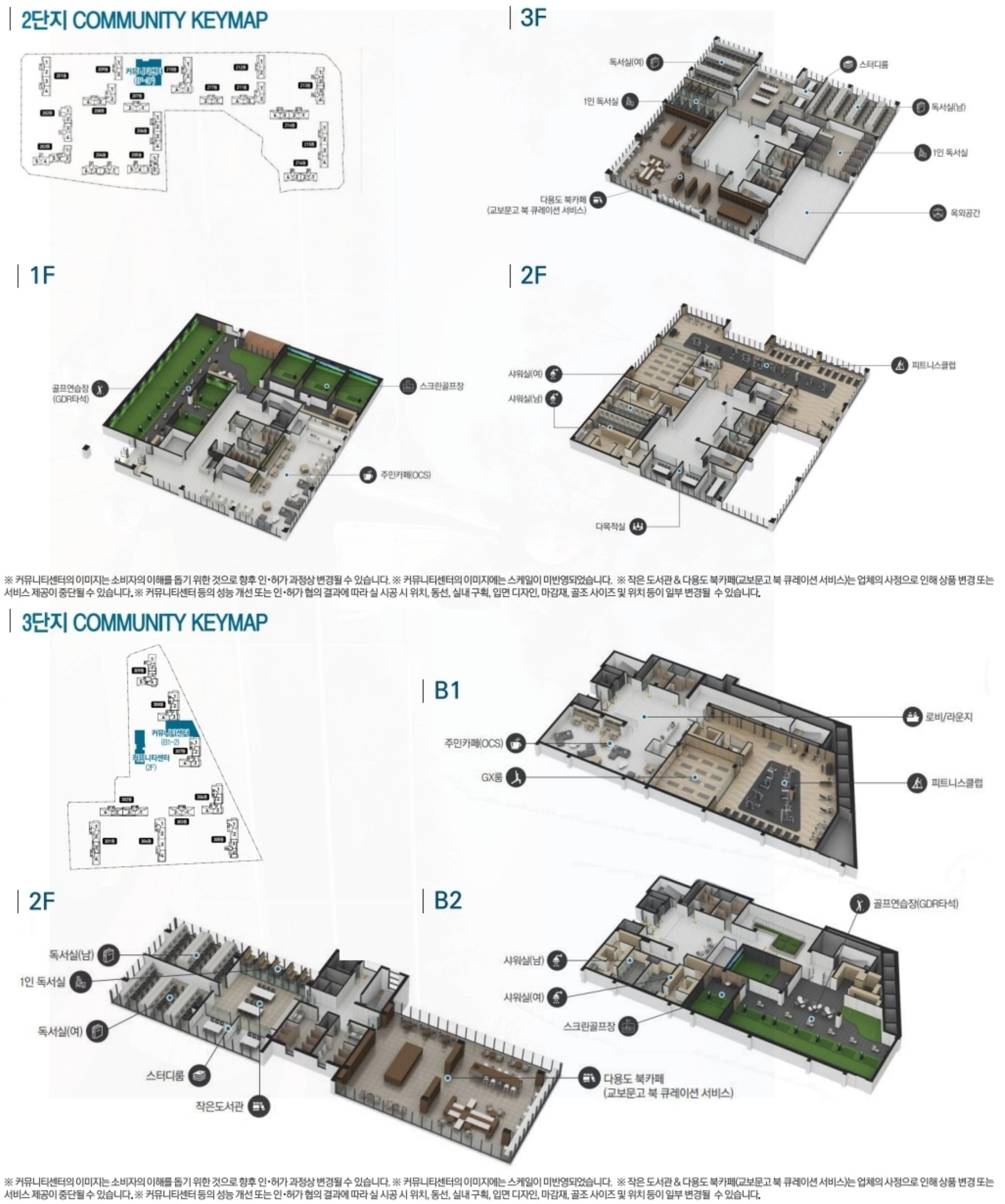 또한 위에 보시는 것처럼커뮤니티 시설도 다채롭게 조성이 되는데요. 단지별로 사진에서 한번 어떤 구성을 이루고 있는지 확인해 보시길 바랍니다.
