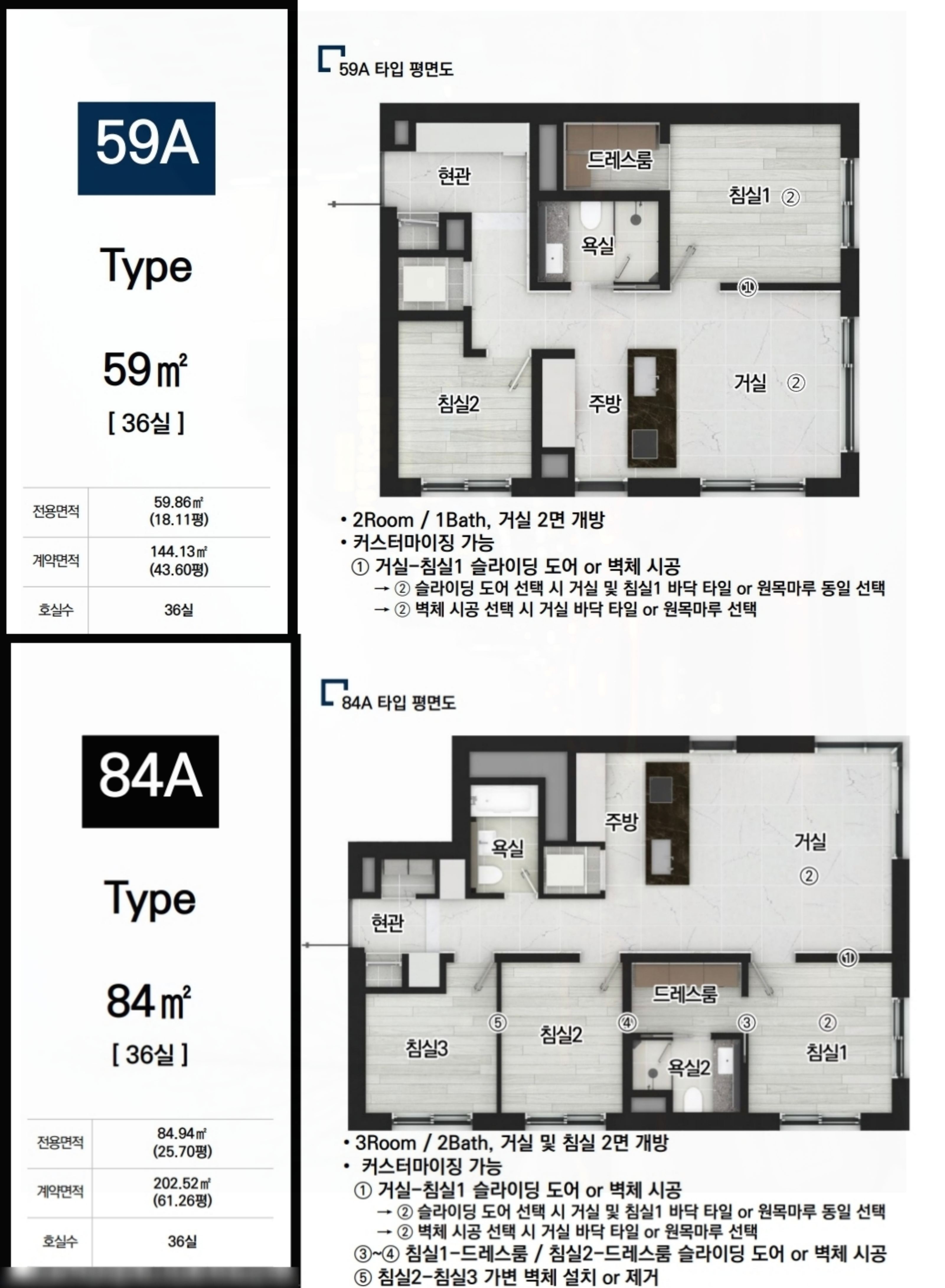 59㎡는 두룸 구조로 거실 이면 개방형으로 설계되어 넓은 조망권과 쾌적성을 높여 1~2인 가구들이 매우 흡족해하실 것 것 같습니다.