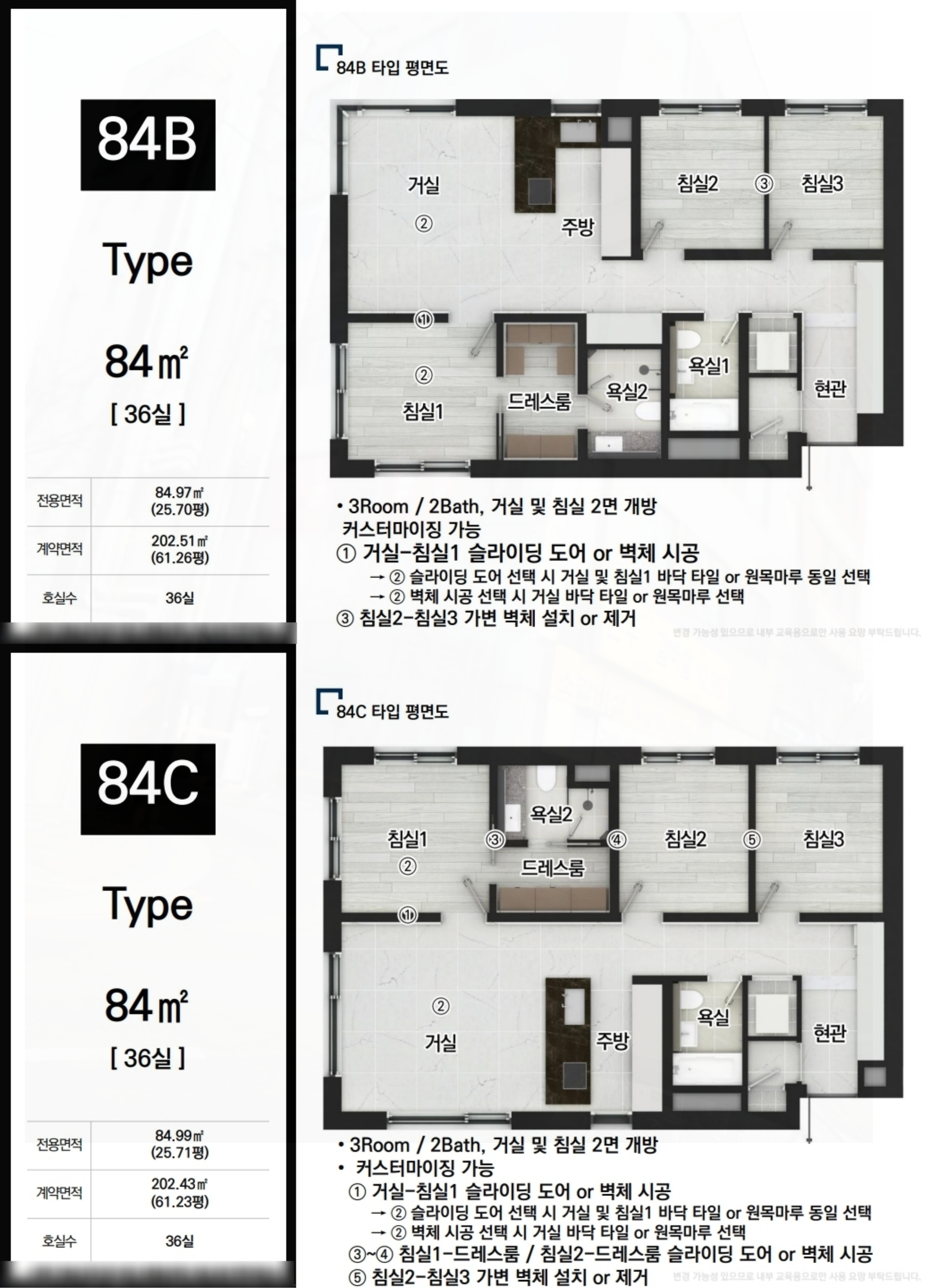 특히, 국민 면적으로 불리는 84㎡는 A, B, C형으로 나뉘어 다양한 평면 설계를 반영하여 선택의 폭을 넓혔습니다.