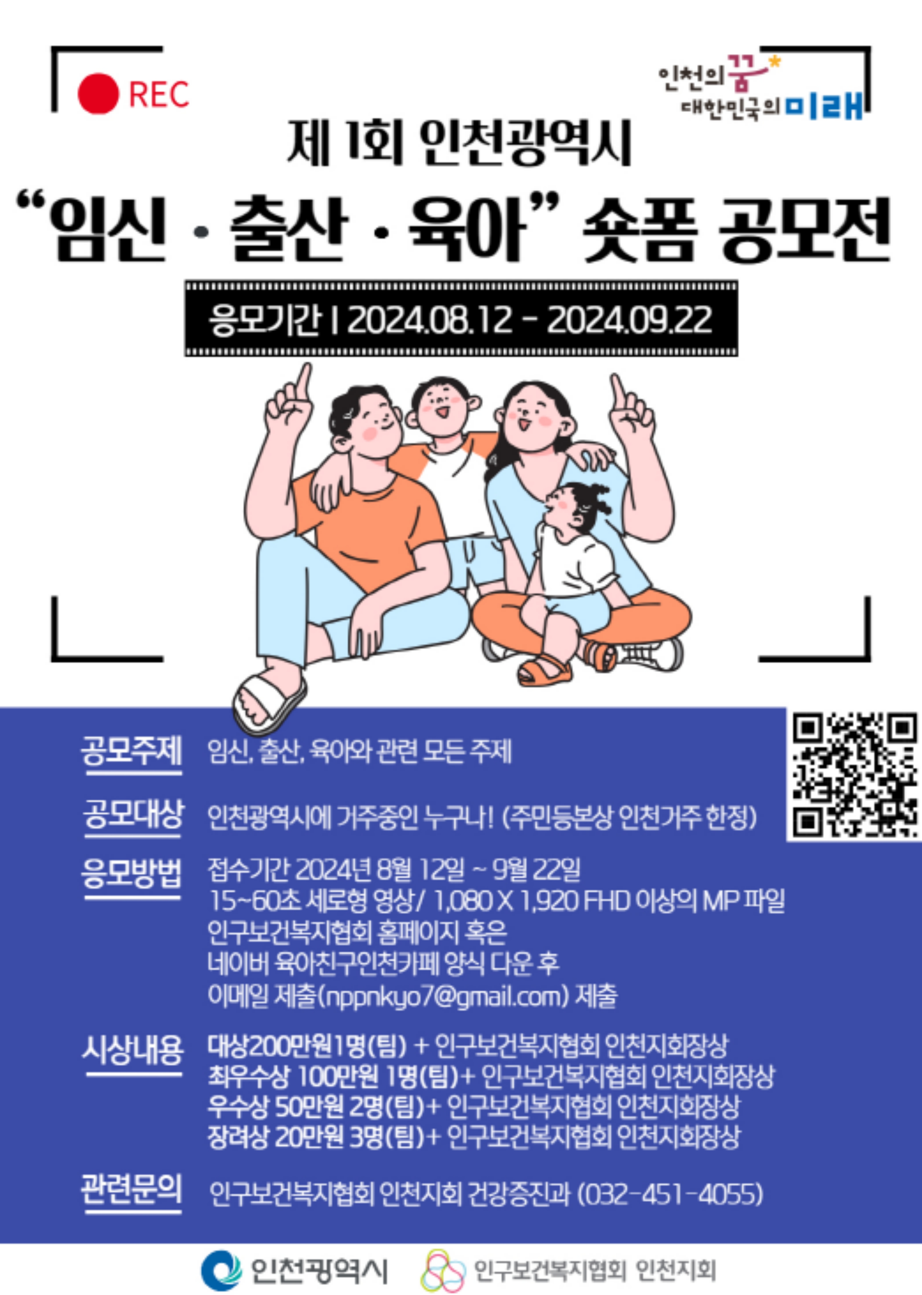 인천광역시와 인구보건복지협회가 올해 처음으로 임신·출산·육아 숏폼 공모전을 개최한다고 밝혔다.